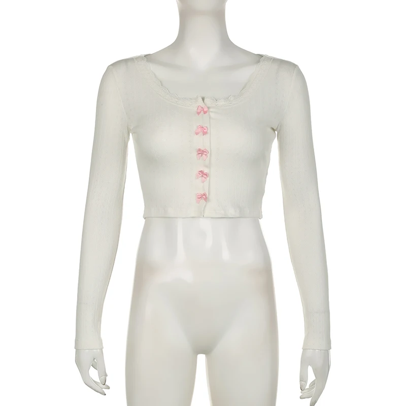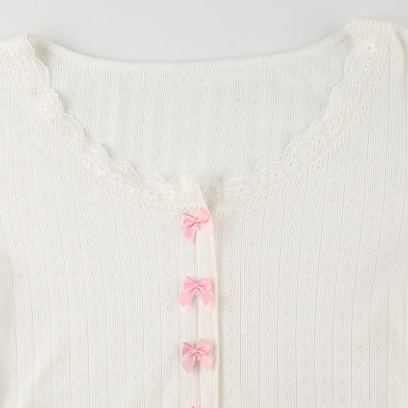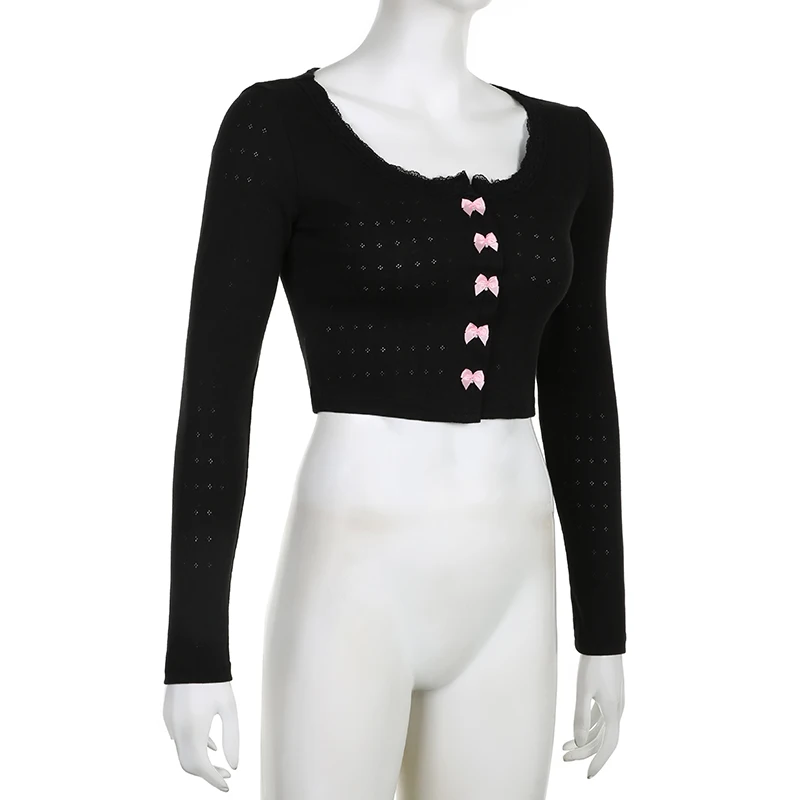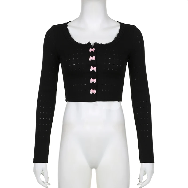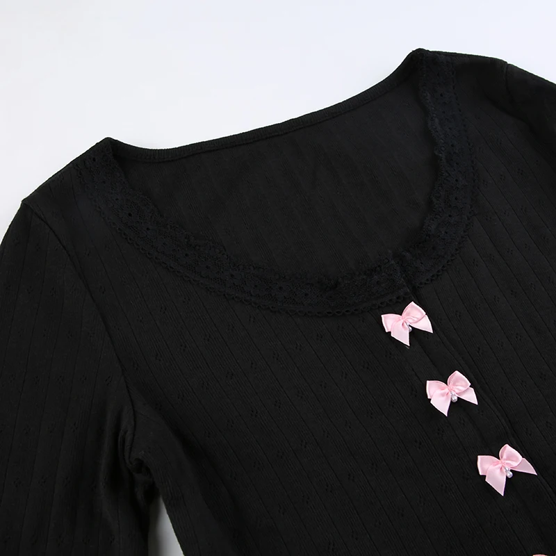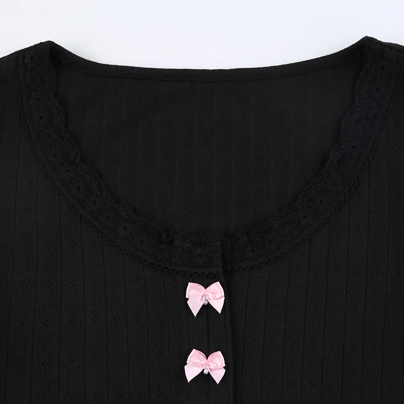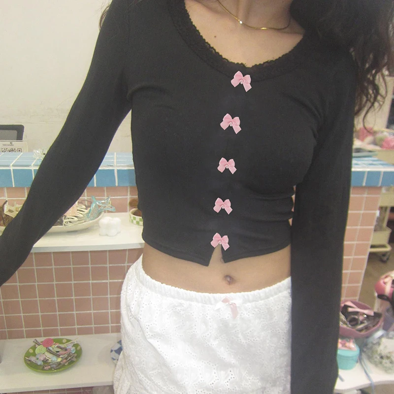 Sweet Chic Bow Spring Autumn Tees Women Lace Trim Slim Basic Cute T shirt Coquette Clothes Korean Cropped Top Knitted