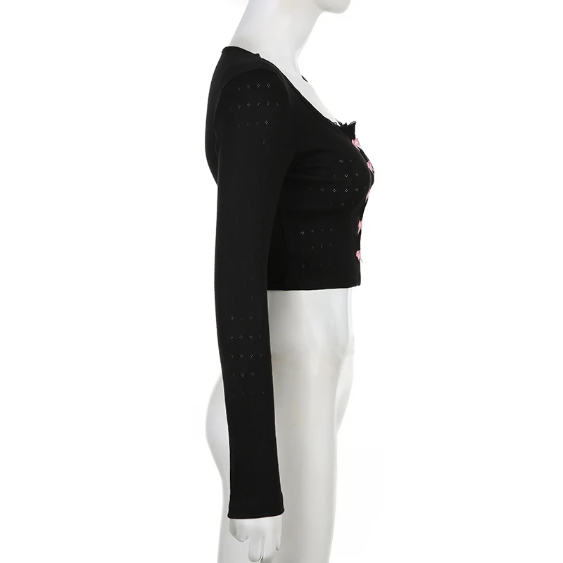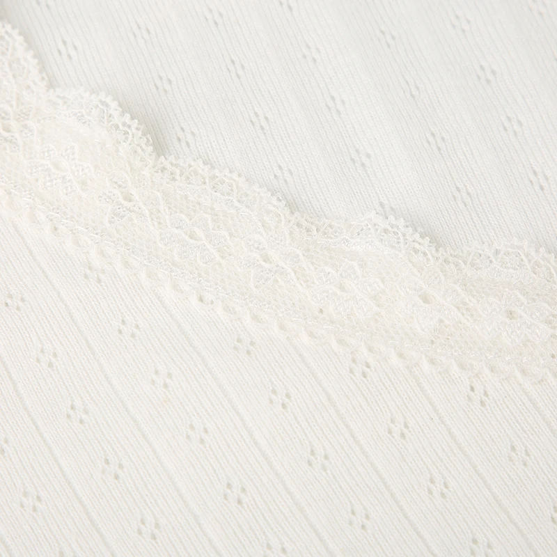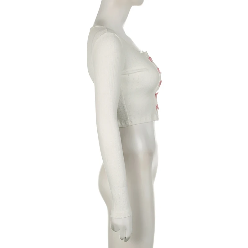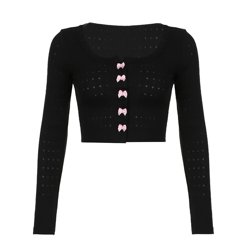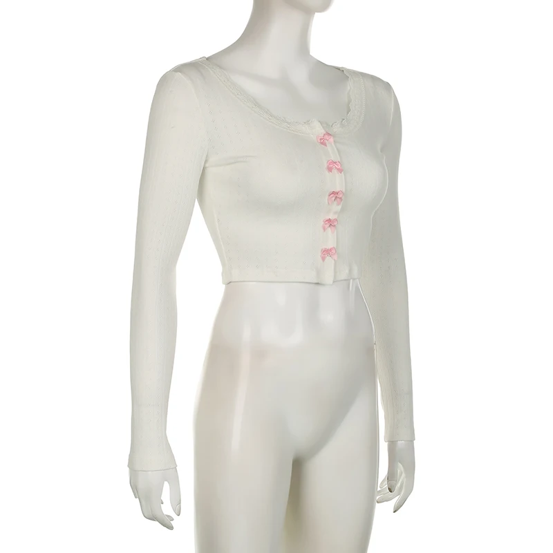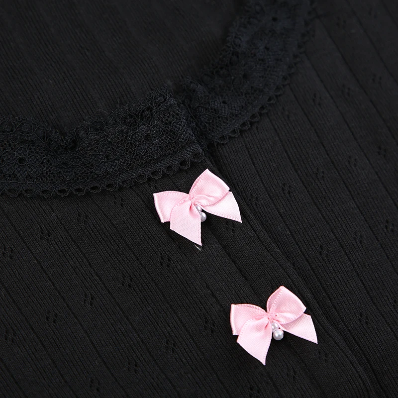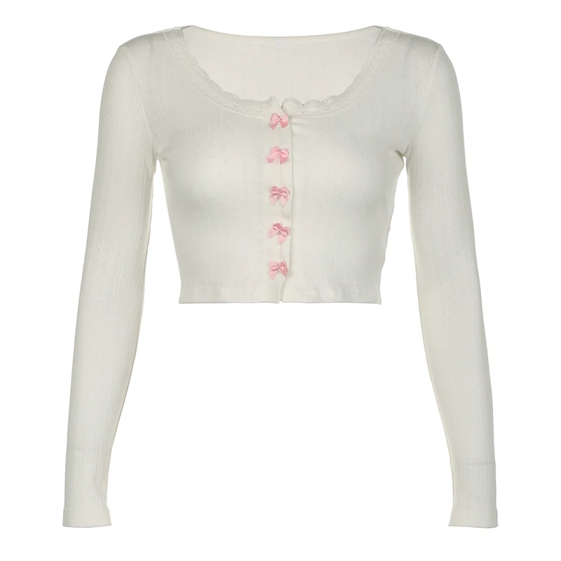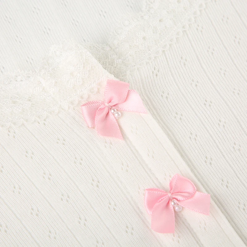 Sweet Chic Bow Spring Autumn Tees Women Lace Trim Slim Basic Cute T shirt Coquette Clothes Korean Cropped Top Knitted