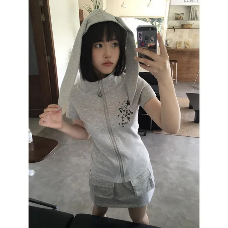 Sweet Shirts for Women Hooded Zipper Tshirts Short Sleeve Tunic Summer Tees 2023 Ropa Mujer Casual Solid Color T Shirt Y2k Tops
