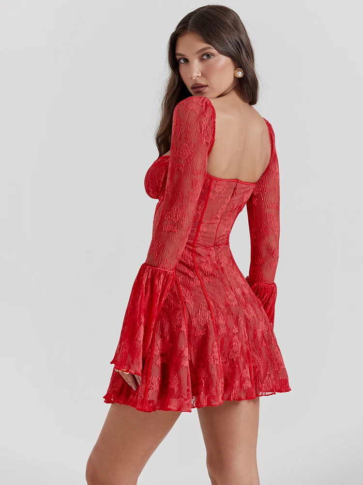 Temperament Christmas Red Long Sleeved Dress Women Lace Patchwork Ruffled Edge Mini Dress Female Bodycon Party Evening