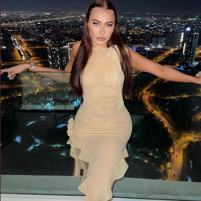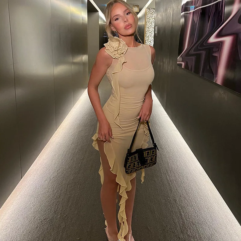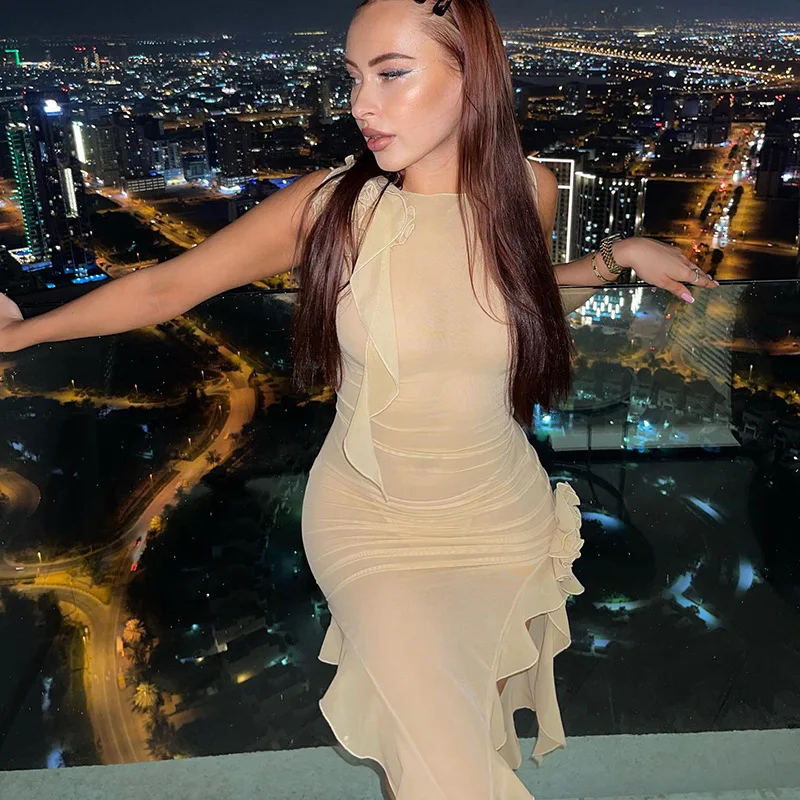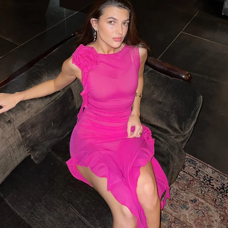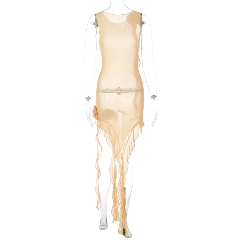 Tulle Flower Asymmetrical RUFFLES O-Neck Tank Mini Dress Women Mesh See Through Sexy Wrap Dress Elegant Slim Partywear