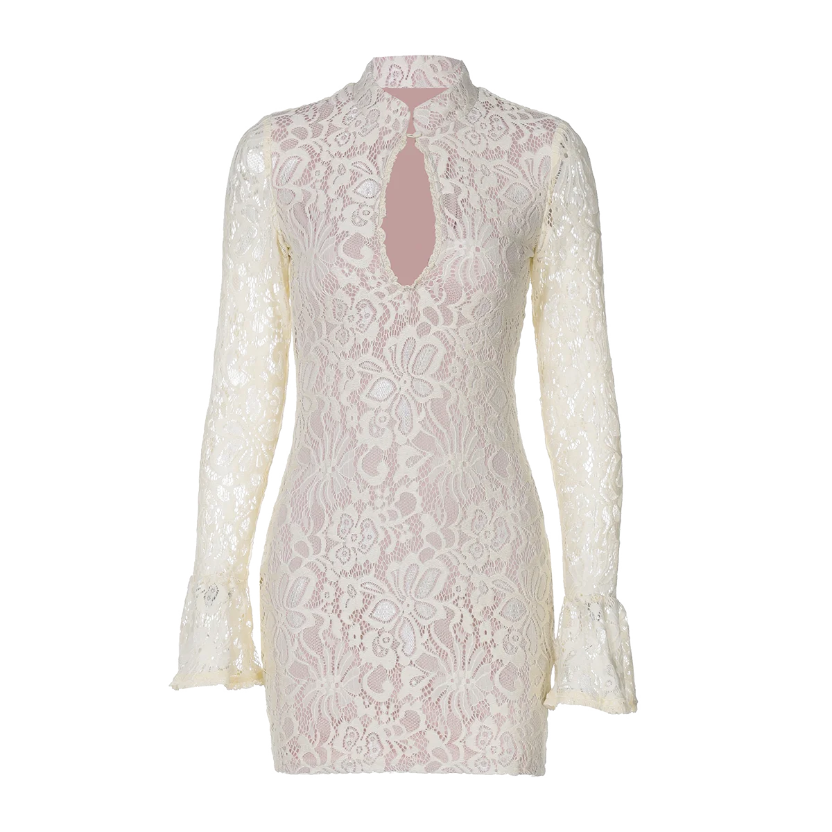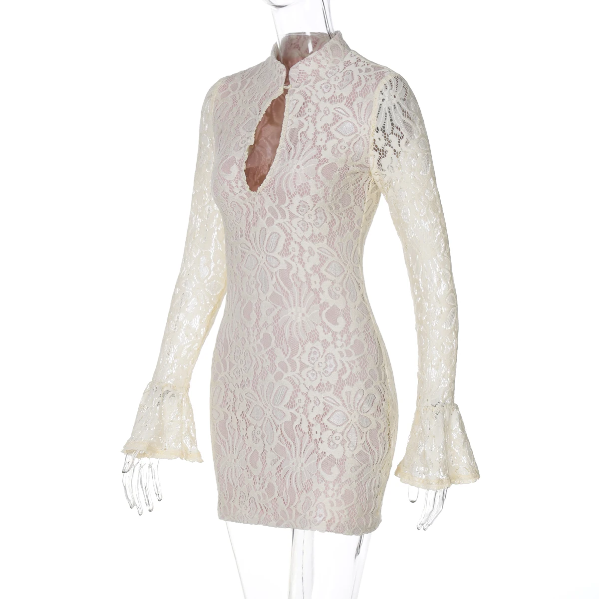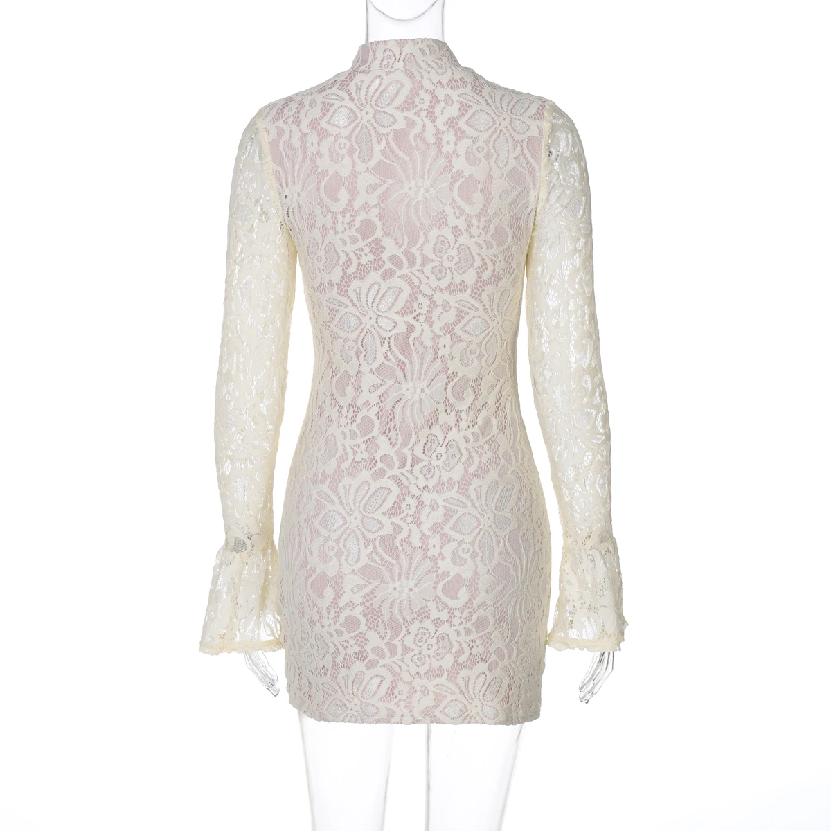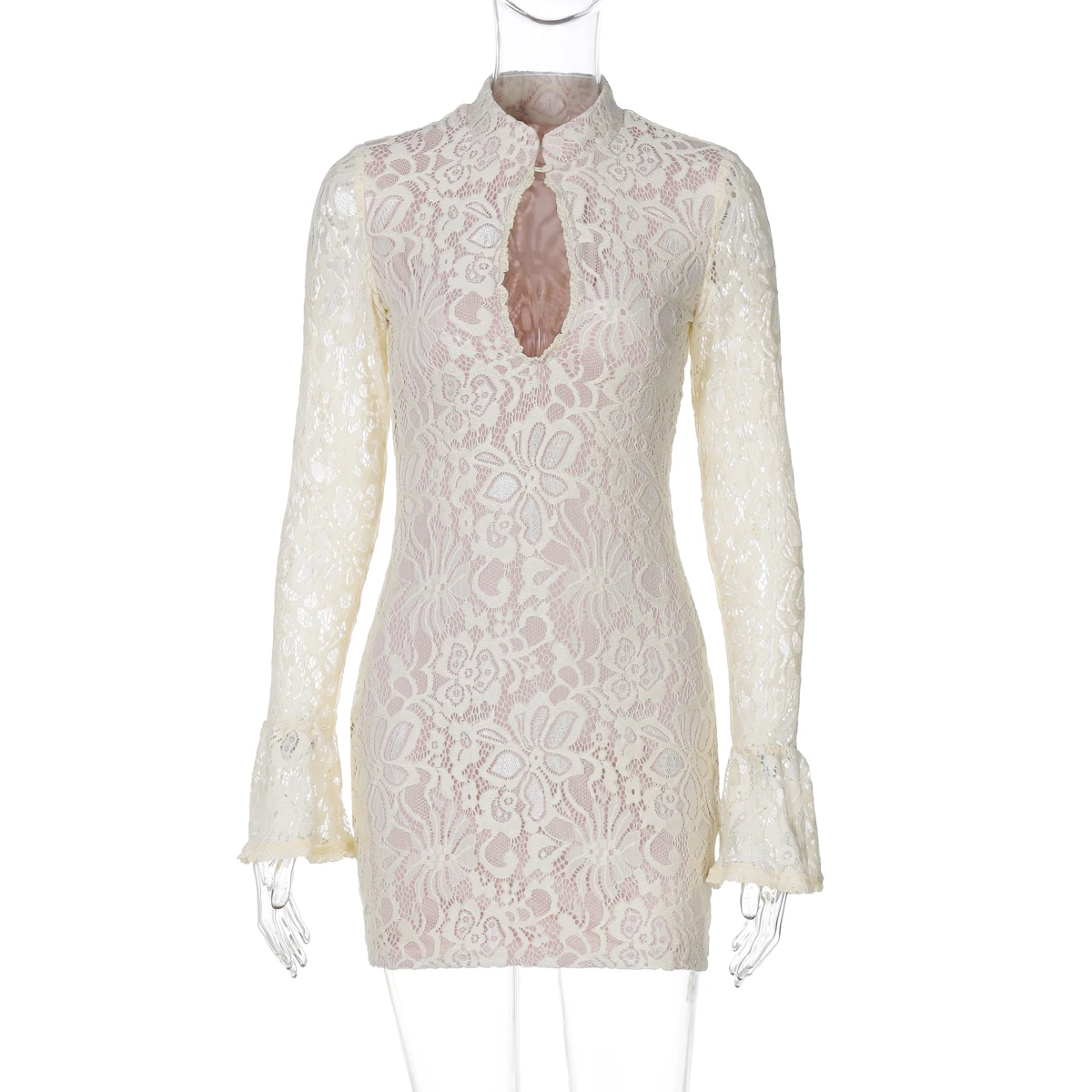 Turtleneck Long Flare Sleeve Patchwork Lace Hole Button Sexy Mini Dress Spring Women Fashion Clothes Club Festival