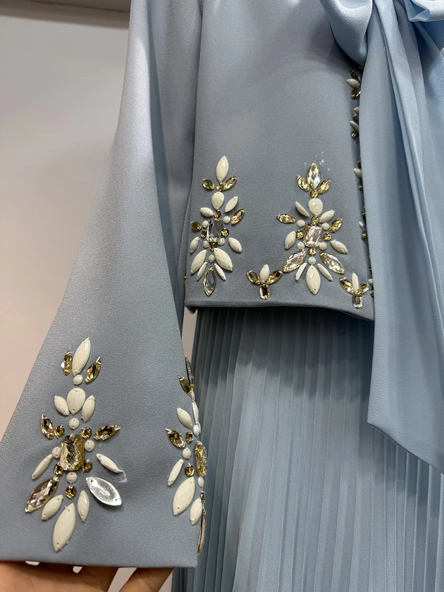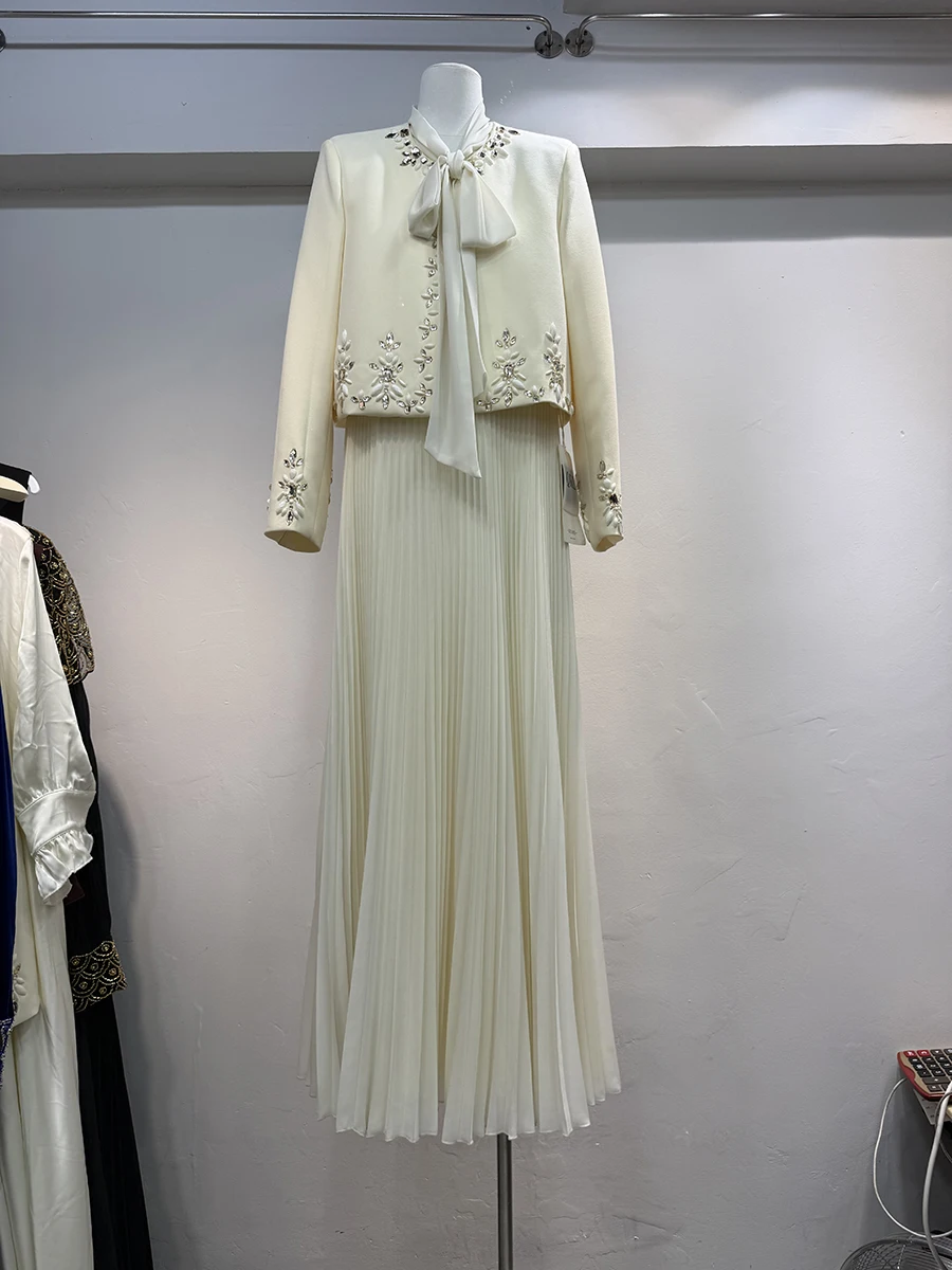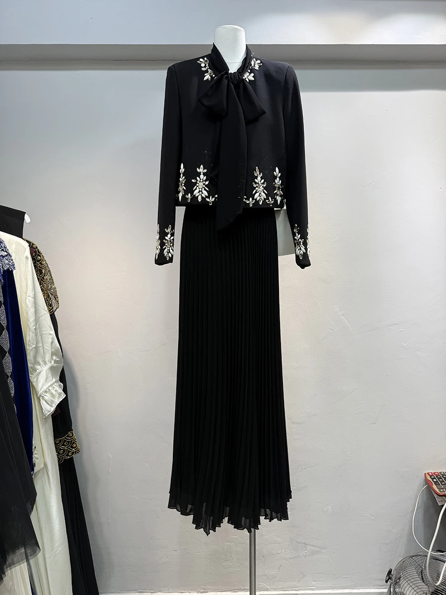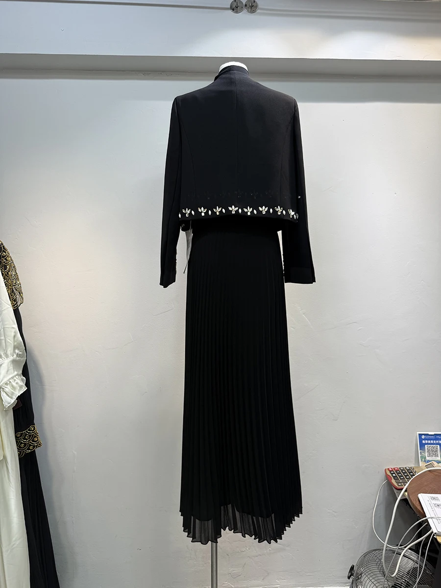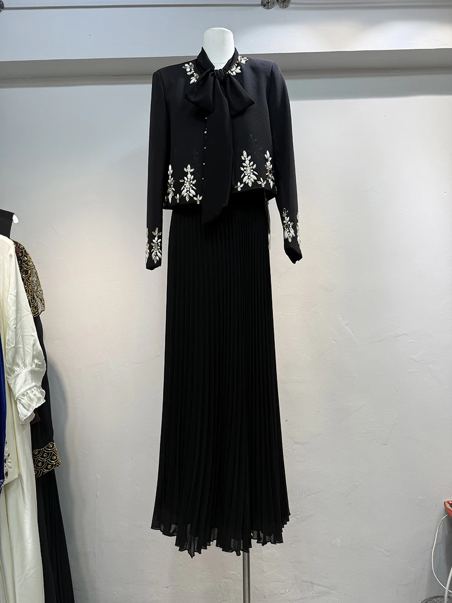 Two Piece Set For Women O Neck Long Sleeve Spliced Diamonds Coat Lace Up Sleeveless High Waist Dress Sets Female