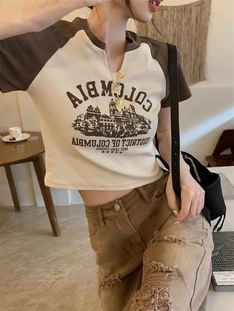 Vintage Printed T-Shirts Women Slim V-Neck Crop Top Y2k Aesthetic Short Sleeve Streetwear Grunge Tee Korean Version Pullovers