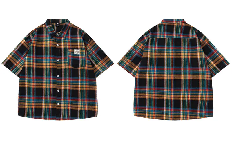 Vintage Summer Shirts Y2K Streetwear Rainbow Plaid Button Up Short Sleeve Blouse Hip Hop Harajuku Casual Baggy Cotton Shirt Tops