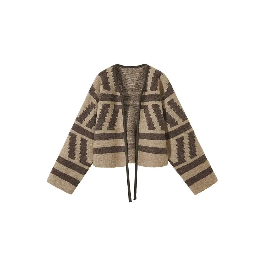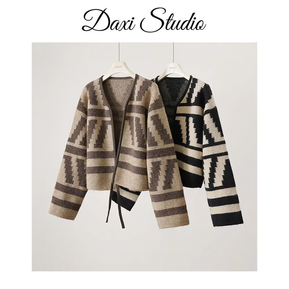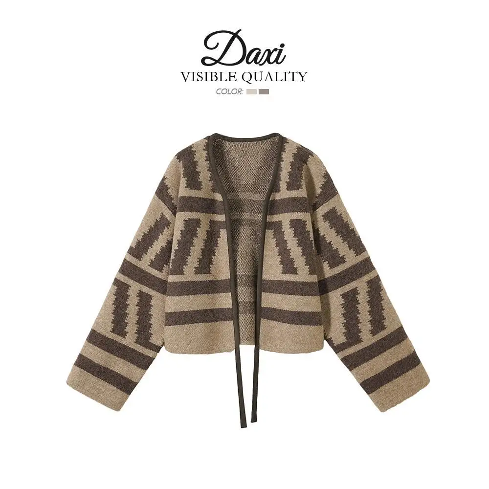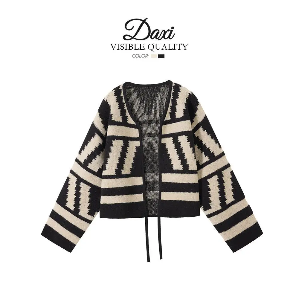 Vintage Women Black Brown Patchwork Short Knitted Lace-up Cardigan Loose Sweater 2024 Autumn Winter V Neck Long Sleeve Tops Chic