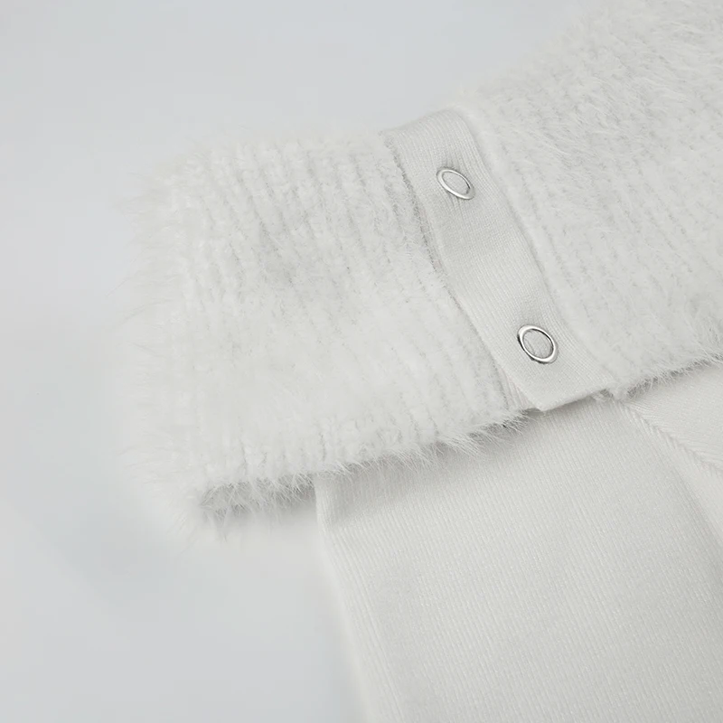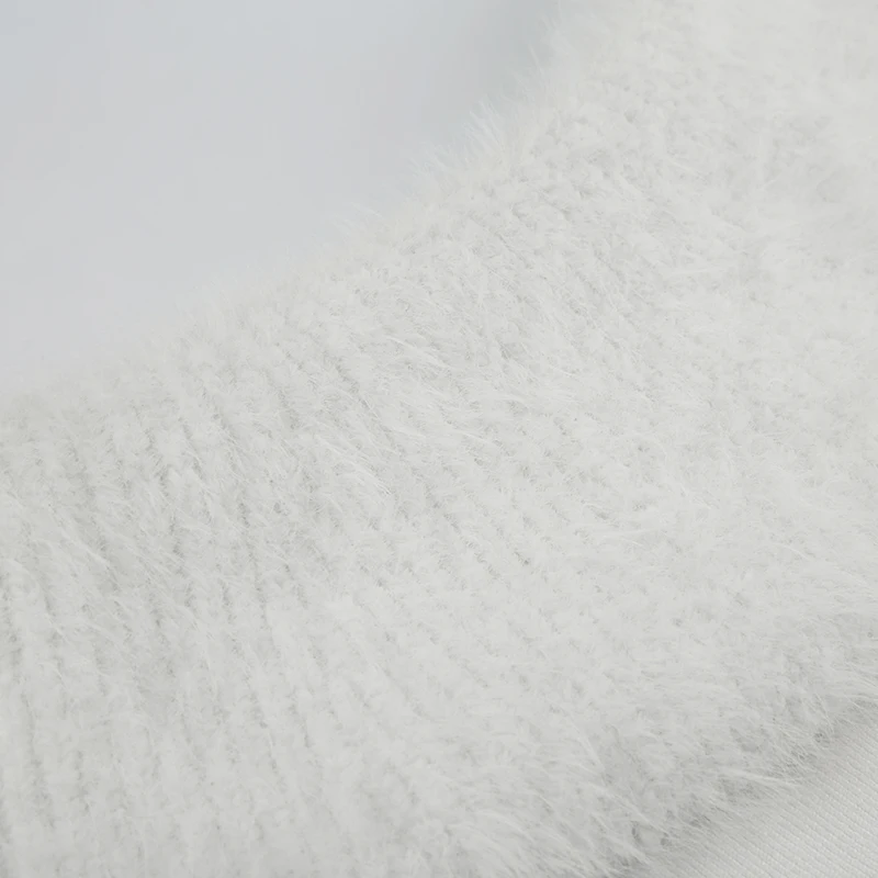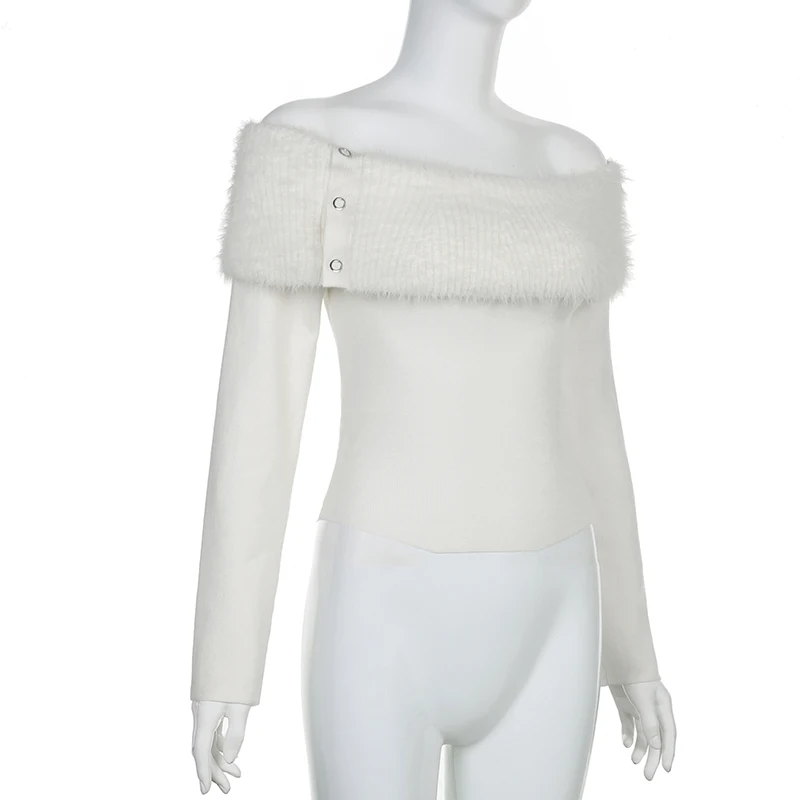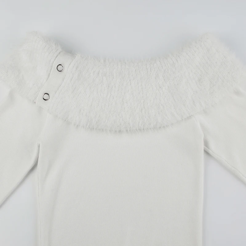 White Chic Fluffy Autumn Pullover Off Shoulder Top Fashion Women Sweaters Faux Fur Spliced Knitted Jumper Party