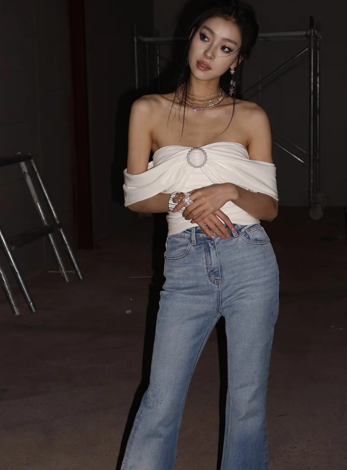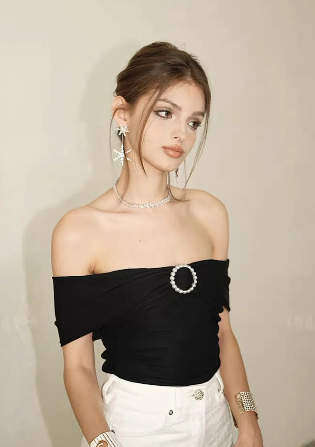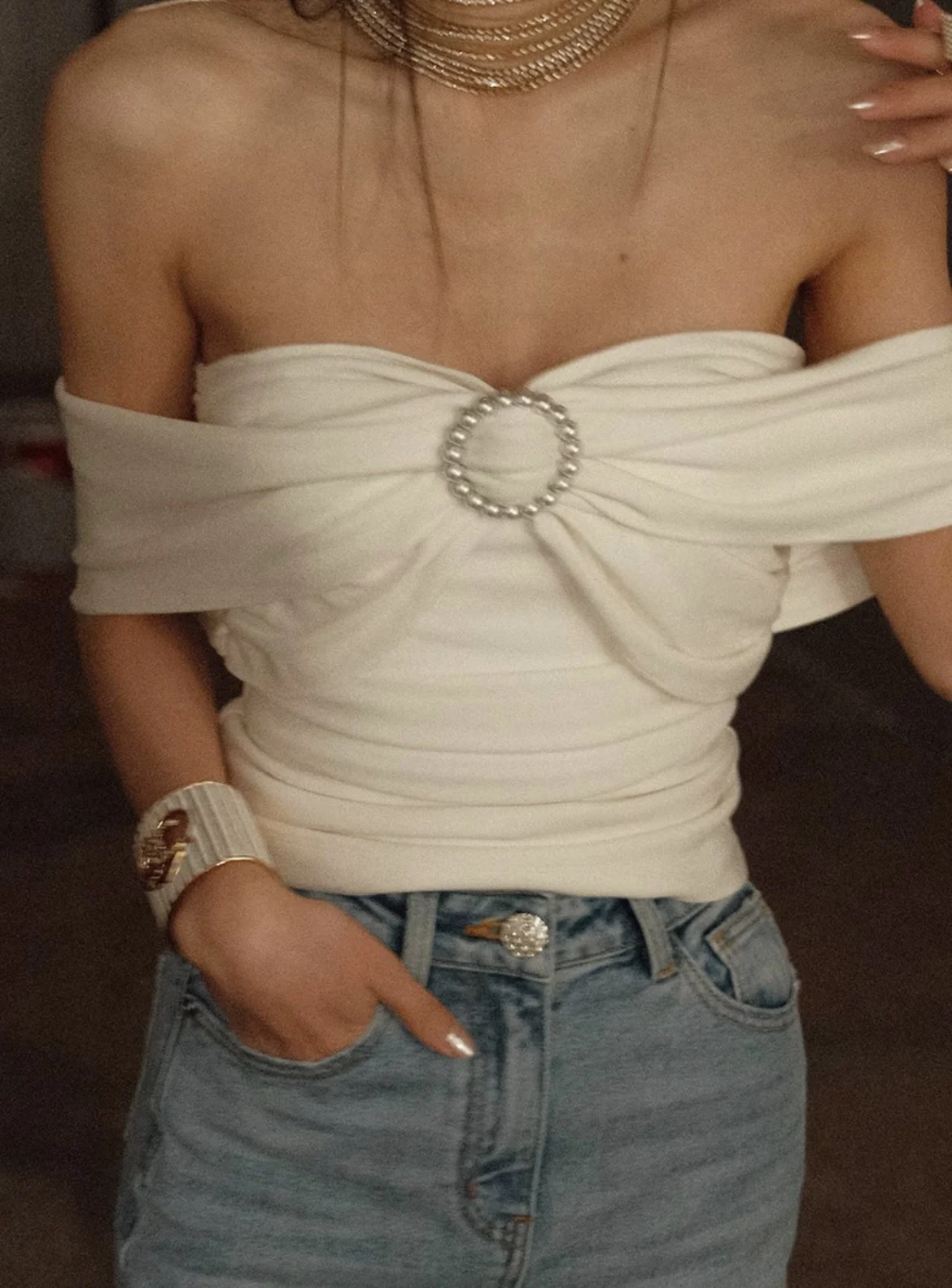 White Elegant Y2k Off Shoulder Pearl Cropped Top Women Black Sleeveless Backless Sexy Club Strapless 2024 Summer Pleated Tops
