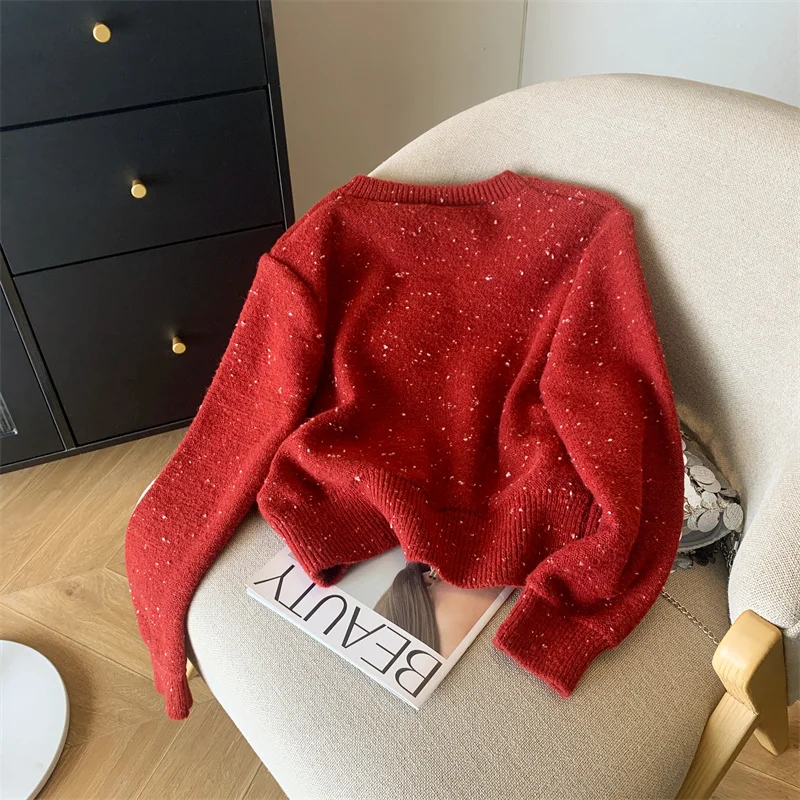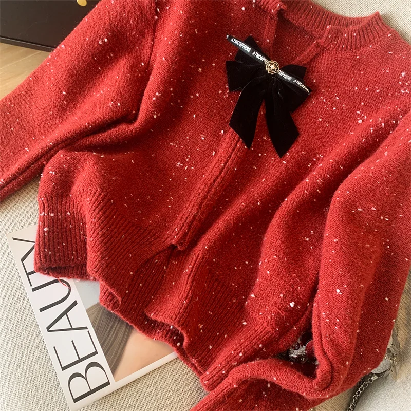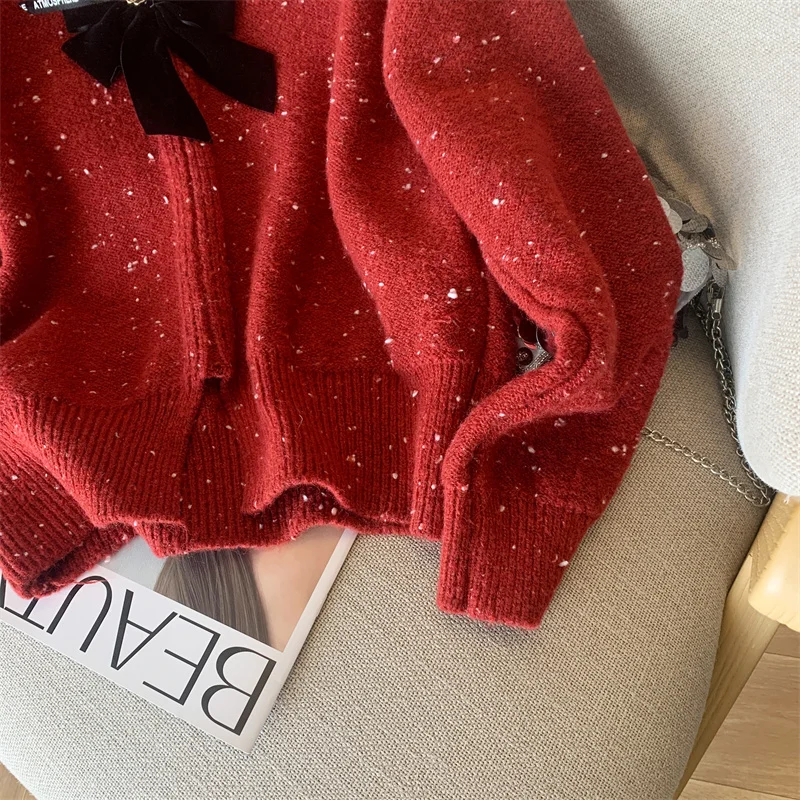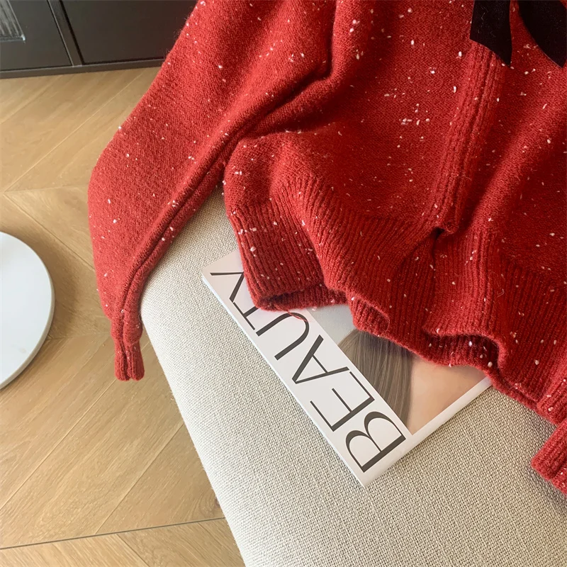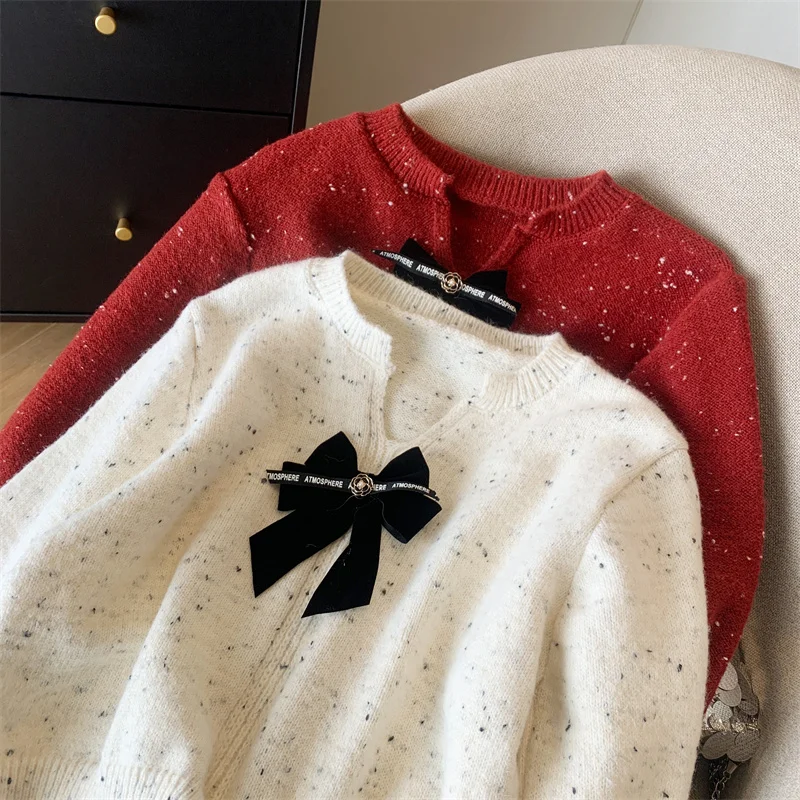 White Long Sleeve Knitted Women Bright Silk Bow Sweater Red V-neck Office Lady Button Casual Pullover Top Autumn Winter