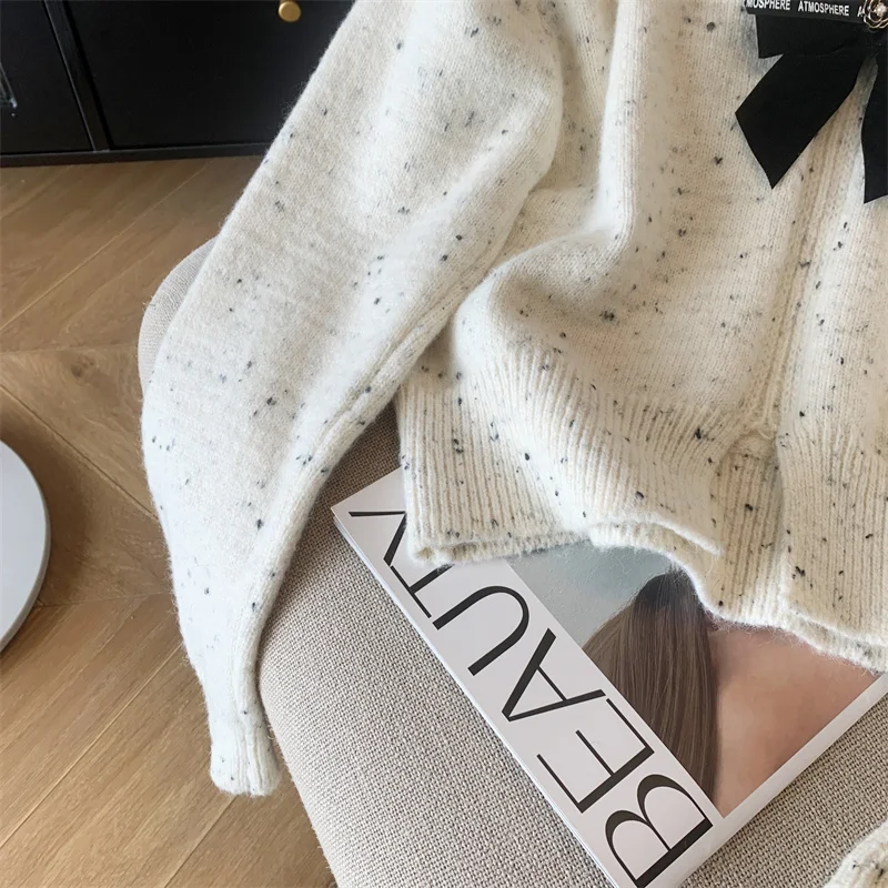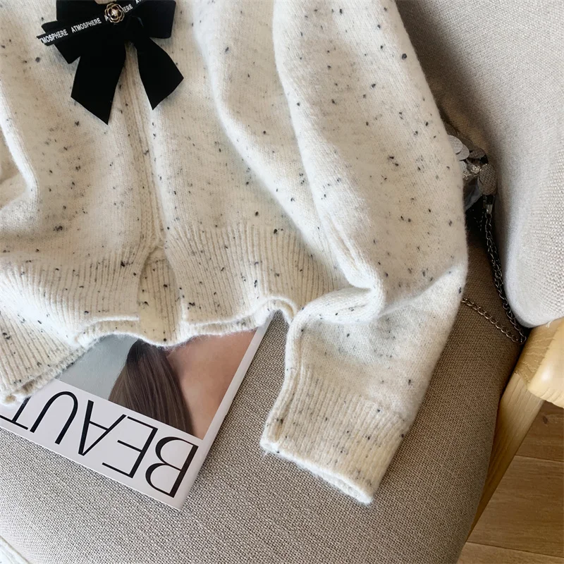Load image into Gallery viewer, White Long Sleeve Knitted Women Bright Silk Bow Sweater Red V-neck Office Lady Button Casual Pullover Top Autumn Winter