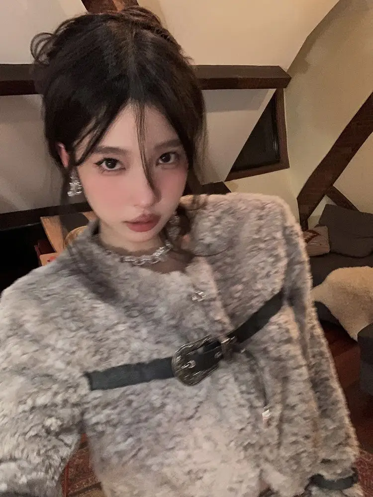 Winter Clothes Women Gray Lamb Wool Jacket 2024 Ropa Mujer Stand Neck Fashion Korean Outwear Y2k Tops Furry Thicked Warm Coat