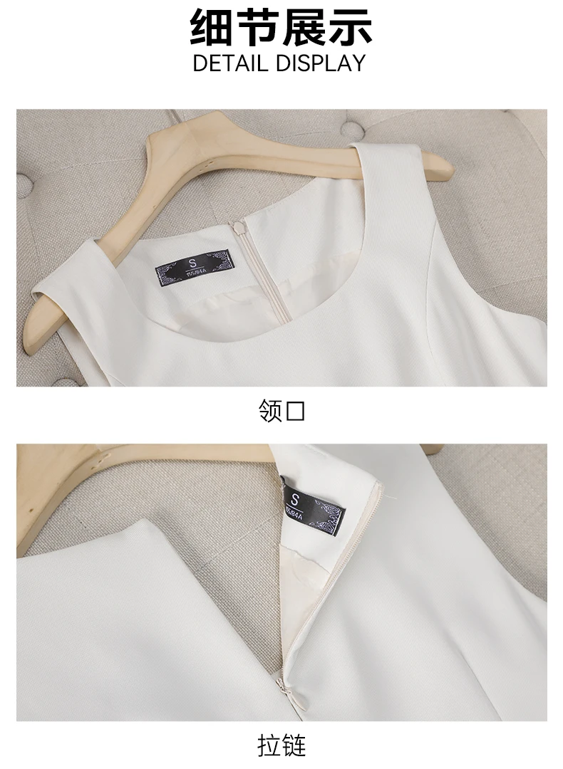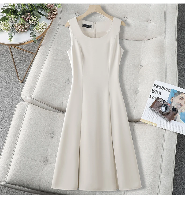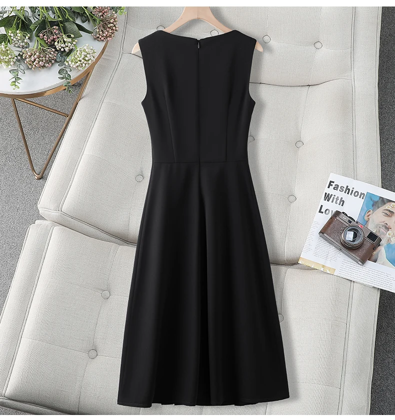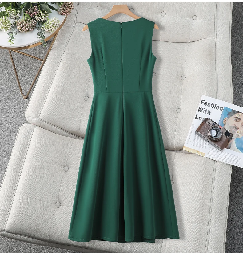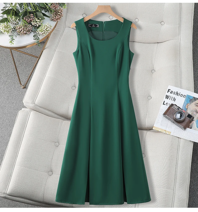 Woman Summer Black Beige Elegant Sleeveless Office Long Dresses Green Round Neck Sexy Zipper Pleated Vest Dress Vestidos Fashion