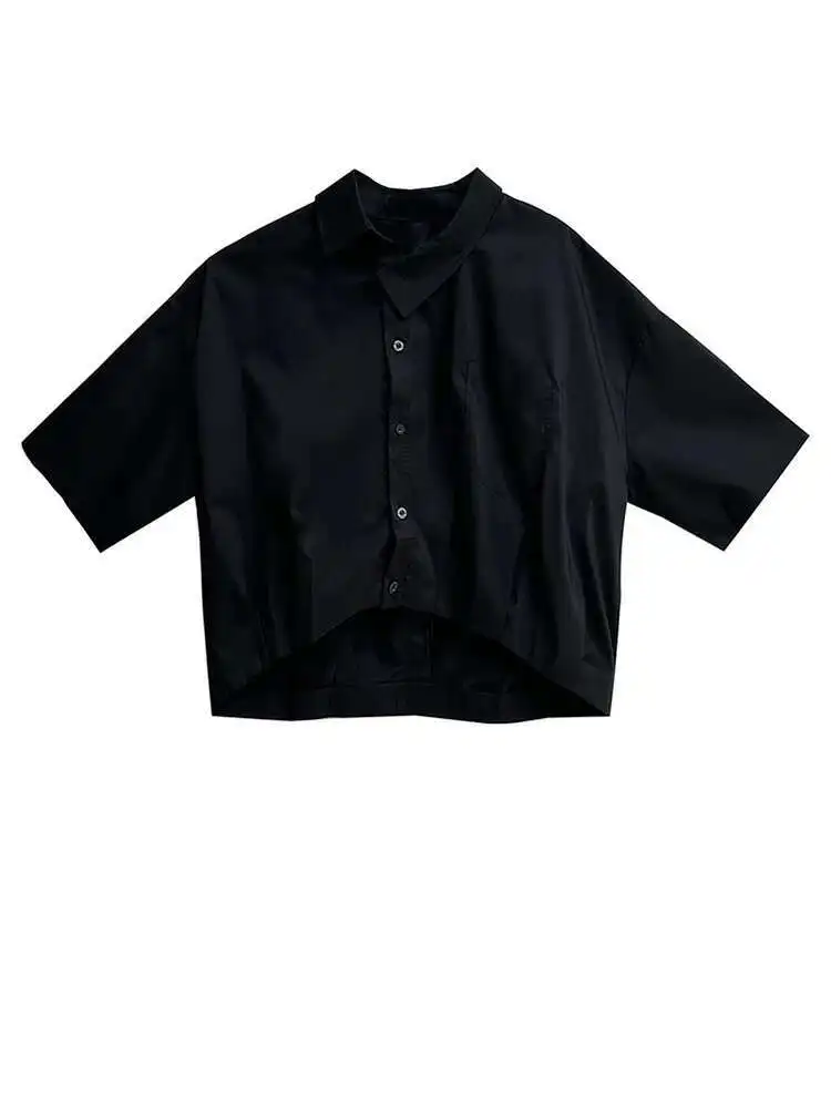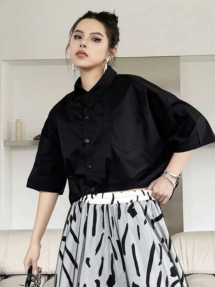 Women Black Brief Big Size Short Casual Blouse New Lapel Half Sleeve Shirt Fashion Tide Spring Summer 2025 1DH5843