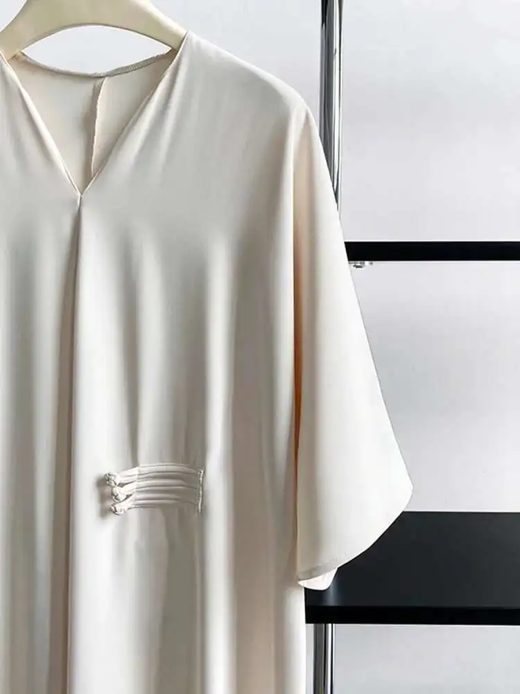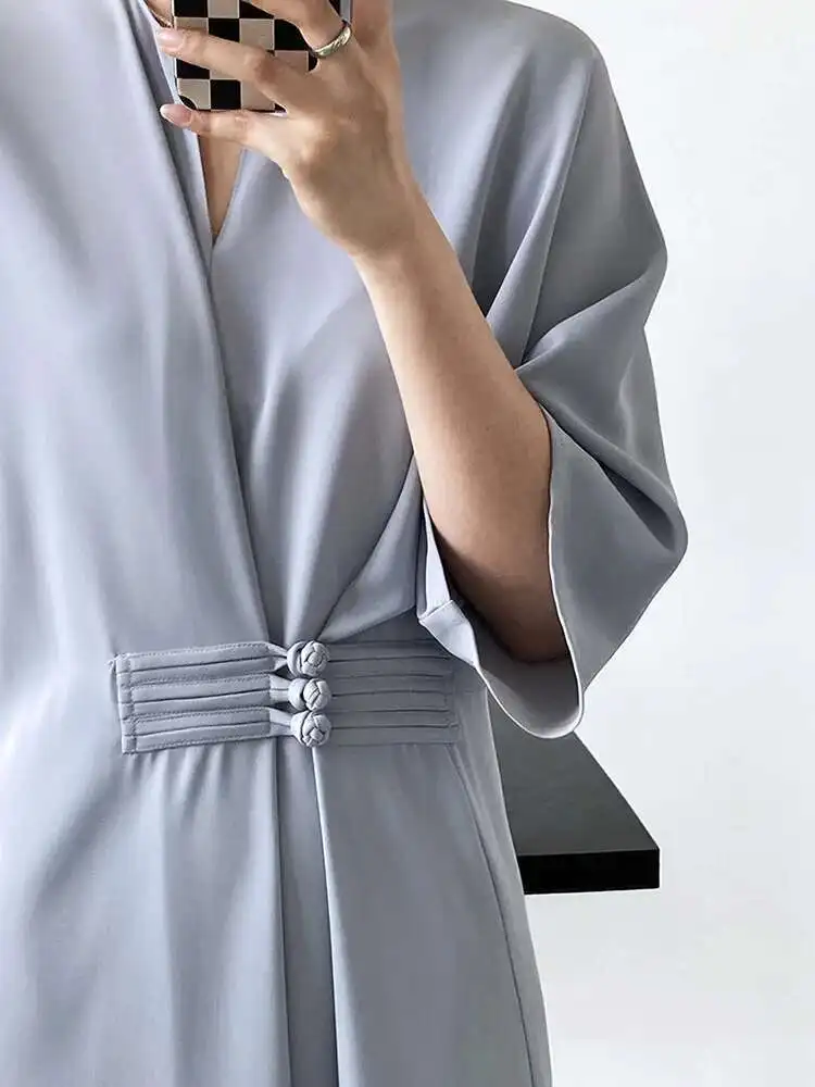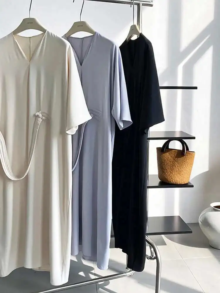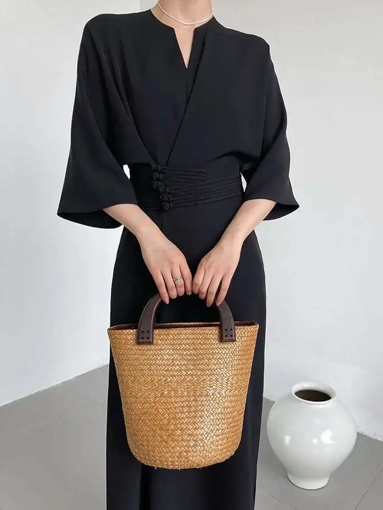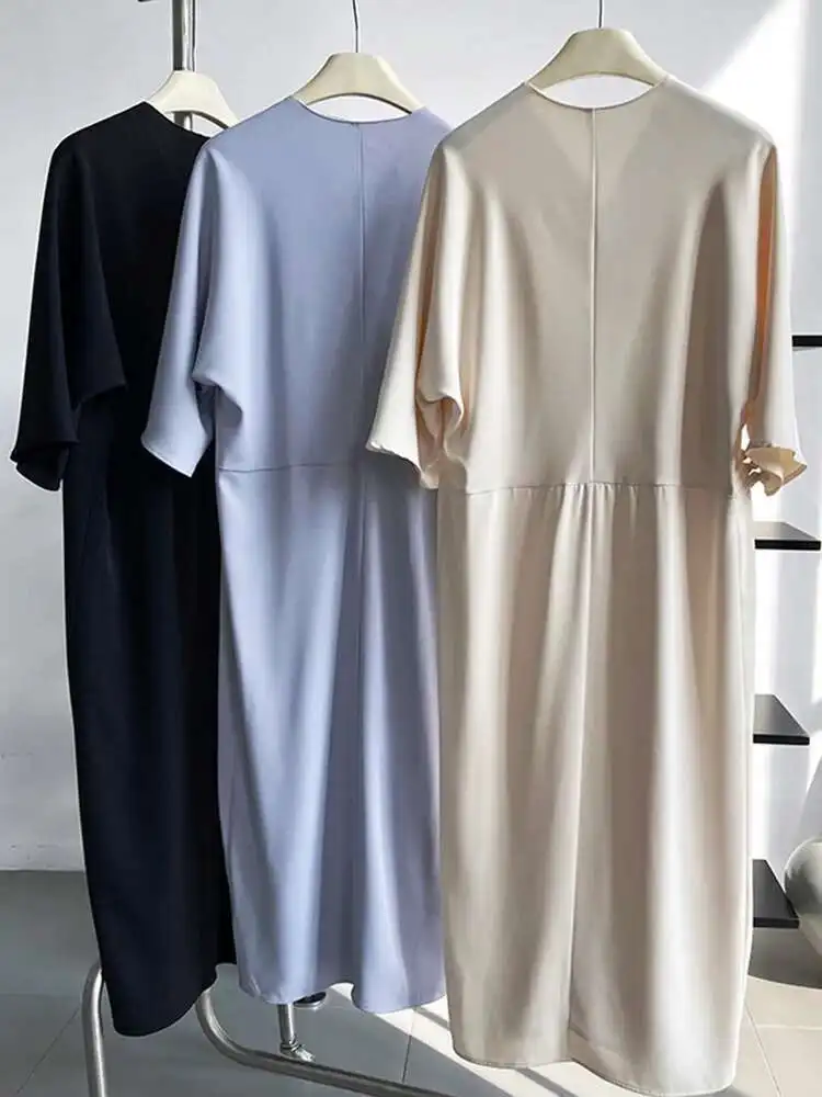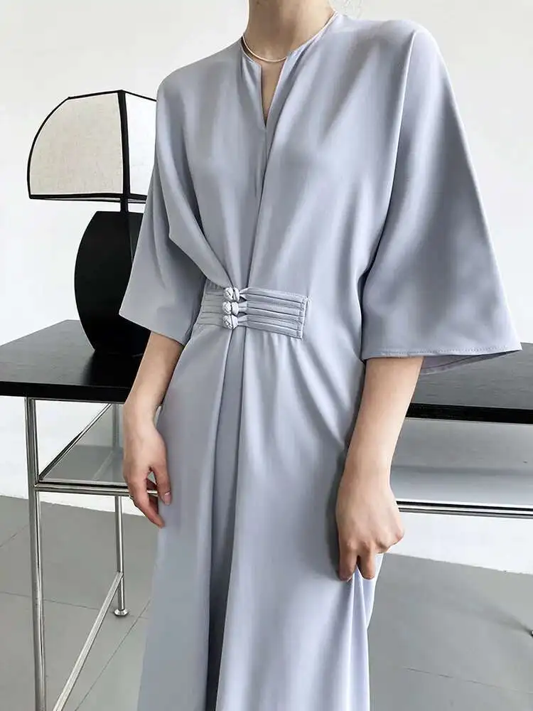 Women Black Buckle Long Elegant Dress New Round Neck Three-quarter Sleeve Loose Fit Fashion Spring Autumn 2025 1DE7880