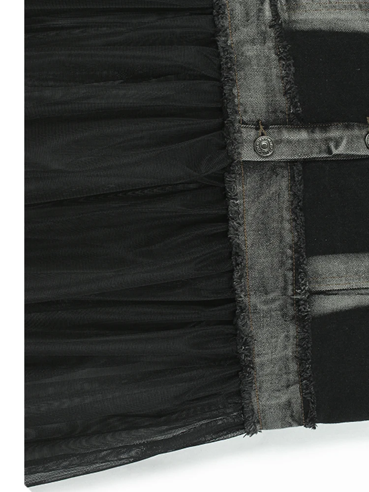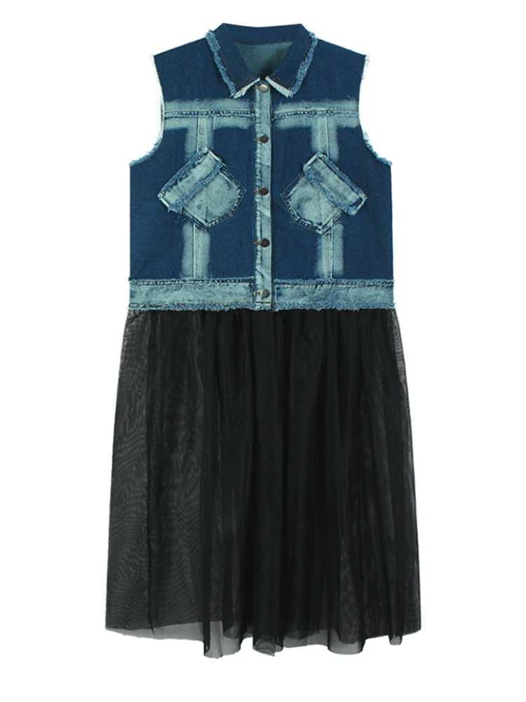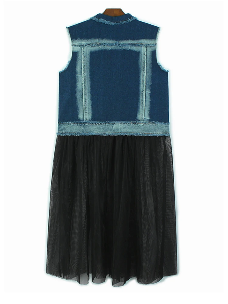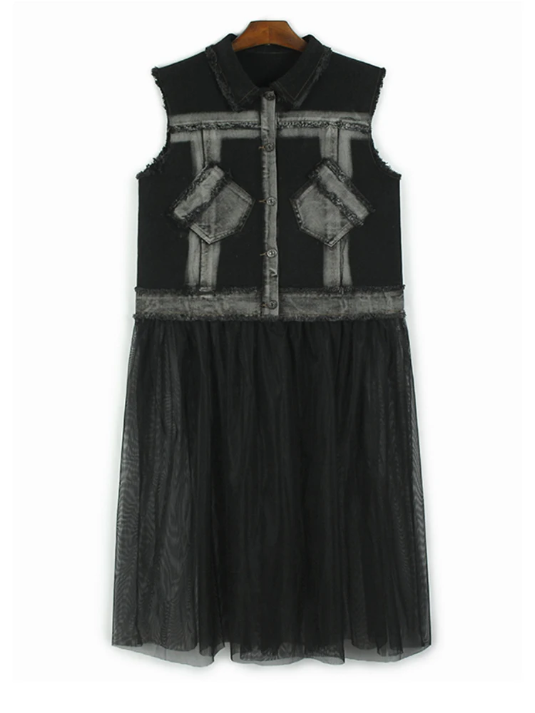 Women Black Denim Burr Mesh Spliced Big Size Vest Dress New Lapel Sleeveless Fashion Tide Spring Autumn 2025 1DJ1352