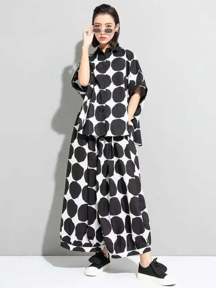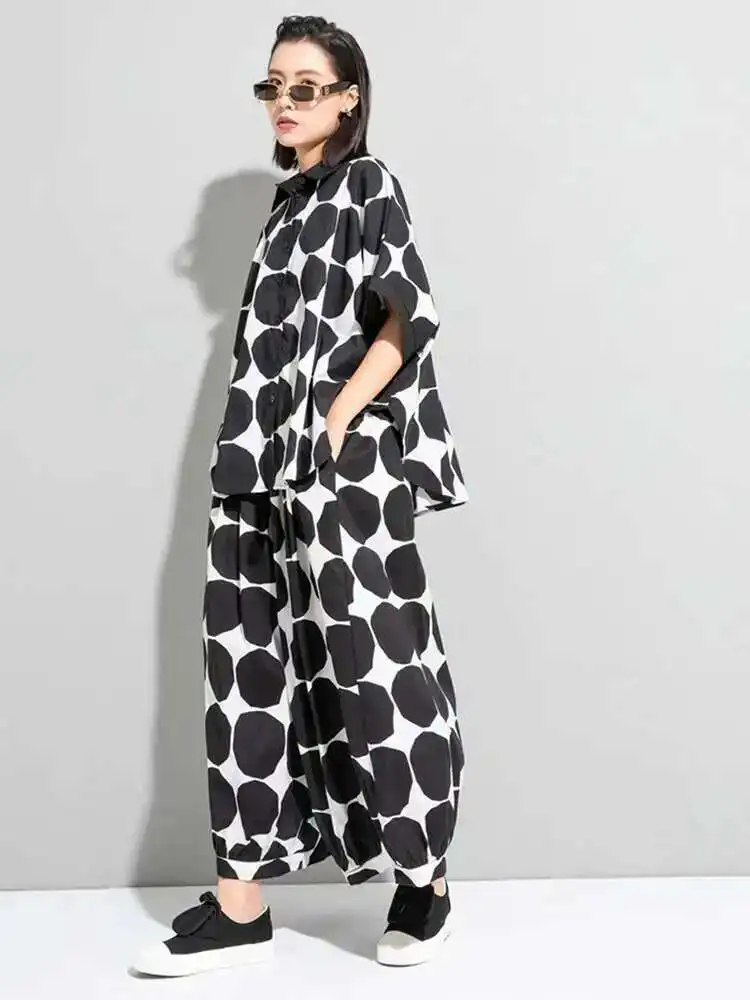 Women Black Dot Printed Big Size Blouse New Lapel Three-quarter Sleeve Loose Fit Shirt Fashion Spring Summer 2025 1DE6982