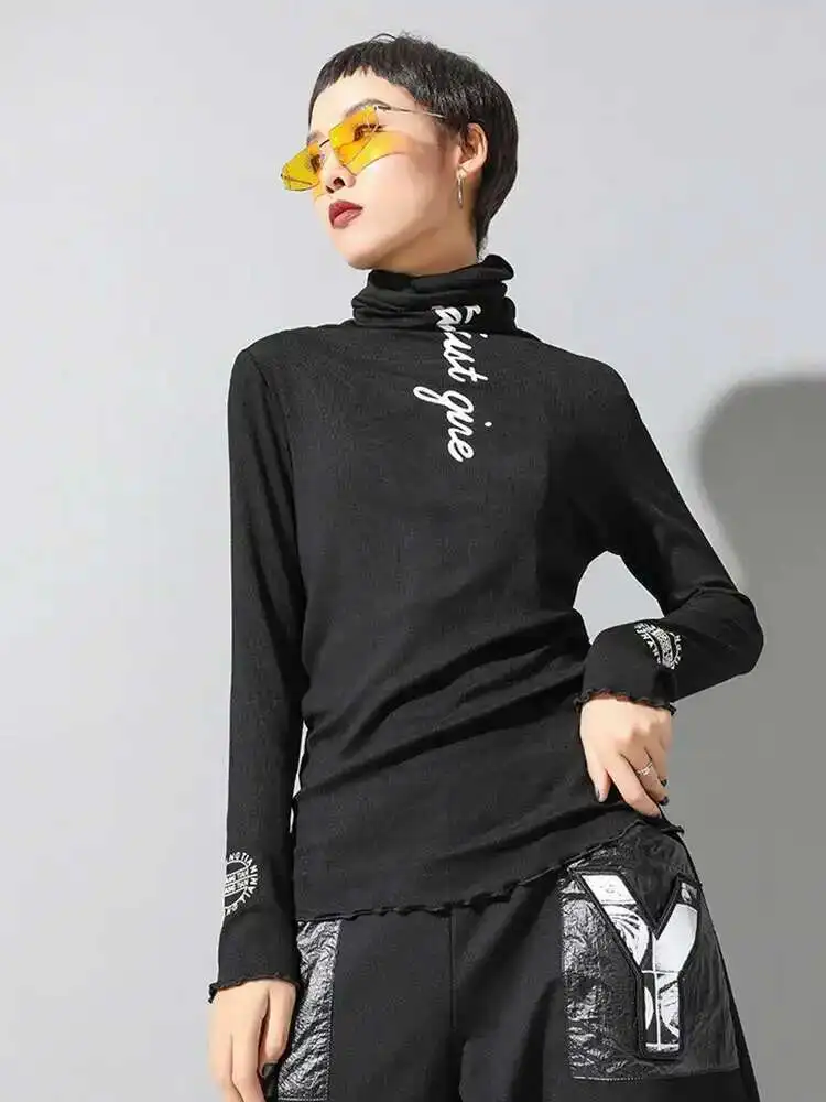 Women Black High Elastic Letter Slim Casual T-shirt New Turtleneck Long Sleeve Fashion Tide Spring Autumn 2025 1DF4640