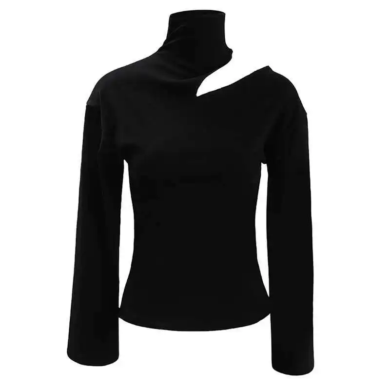 Women Black Hollow Out Slim Elegant Plain T-shirt New Turtleneck Long Sleeve Fashion Tide Spring Autumn 2025 CPDB103