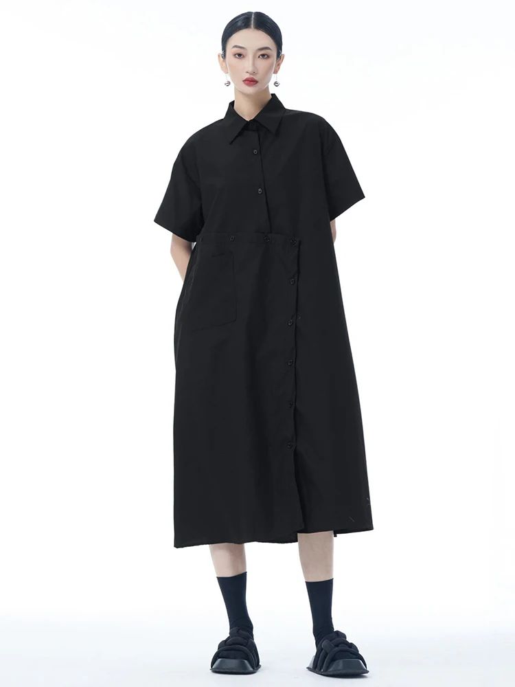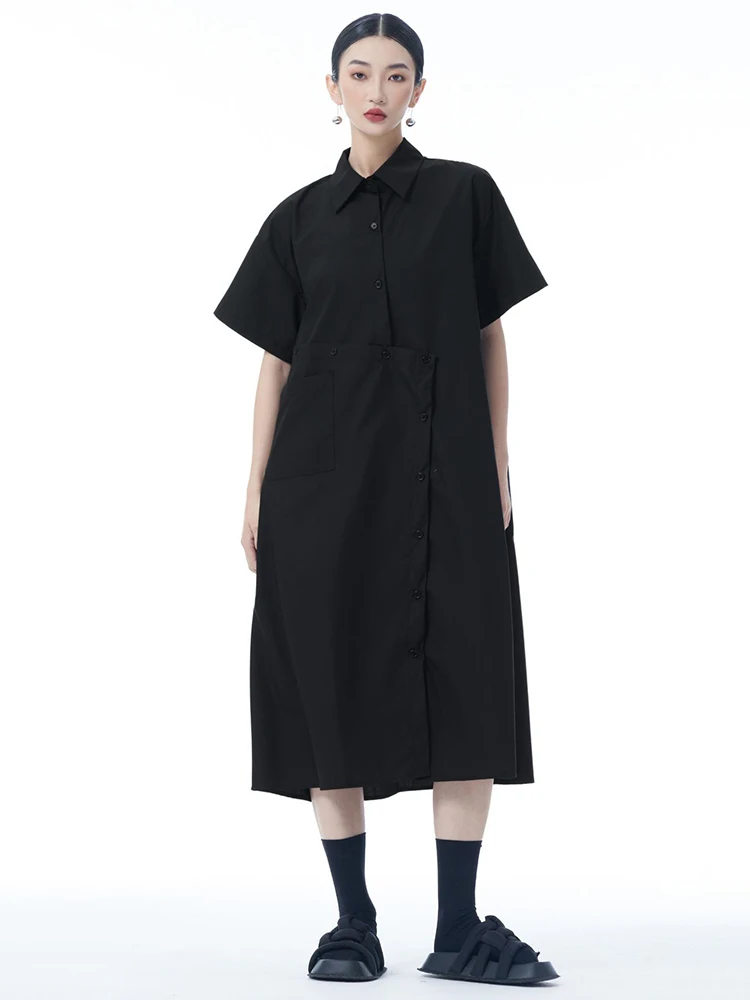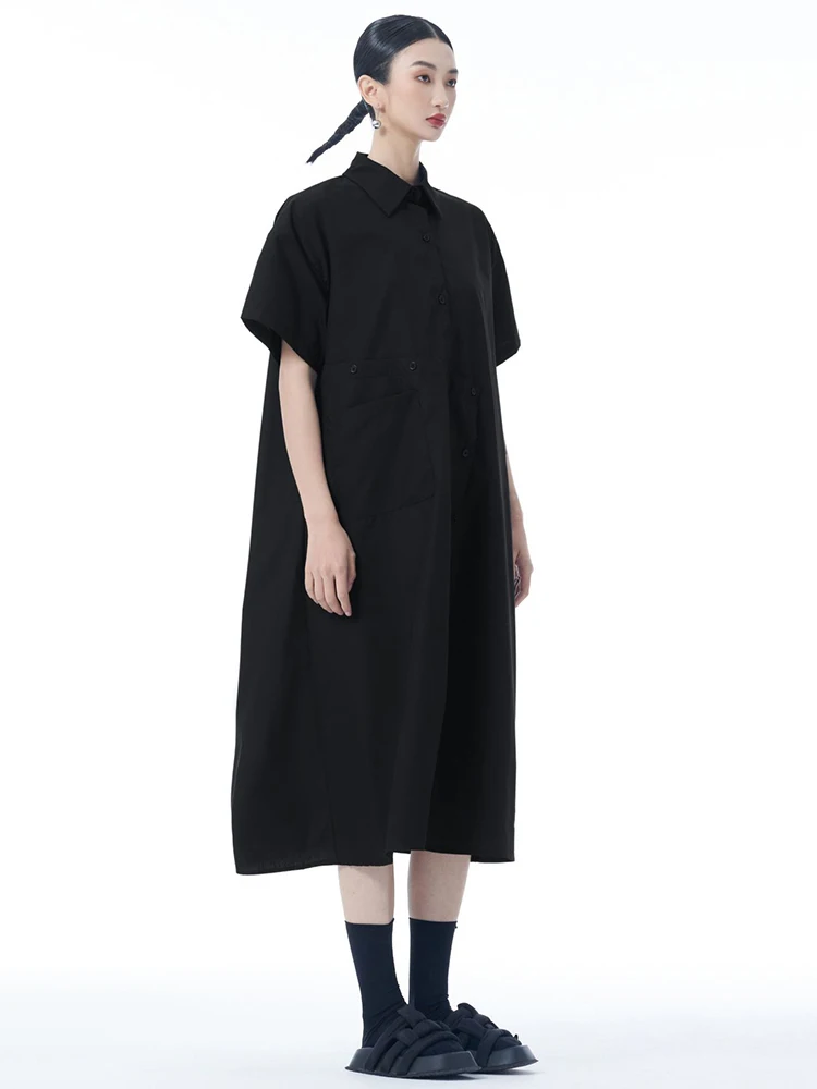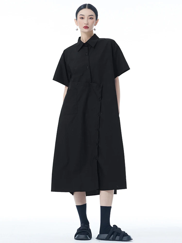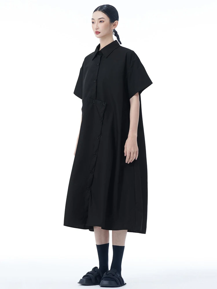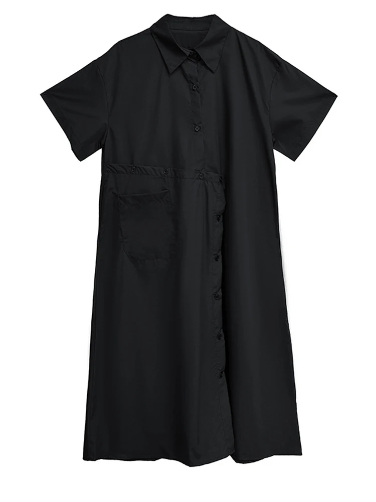 Women Black Irregular Button Big Size Midi Shirt Dress New Lapel Short Sleeve Fashion Tide Spring Summer 2025 1DJ0954