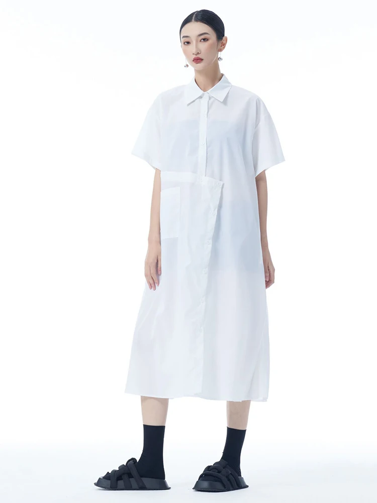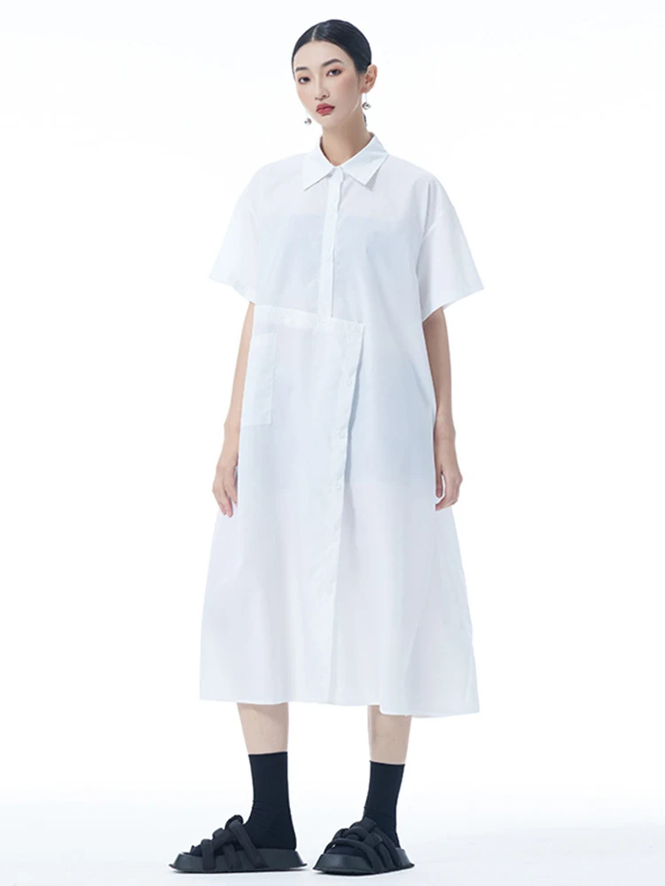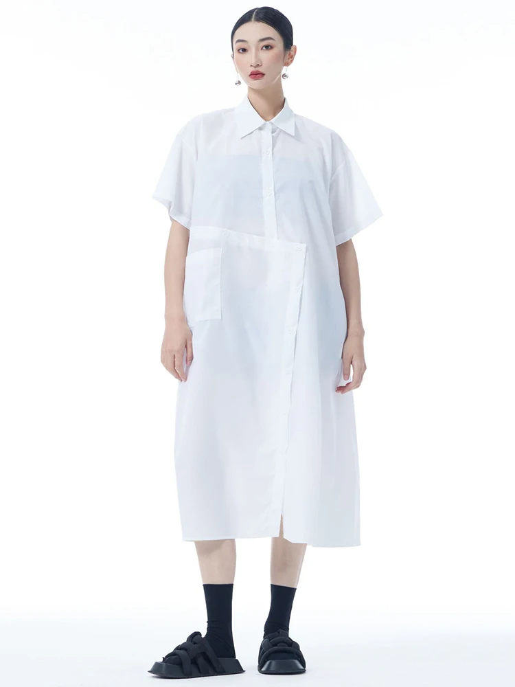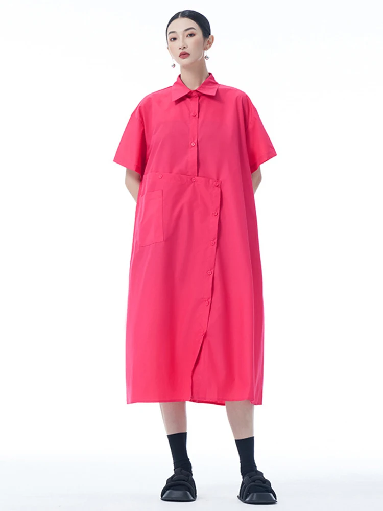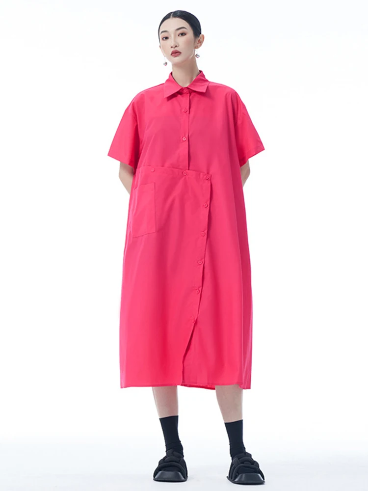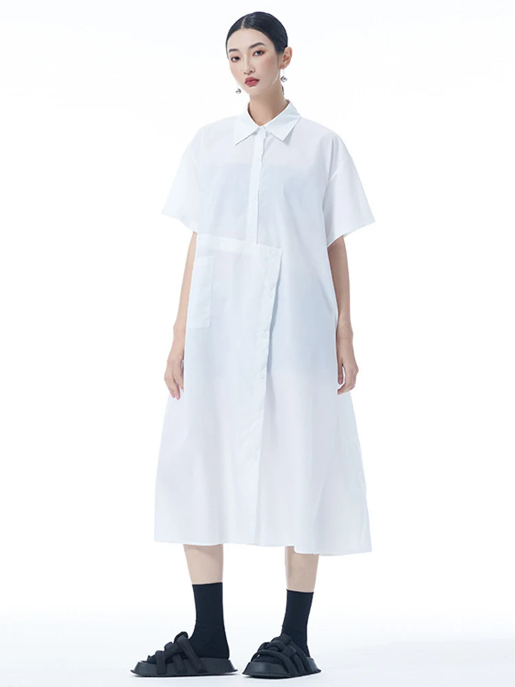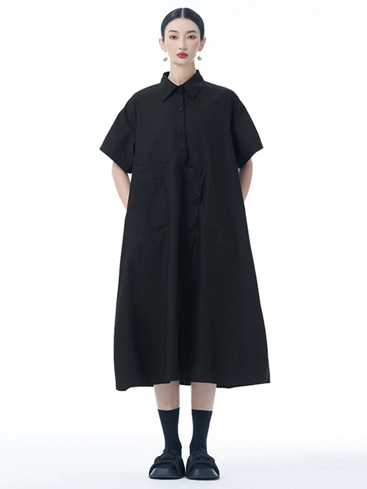 Women Black Irregular Button Big Size Midi Shirt Dress New Lapel Short Sleeve Fashion Tide Spring Summer 2025 1DJ0954