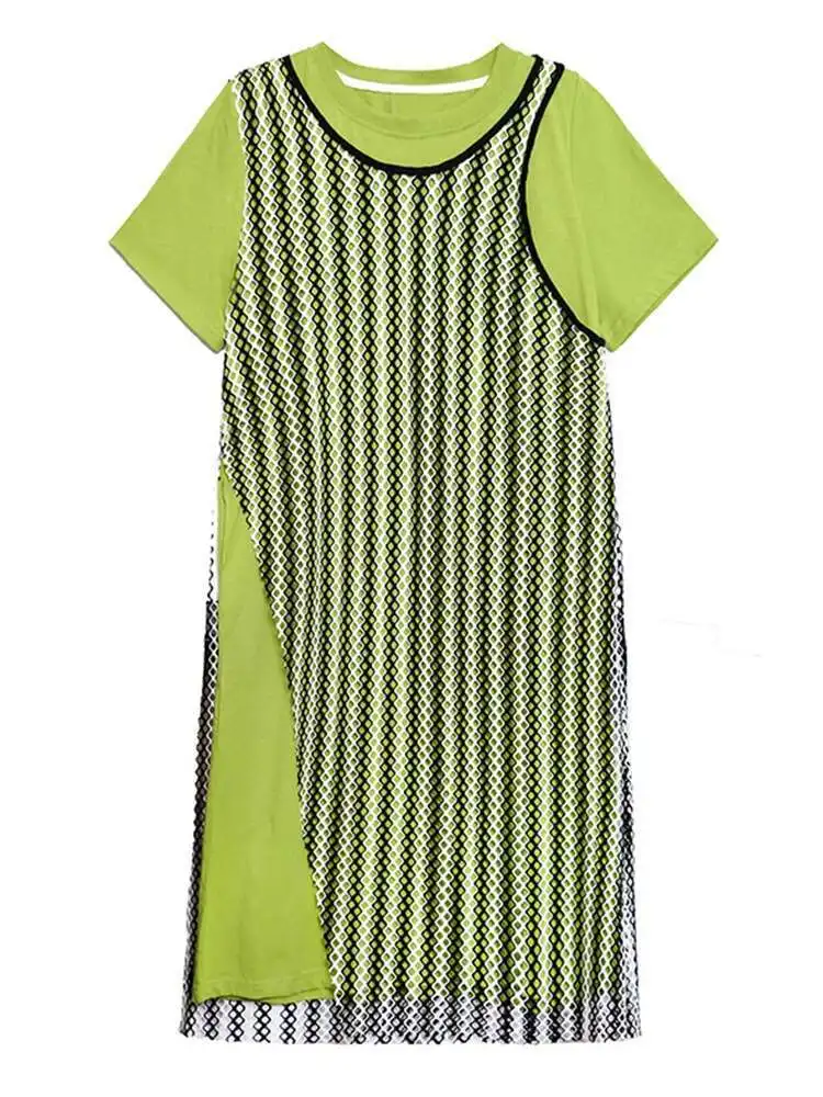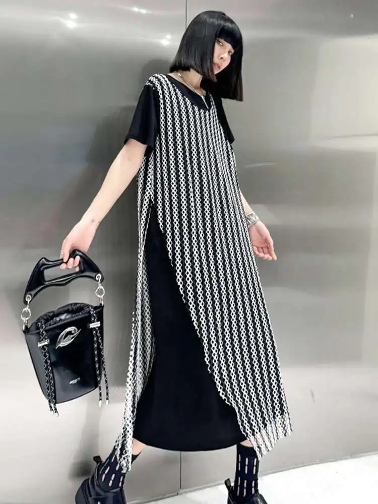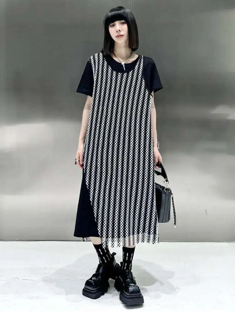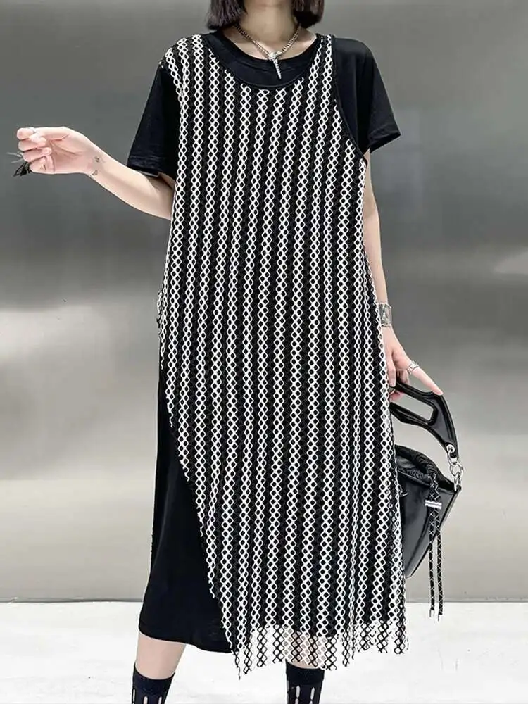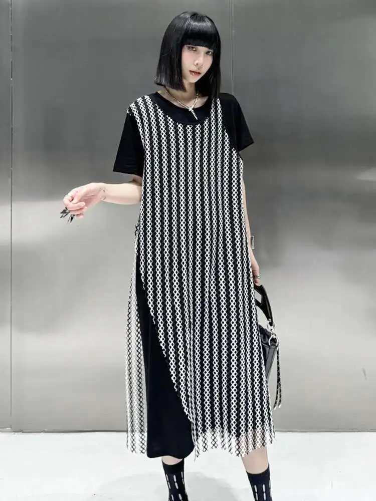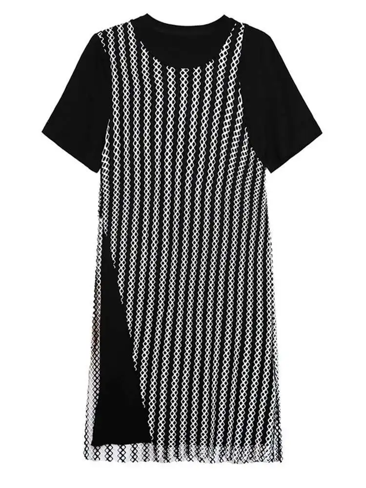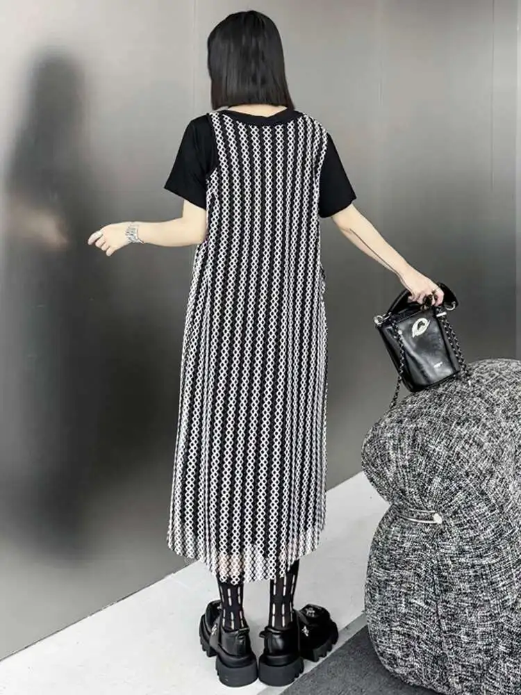 Women Black Irregular Mesh Big Size Casual Midi Dress New Round Neck Short Sleeve Fashion Tide Spring Summer 2025 1DH5415