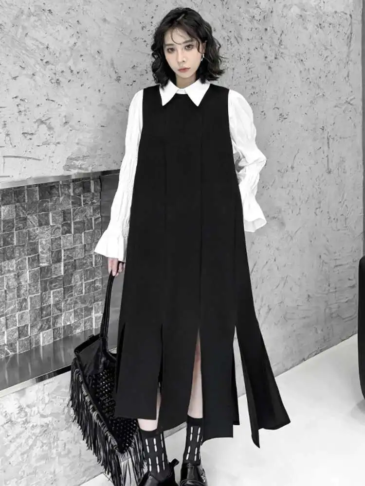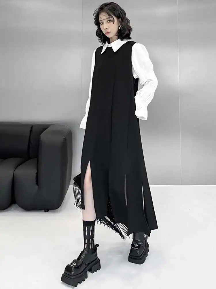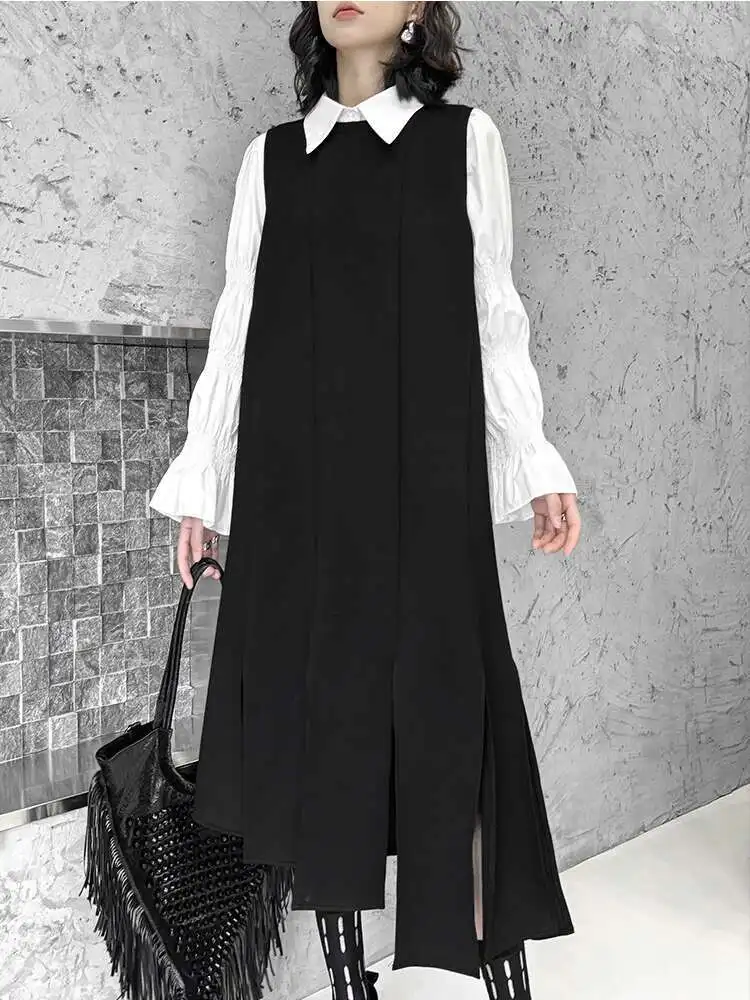Women Black Irregular Ribbons Big Size Strap Dress New Round Neck Sleeveless Fashion Tide Spring Autumn 2025 1DH8059