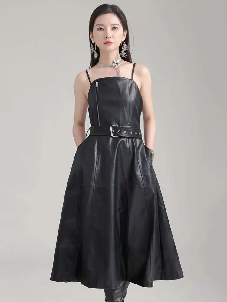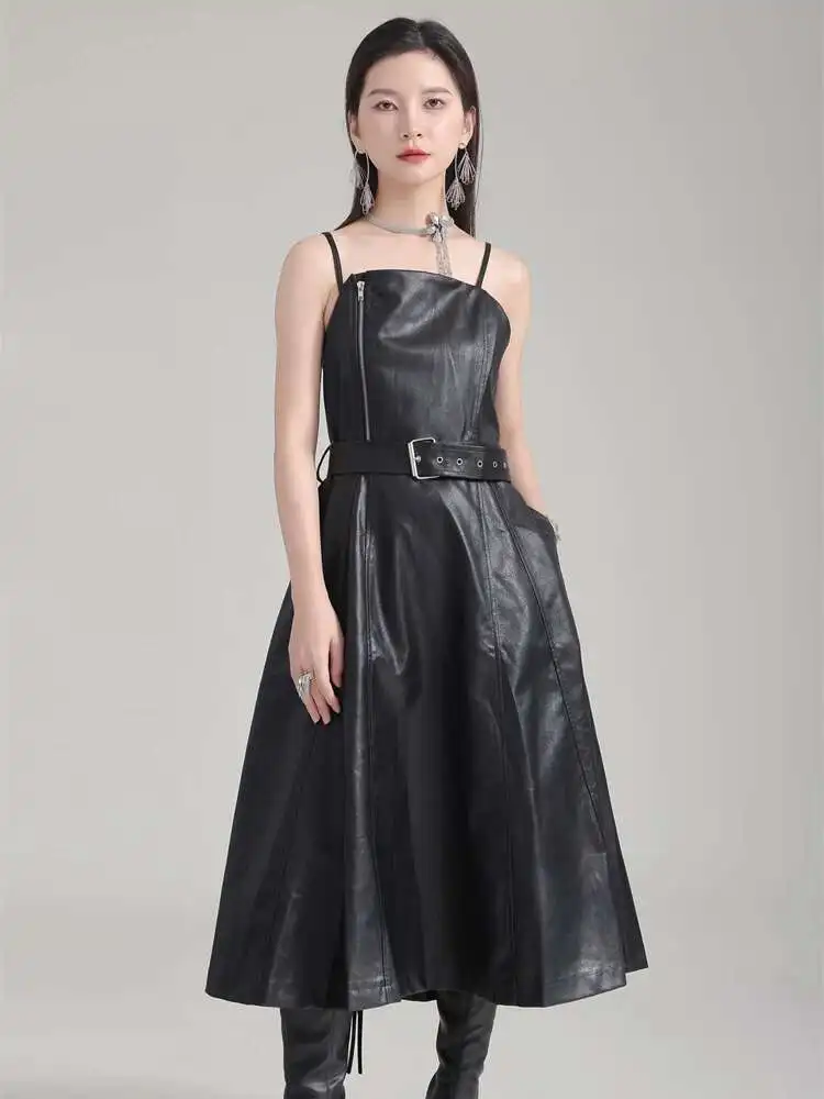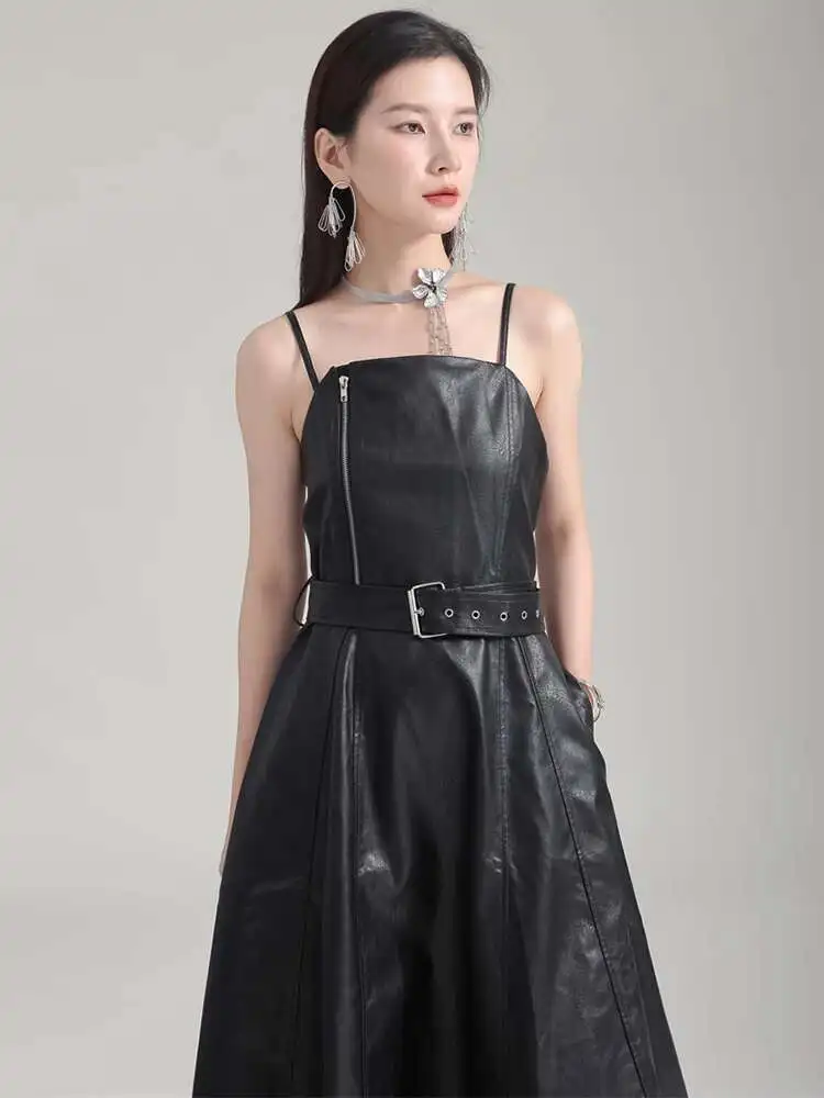 Women Black Pu Leather Belted Long A-line Dress New V-Neck Sleeveless Loose Fit Fashion Tide Spring Autumn 2025 1DH2000