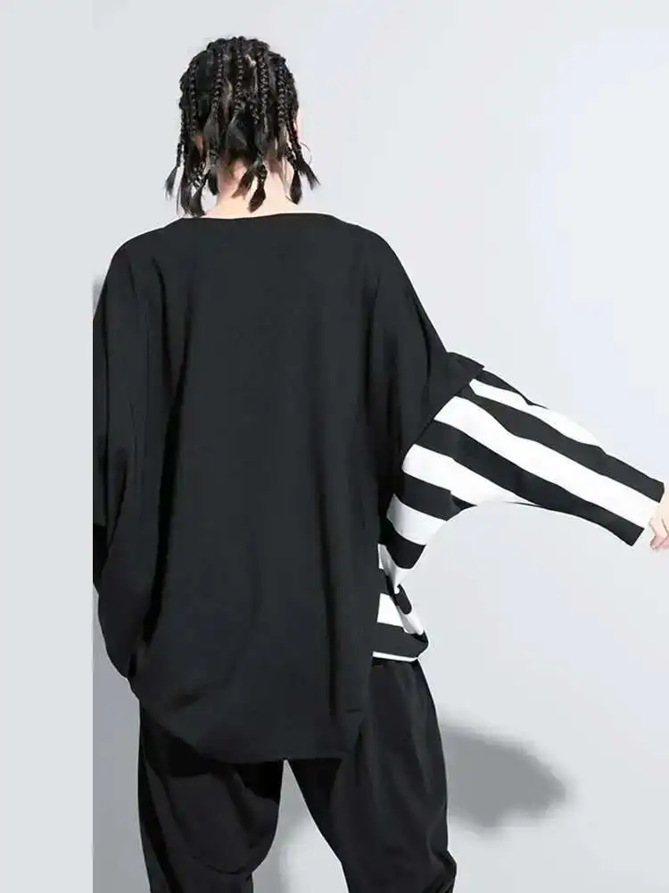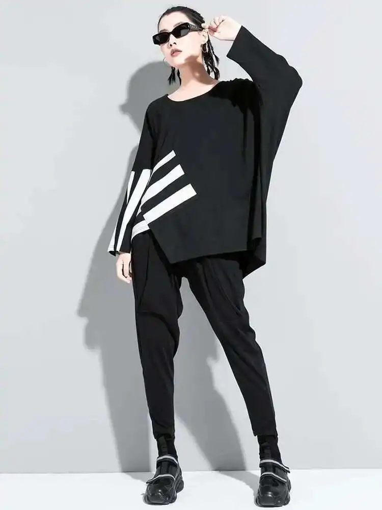 Women Black Striped Irregular Big Size Casual T-shirt New Round Neck Long Sleeve Fashion Tide Spring Autumn 2025 1DF5282