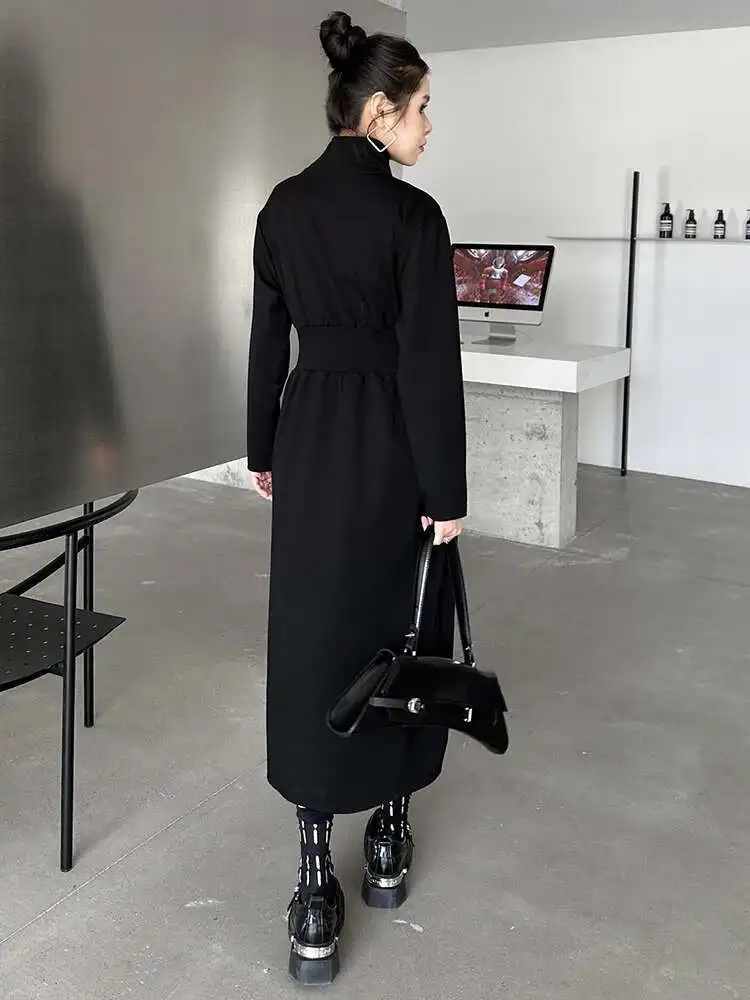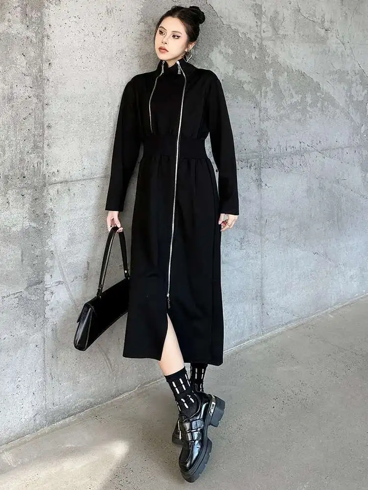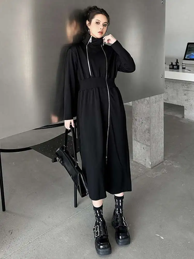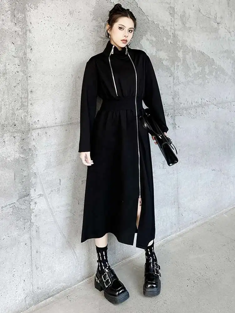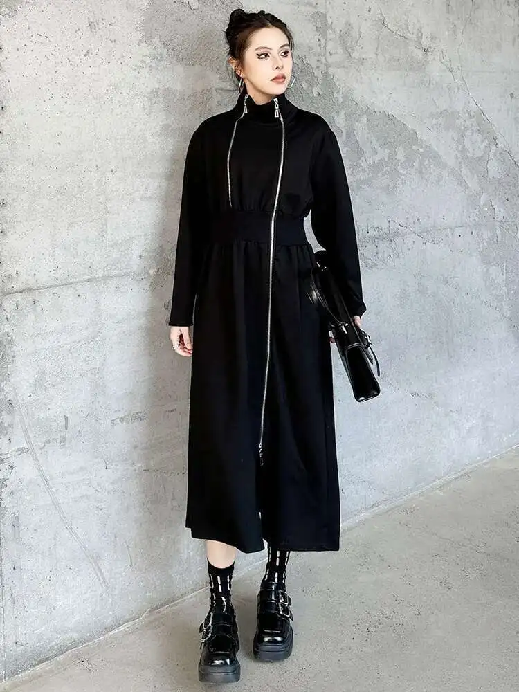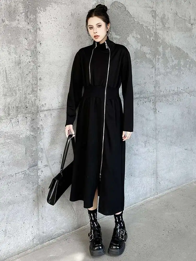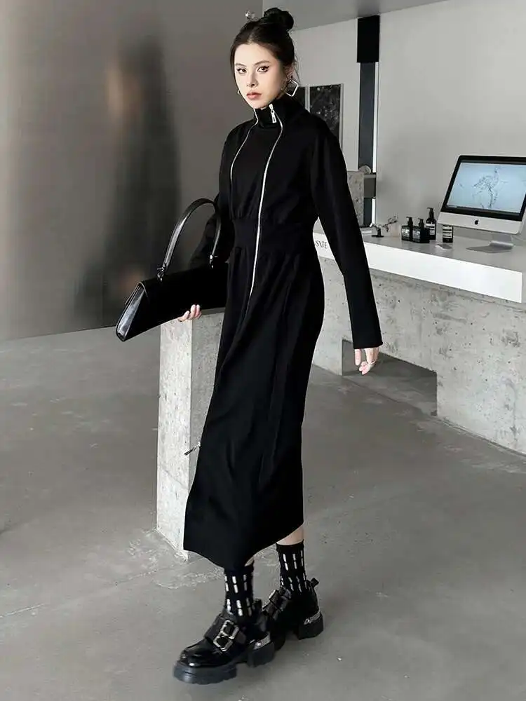 Women Black Zipper Irregular Hem Slit Midi Dress New Turtleneck Long Sleeve Fashion Tide Spring Autumn 2025 1DH9354