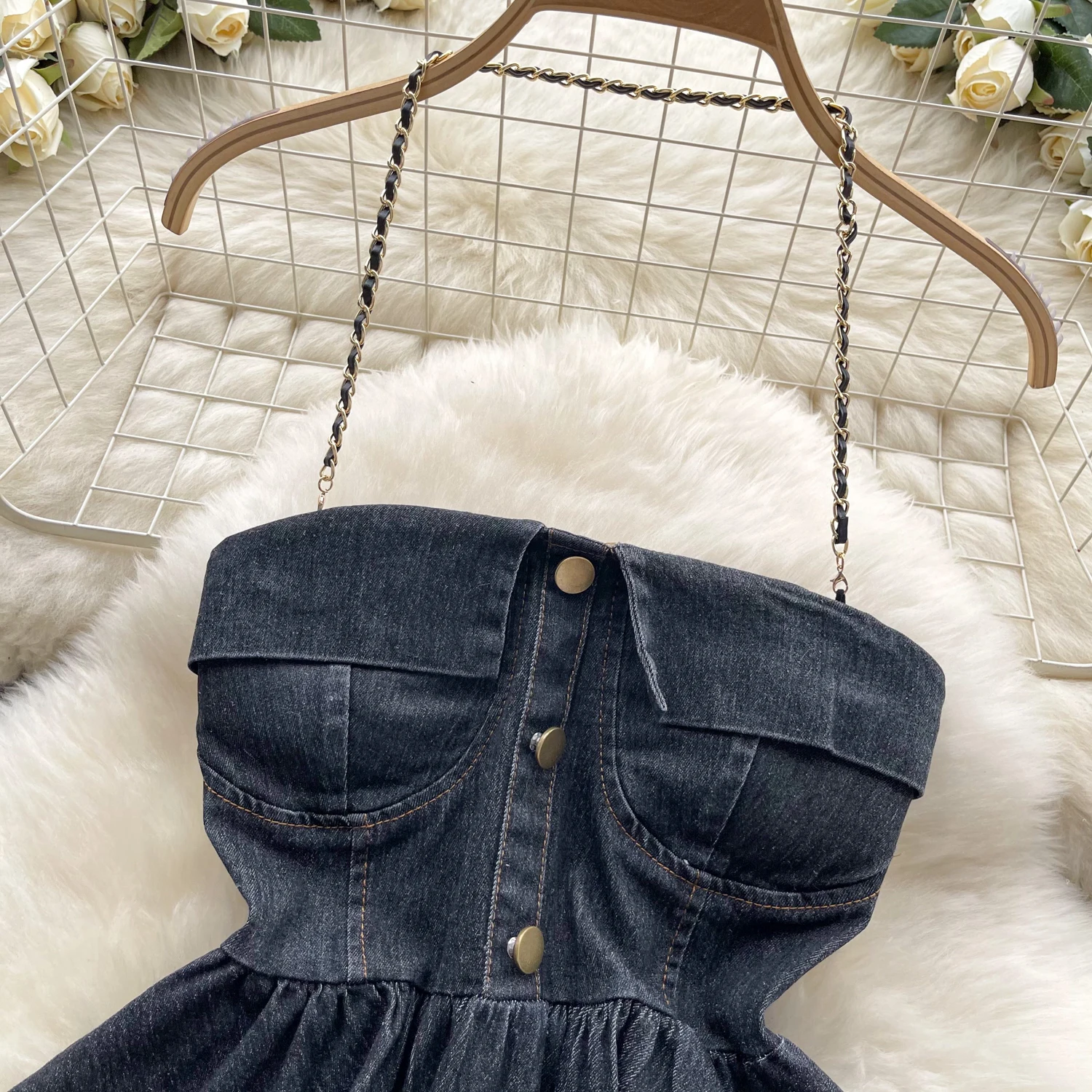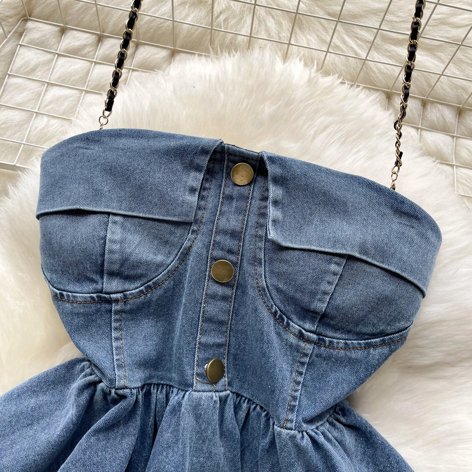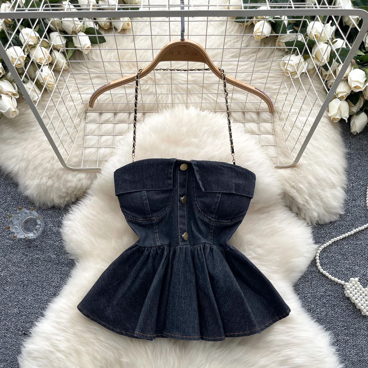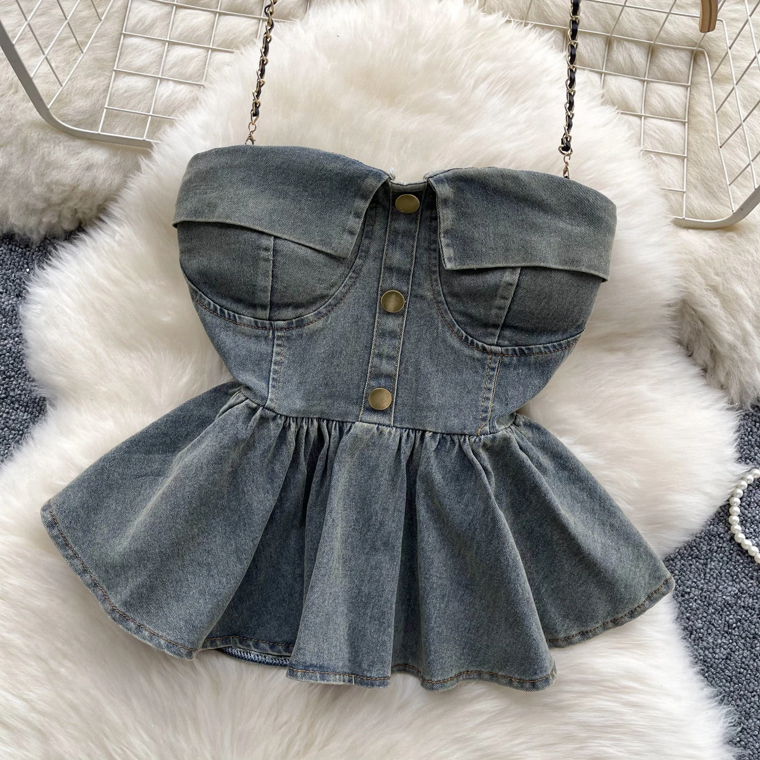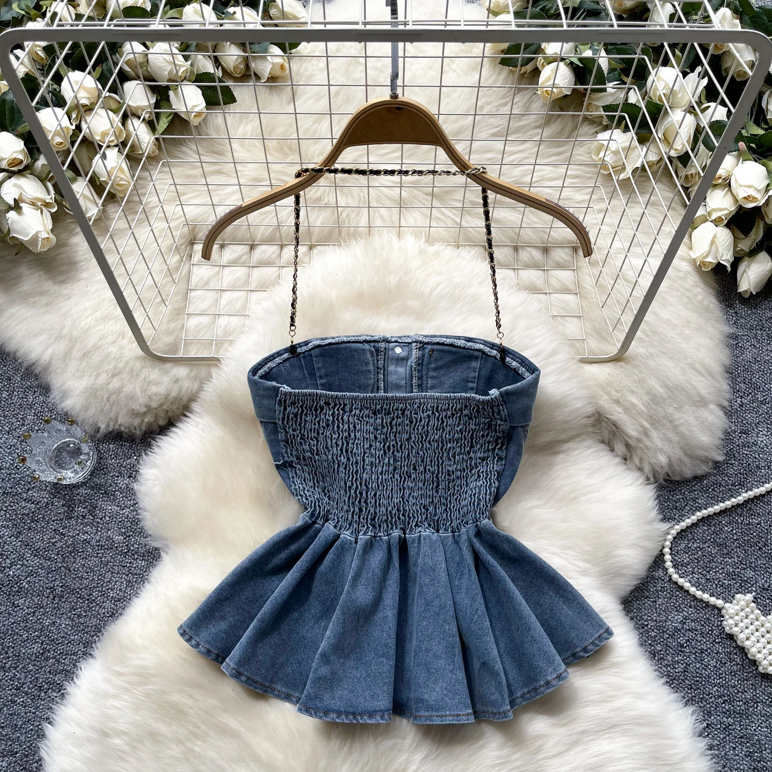 Women Blue Gray Sexy Club Vacation Denim Slim Short Halter Tops Summer Black Backless Ruffle Edge Party Jean Vest Streetwear New