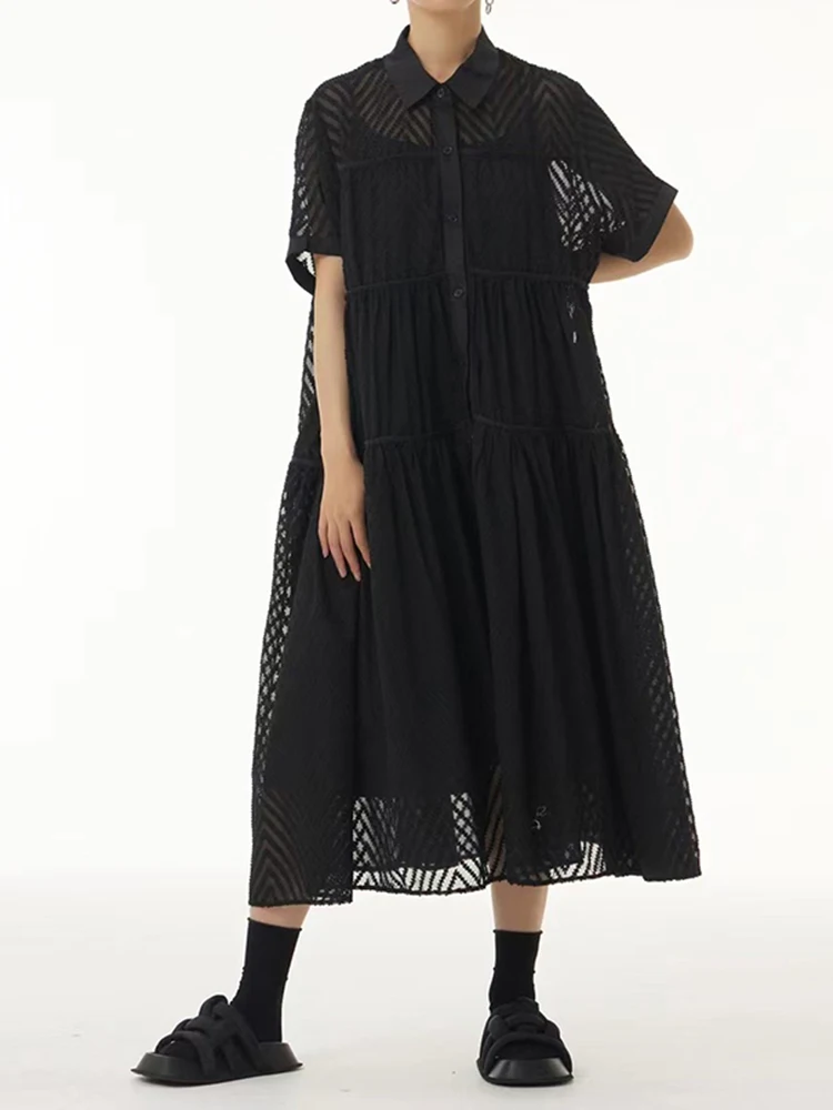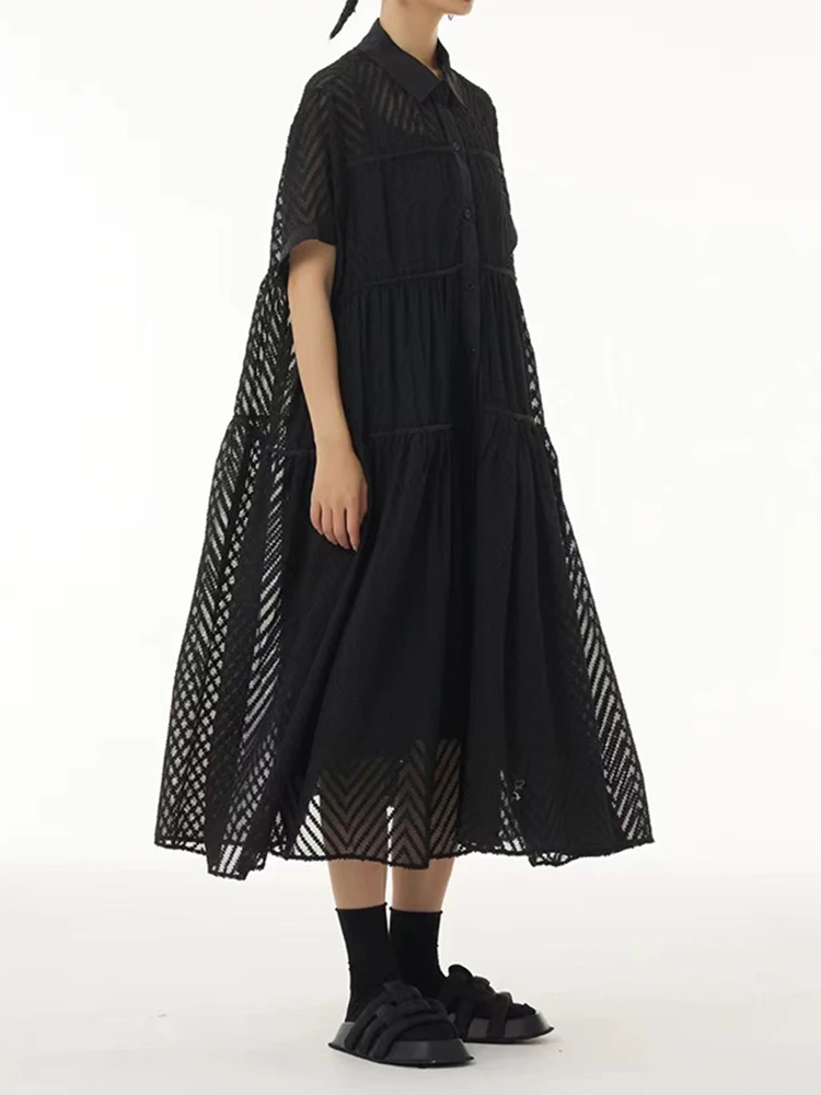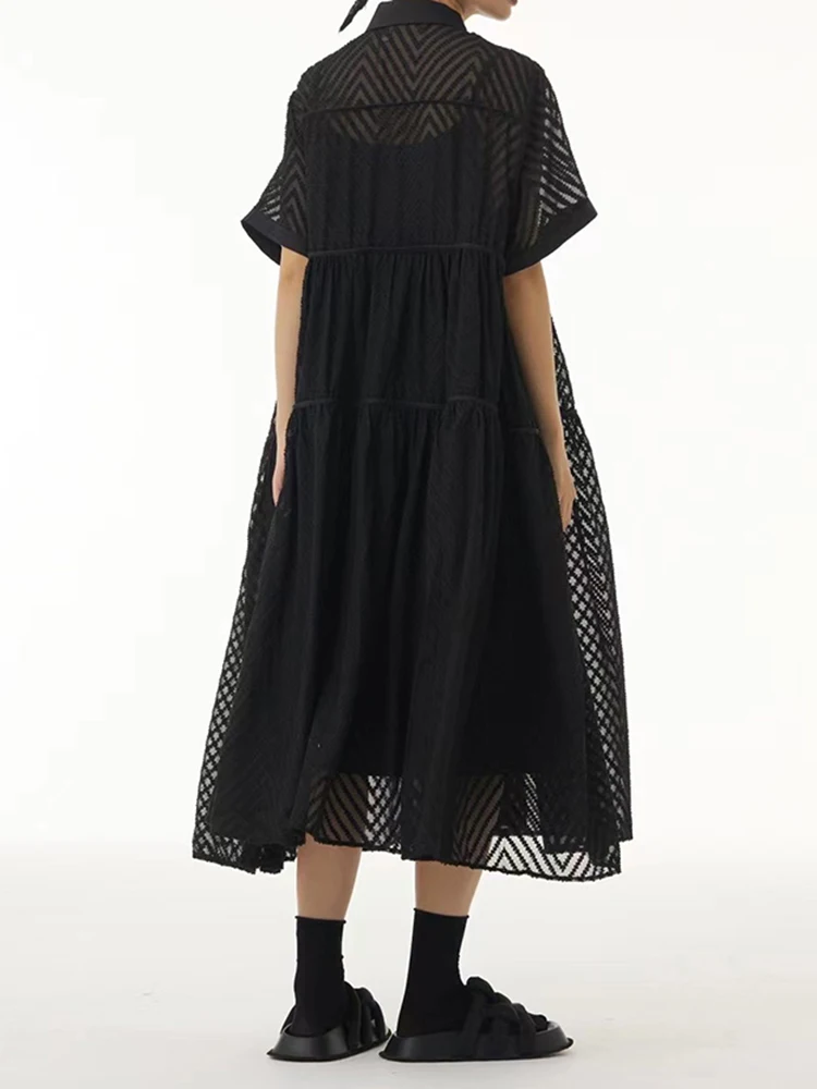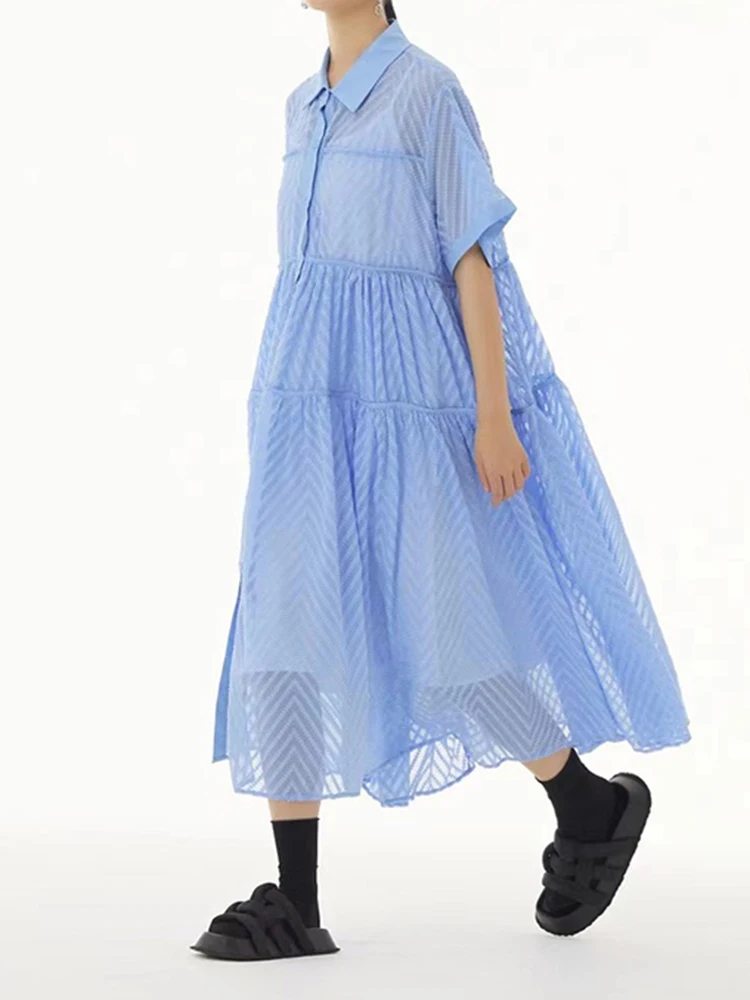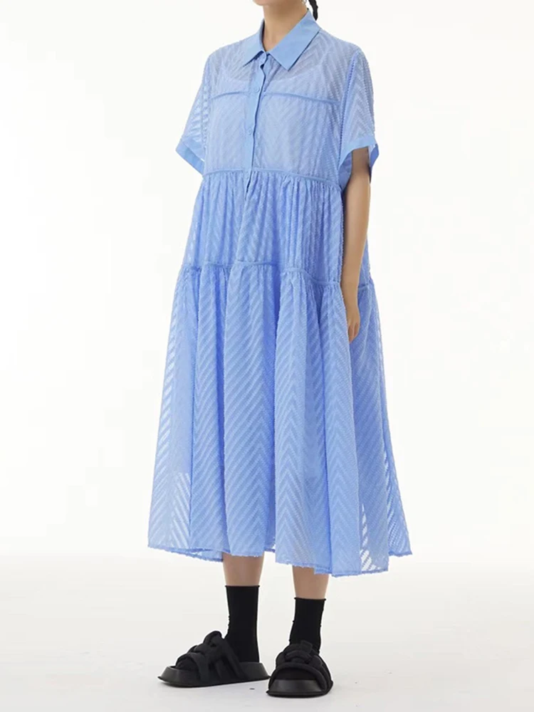 Women Blue Grid Hollow Out Big Size Midi Shirt Dress New Lapel Short Sleeve Fashion Tide Spring Summer 2025 1DJ1208