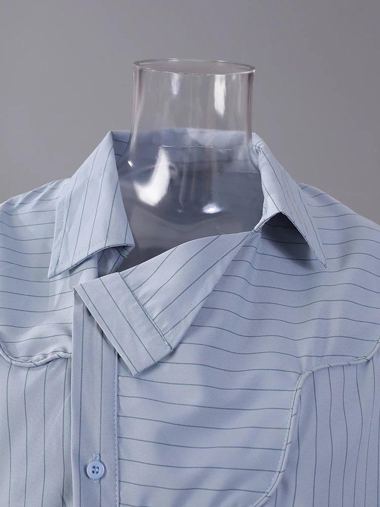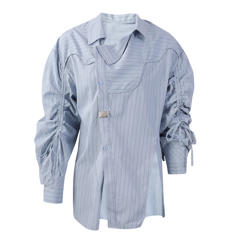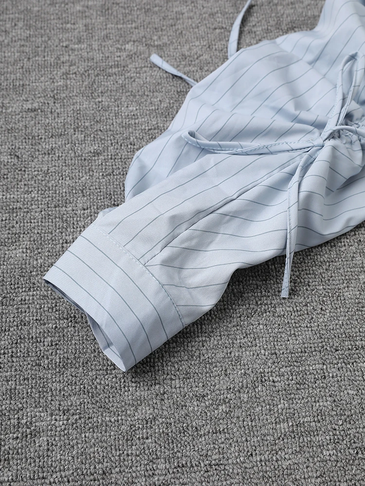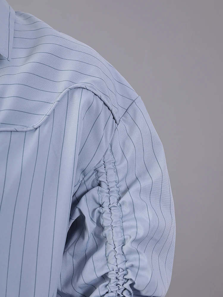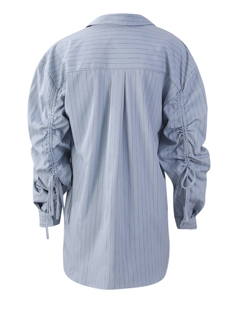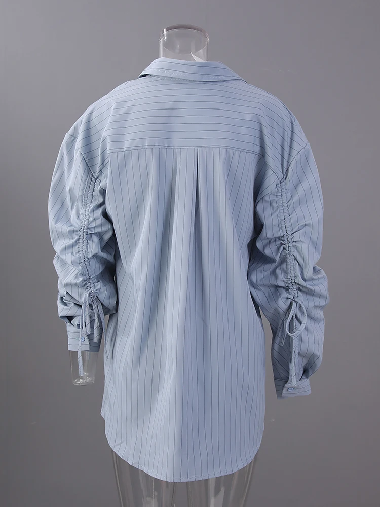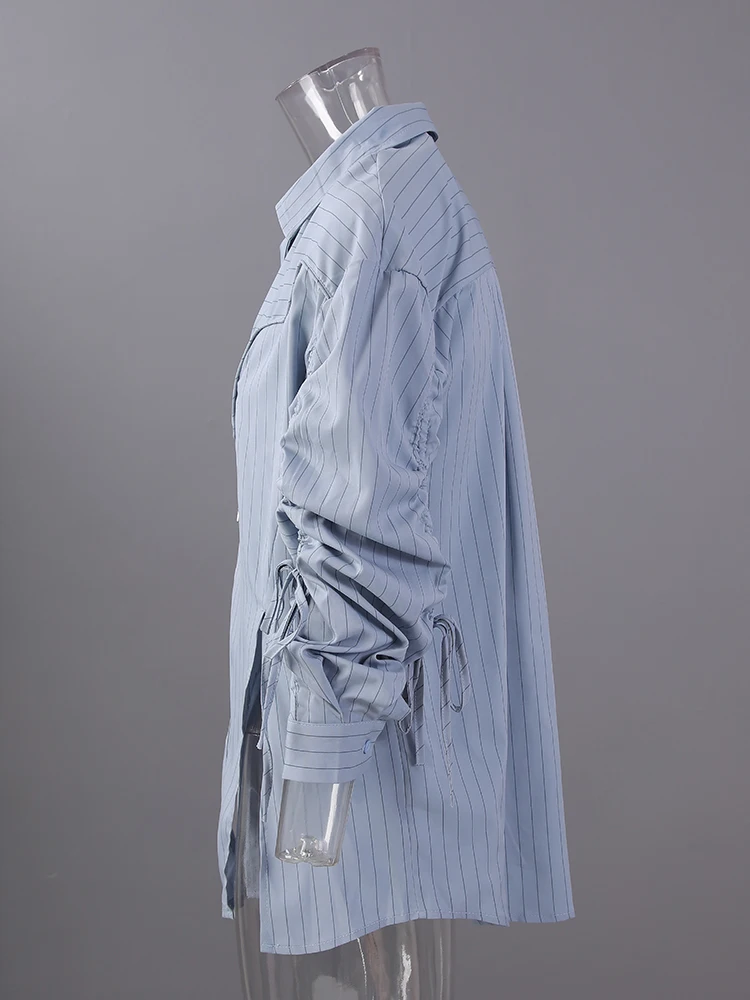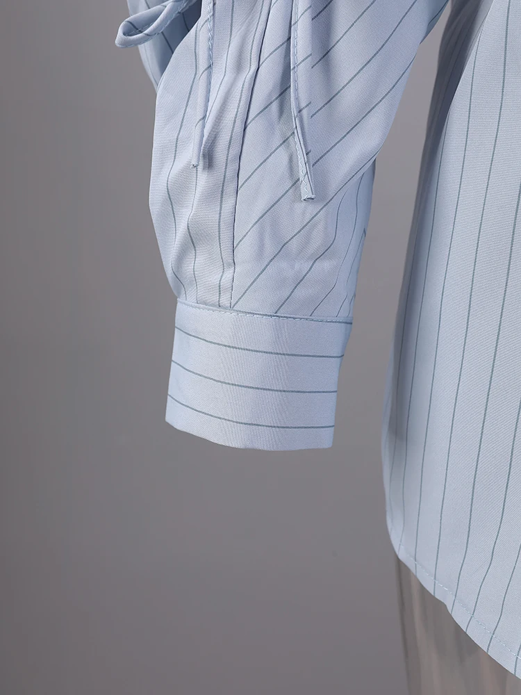 Women Blue Striped Drawstring Slit Big Size Blouse New Lapel Long Sleeve Shirt Fashion Tide Spring Autumn 2025 7AB8101