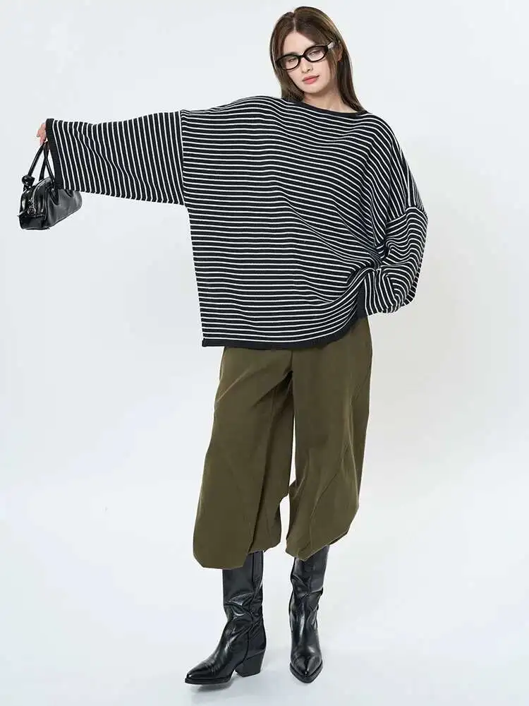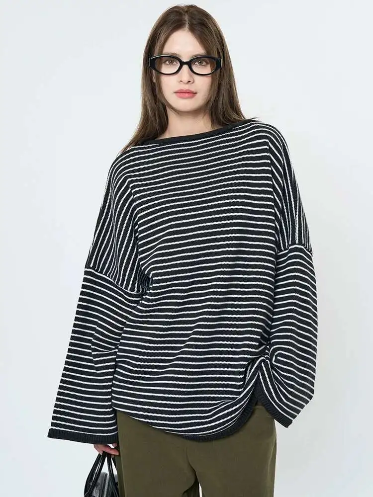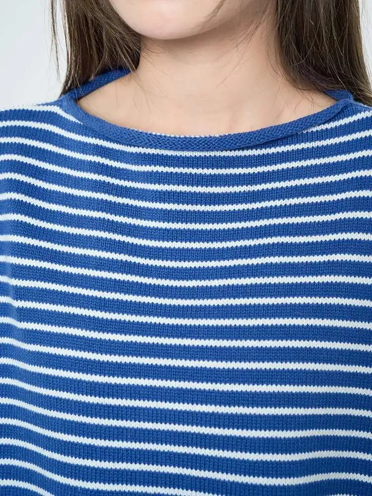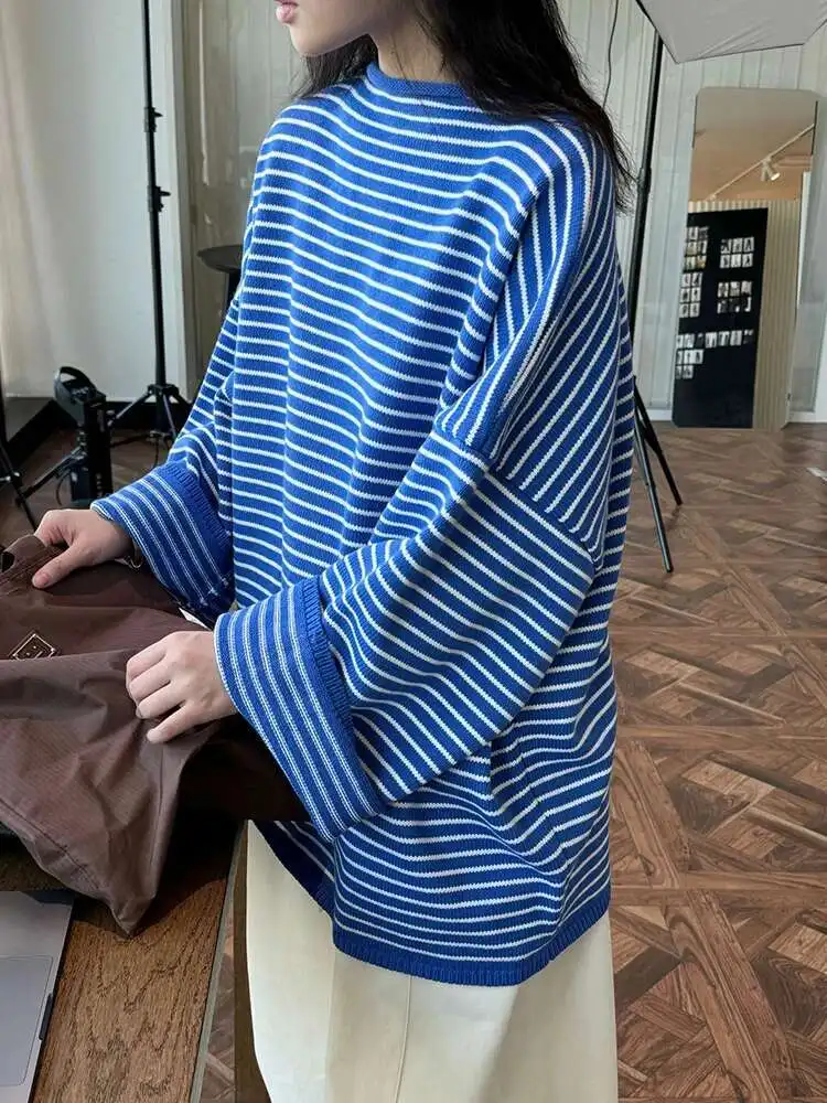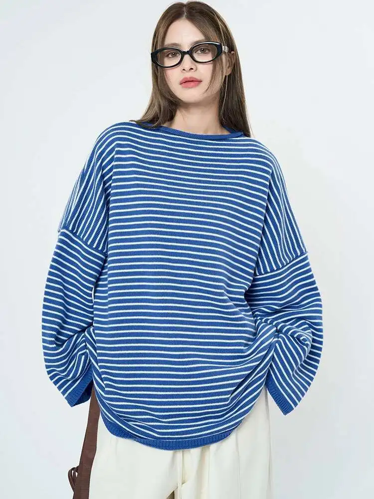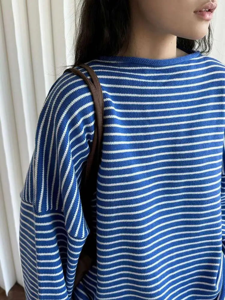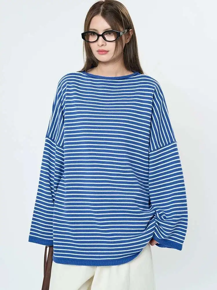 Women Blue Striped Shaped Big Size Knitting T-shirt New Round Neck Long Sleeve Fashion Tide Spring Autumn 2025 1DH9279