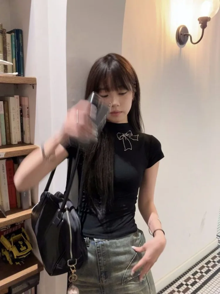 Women Clothing Black Tshirts Fashion Slim Fit Summer Tees Y2k Tops Short Sleeve Half High Collar Diamond Bow Fashion T Shirts