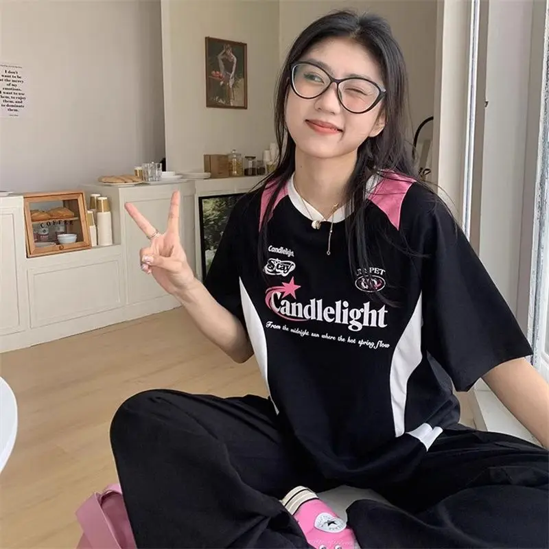 Women Clothing Patchwork Letter Women T Shirts Y2k Tops O-neck Short Sleeve Cotton Tees Fashion Casual Summer Tshirt Ropa Mujer