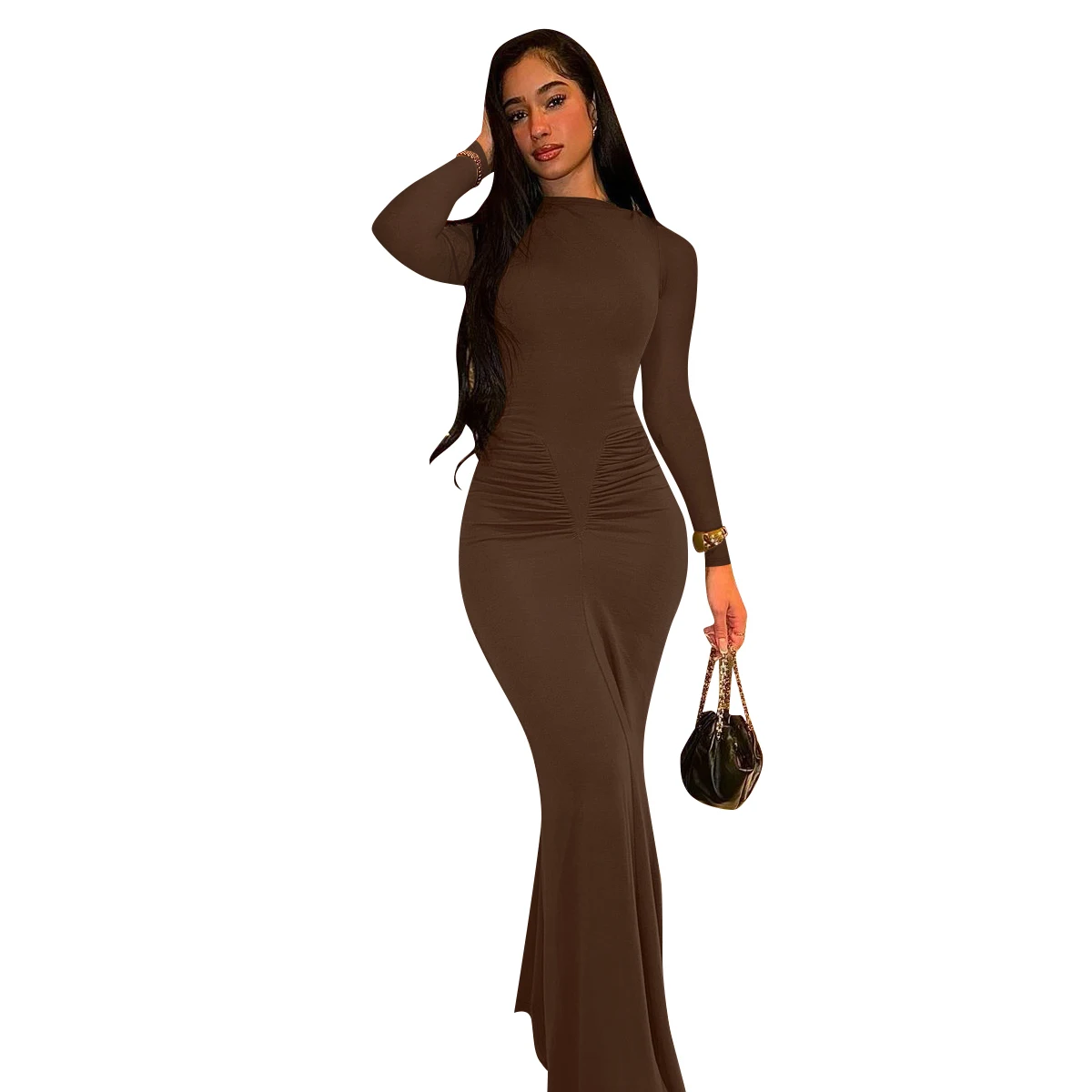 Women Elegant Solid Long Sleeve Ruched Sexy Bodycon Maxi Prom Dress Spring New Y2K Outfits Birthday Party Vacation