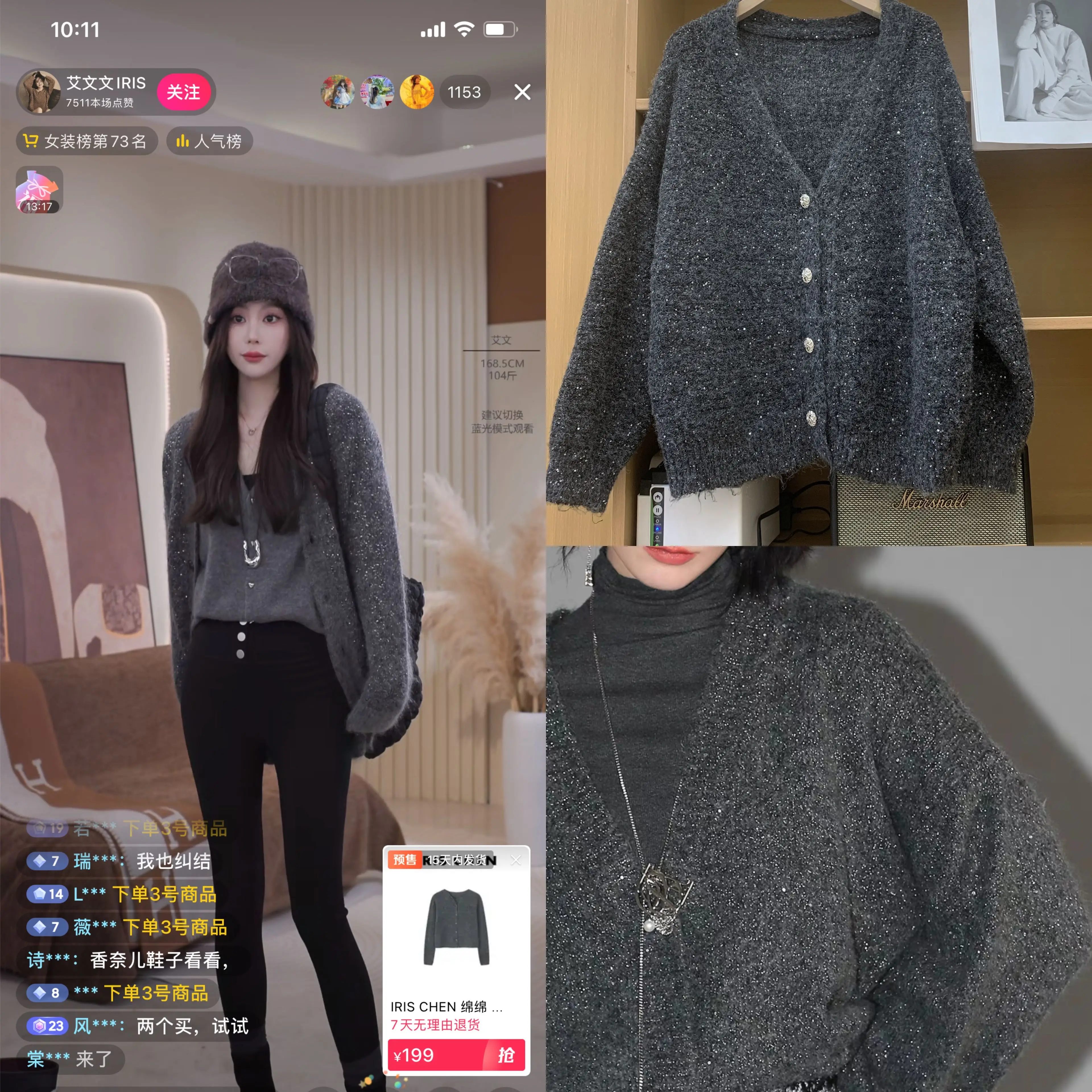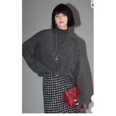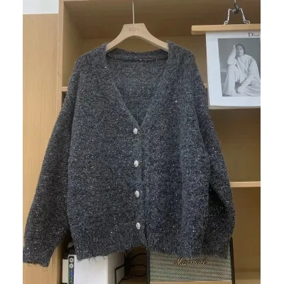 Women Gray Single Breasted Knitted Cardigan Loose Sweater 2024 Autumn Winter Holiday V Neck Long Sleeve Tops Casual Popular Chic