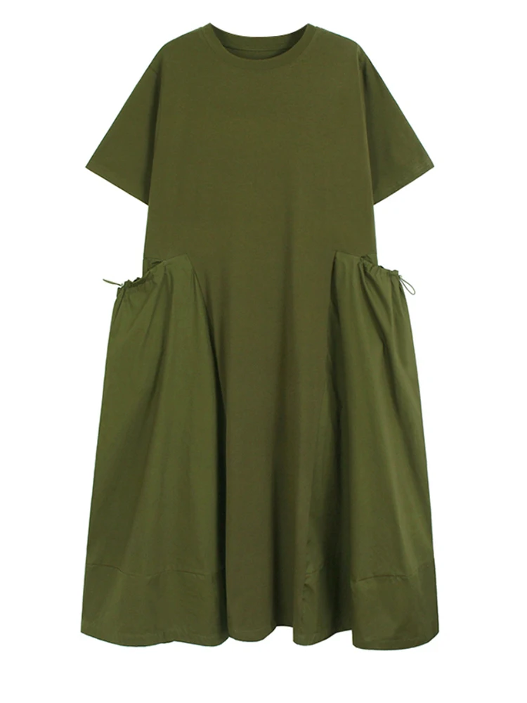 Women Green Drawstring Pocket Big Size Midi Dress New Round Neck Short Sleeve Fashion Tide Spring Summer 2025 1DJ1355