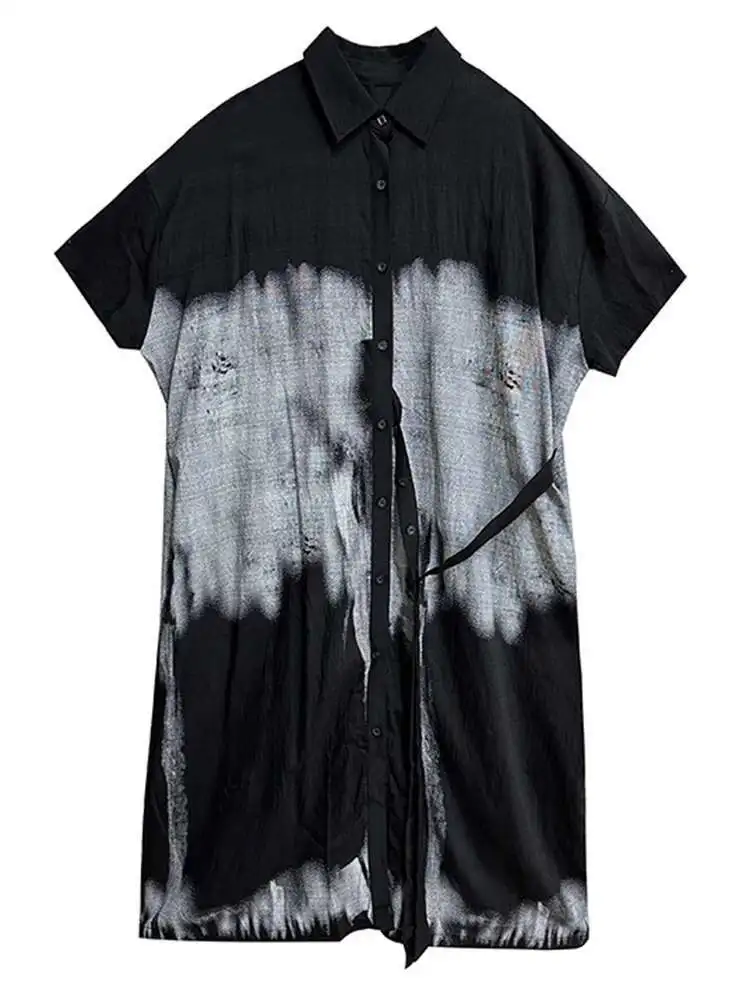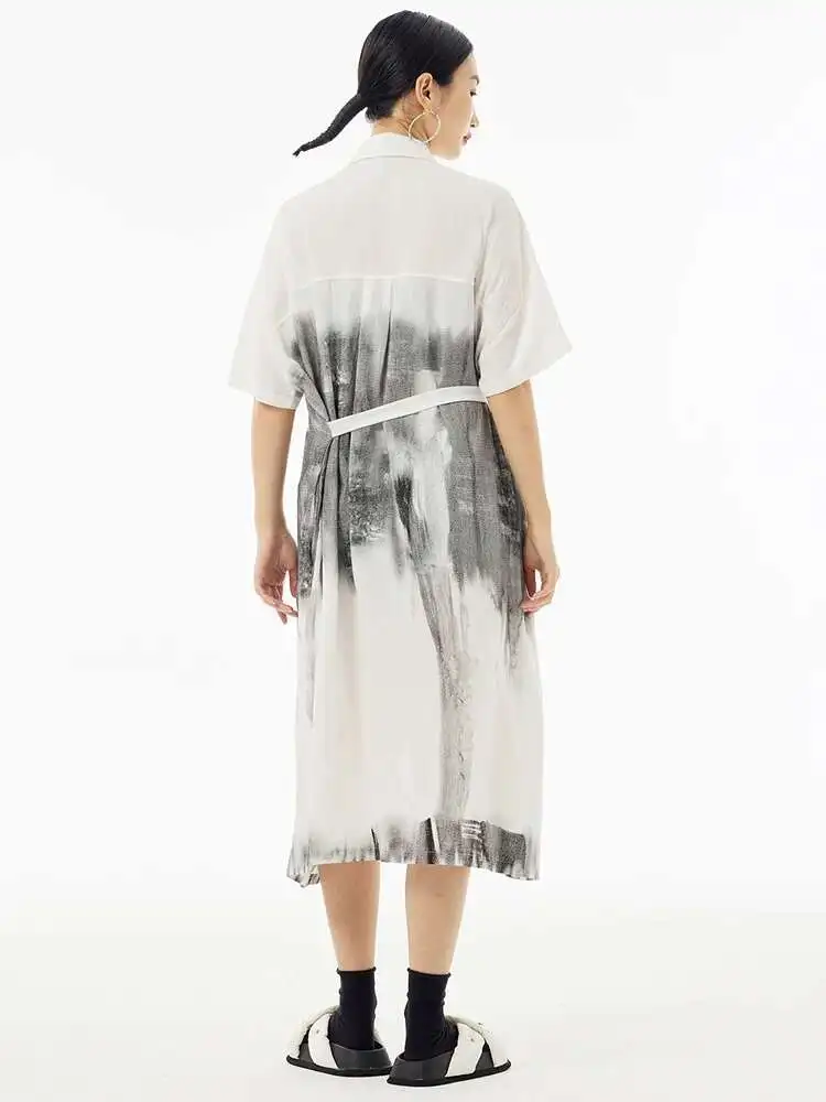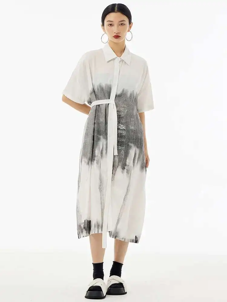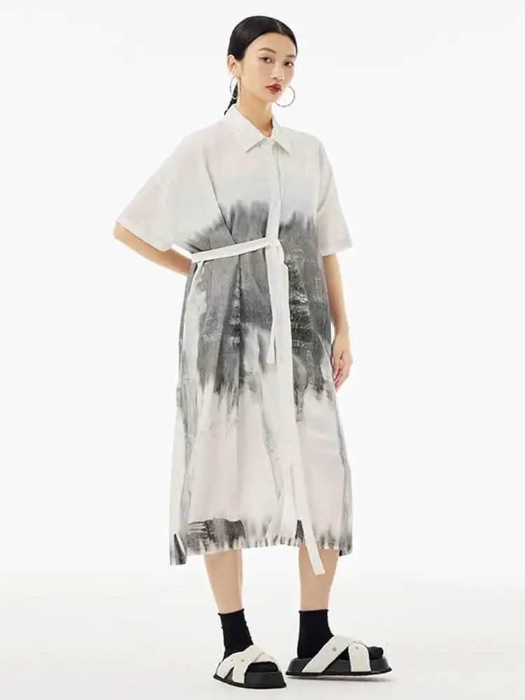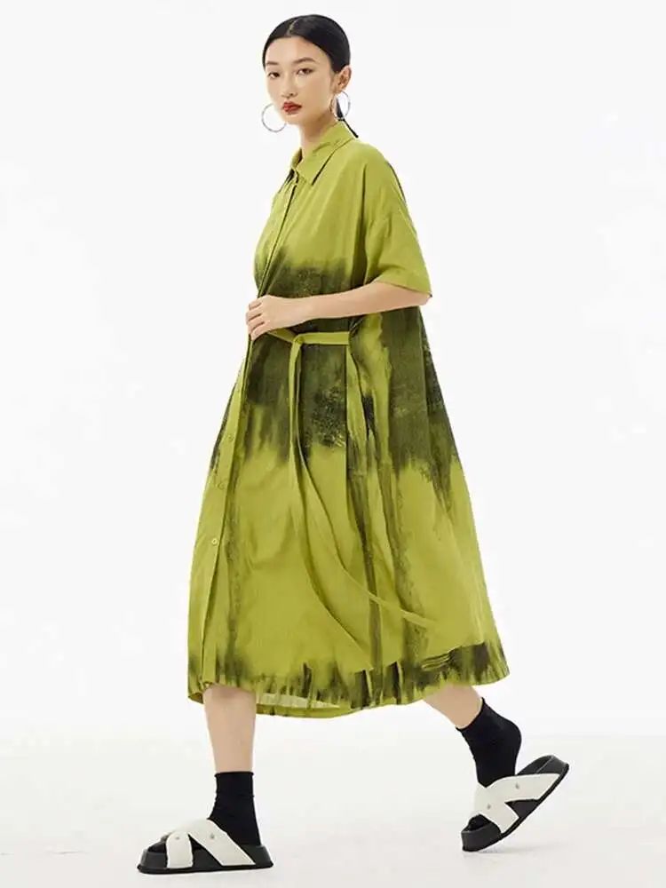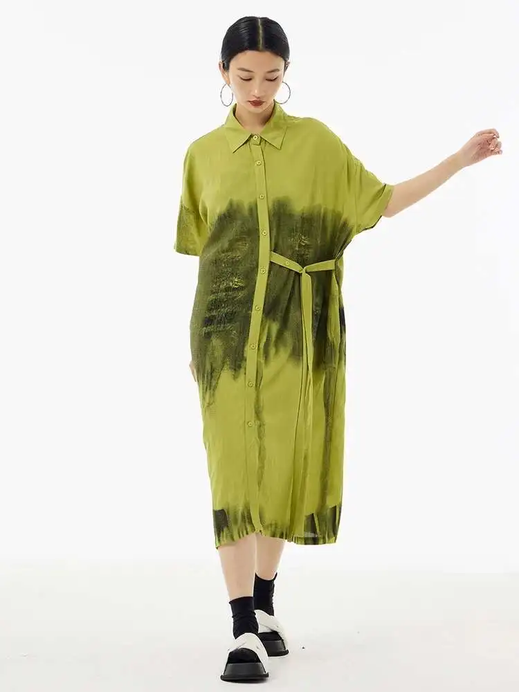 Women Green Pattern Printed Belted Big Size Shirt Dress New Lapel Short Sleeve Fashion Tide Spring Summer 2025 1DH5759