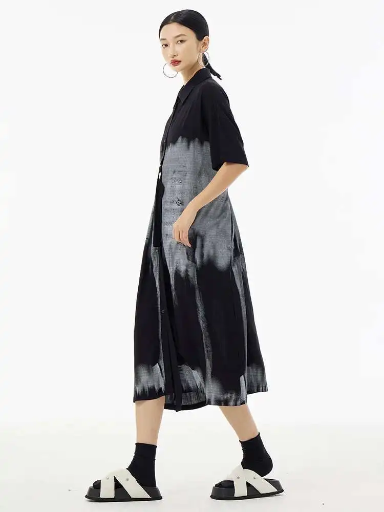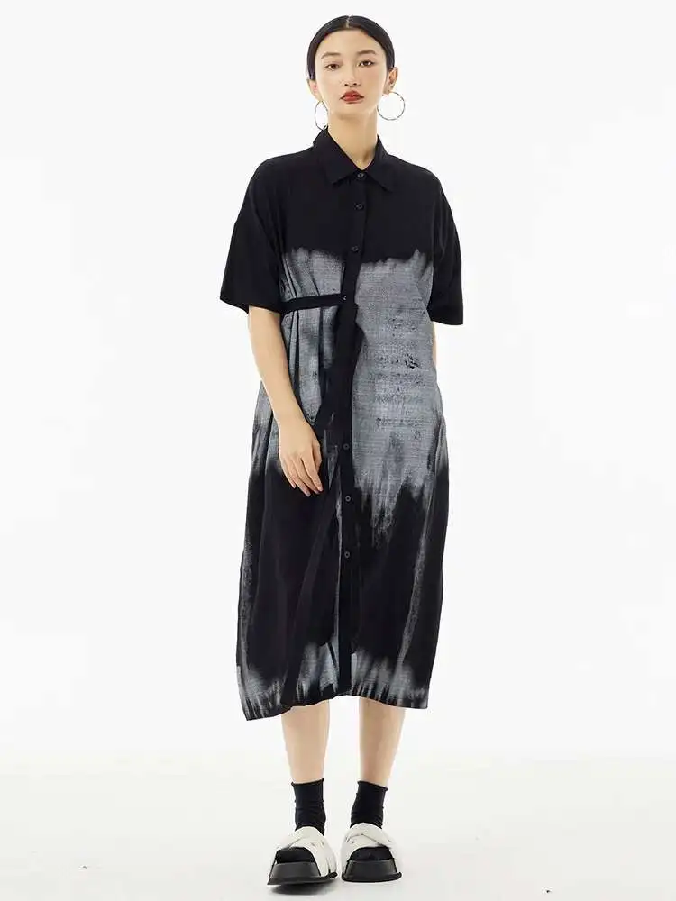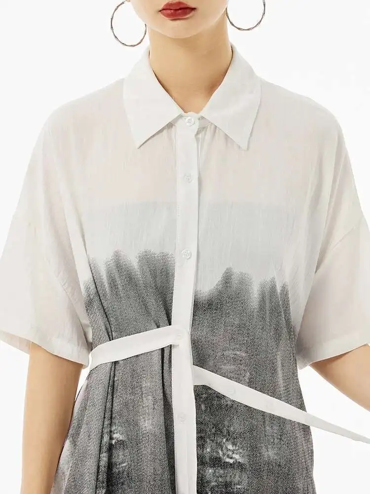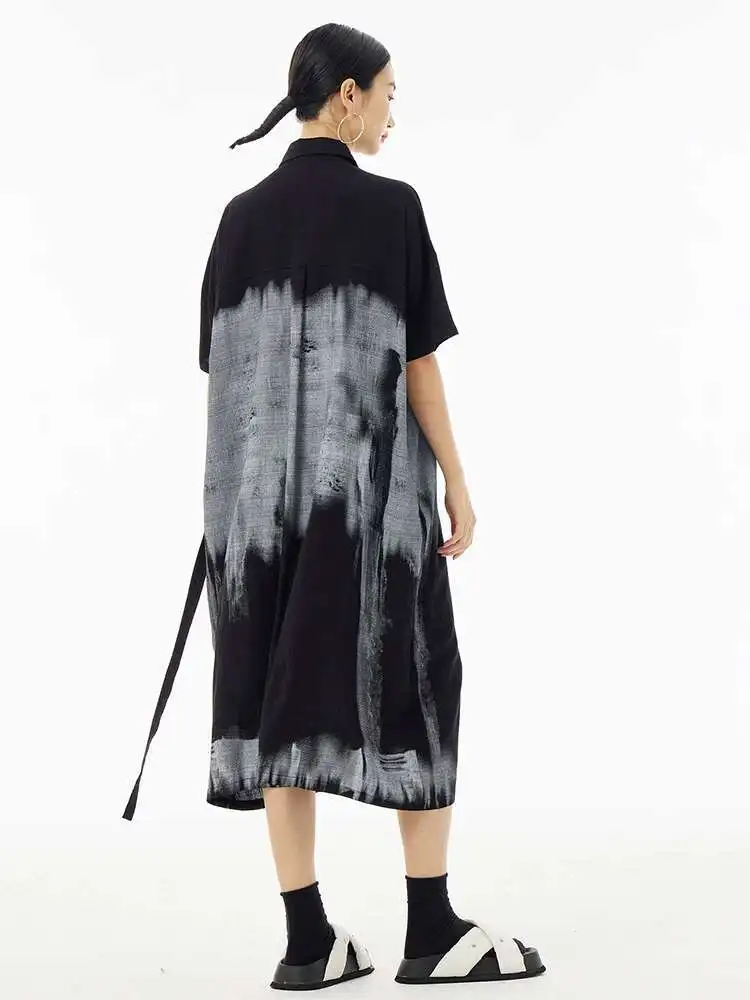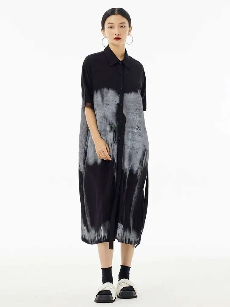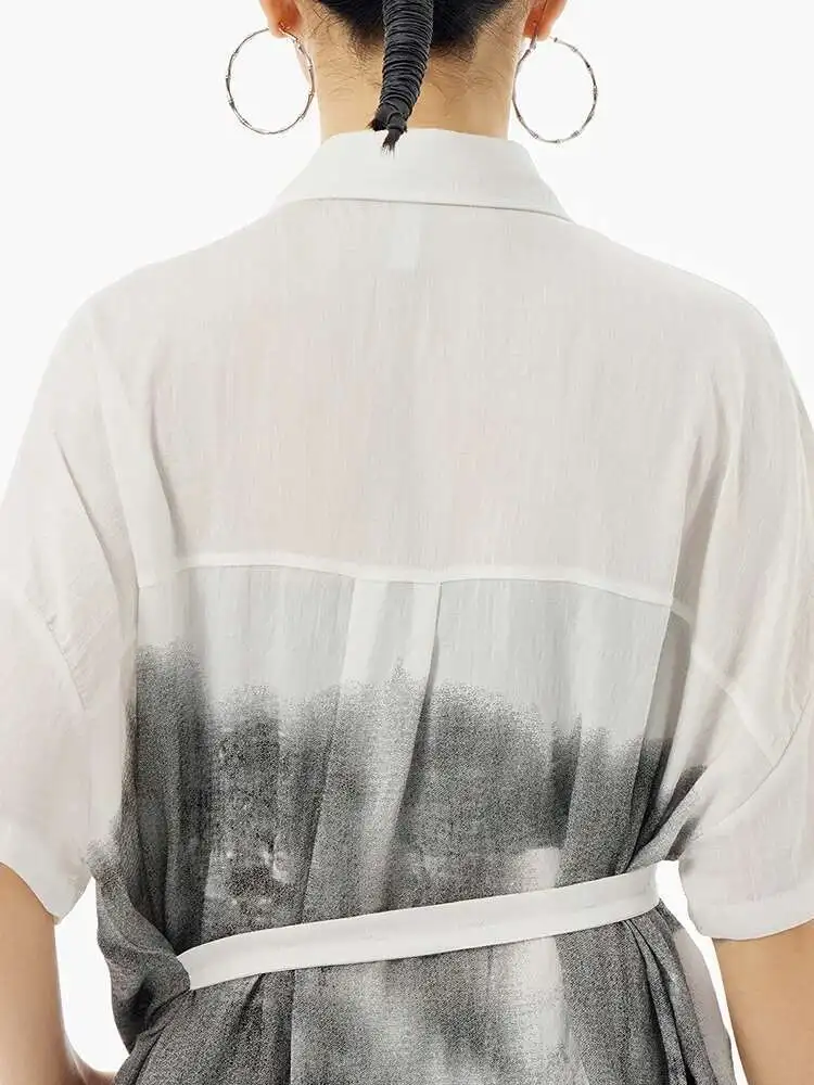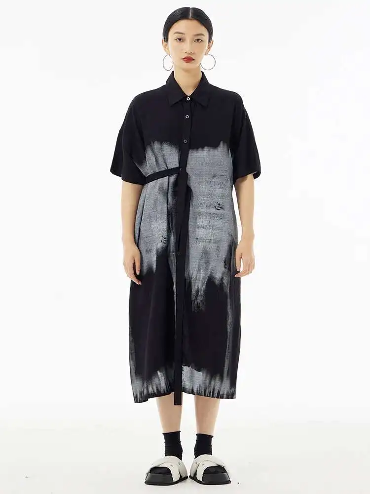Women Green Pattern Printed Belted Big Size Shirt Dress New Lapel Short Sleeve Fashion Tide Spring Summer 2025 1DH5759