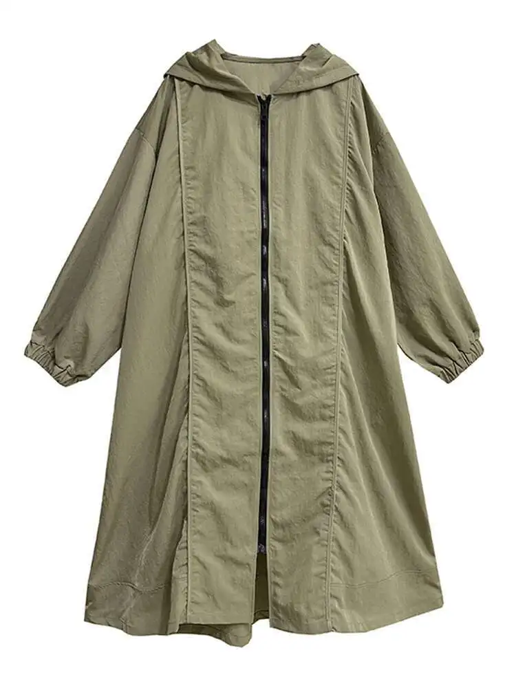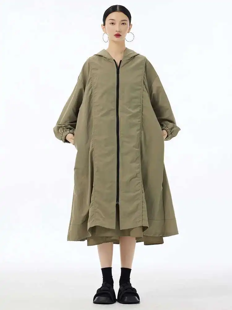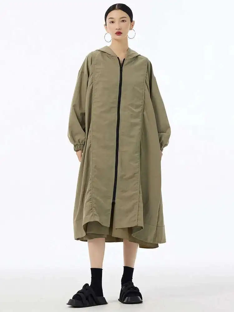 Women Green Pocket Zipper Big Size Long Trench New Hooded Long Sleeve Windbreaker Fashion Tide Spring Autumn 2025 1DH6713