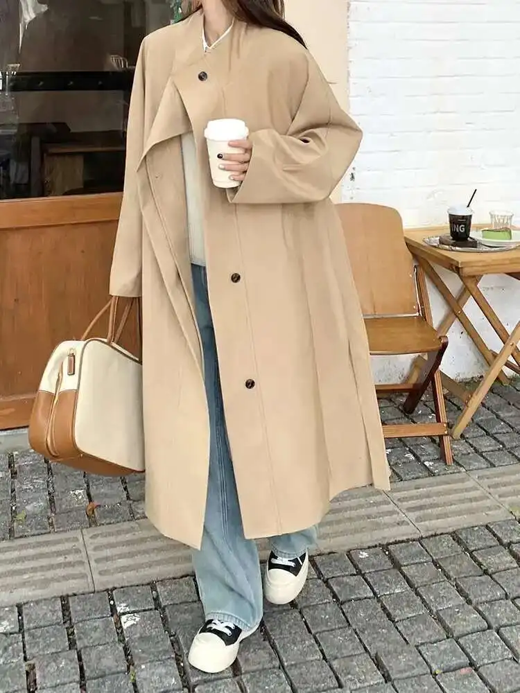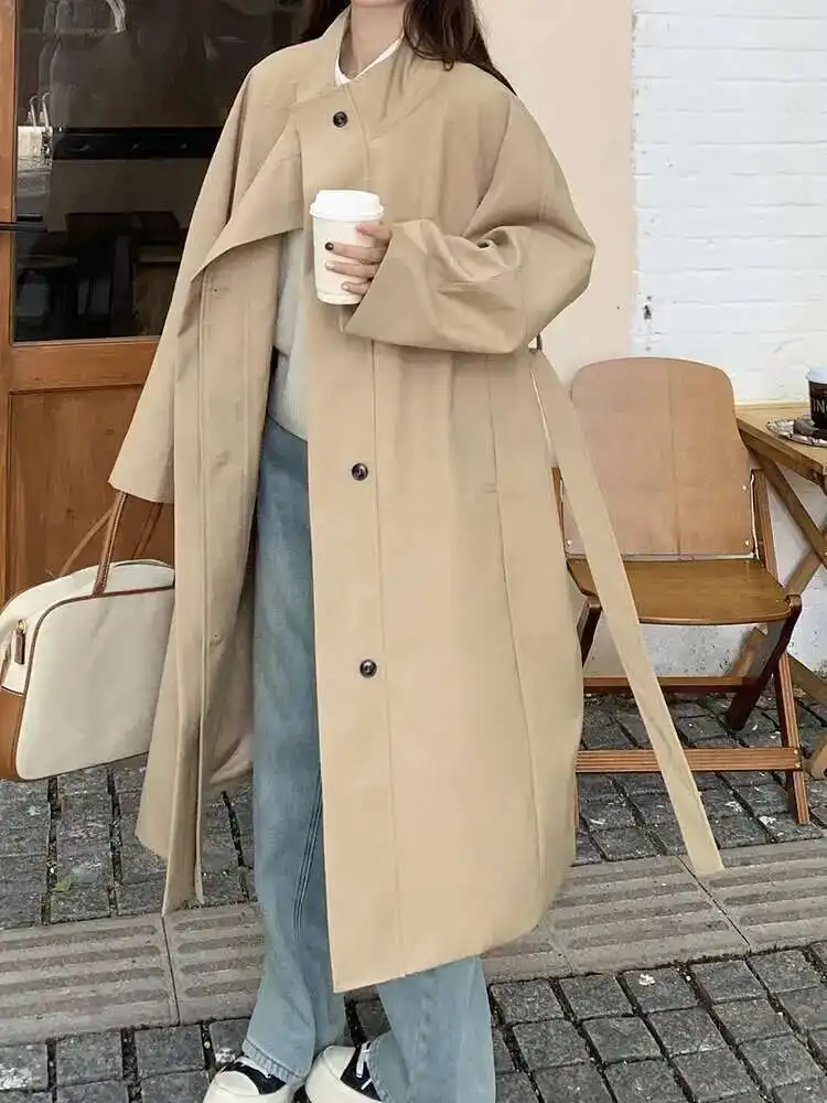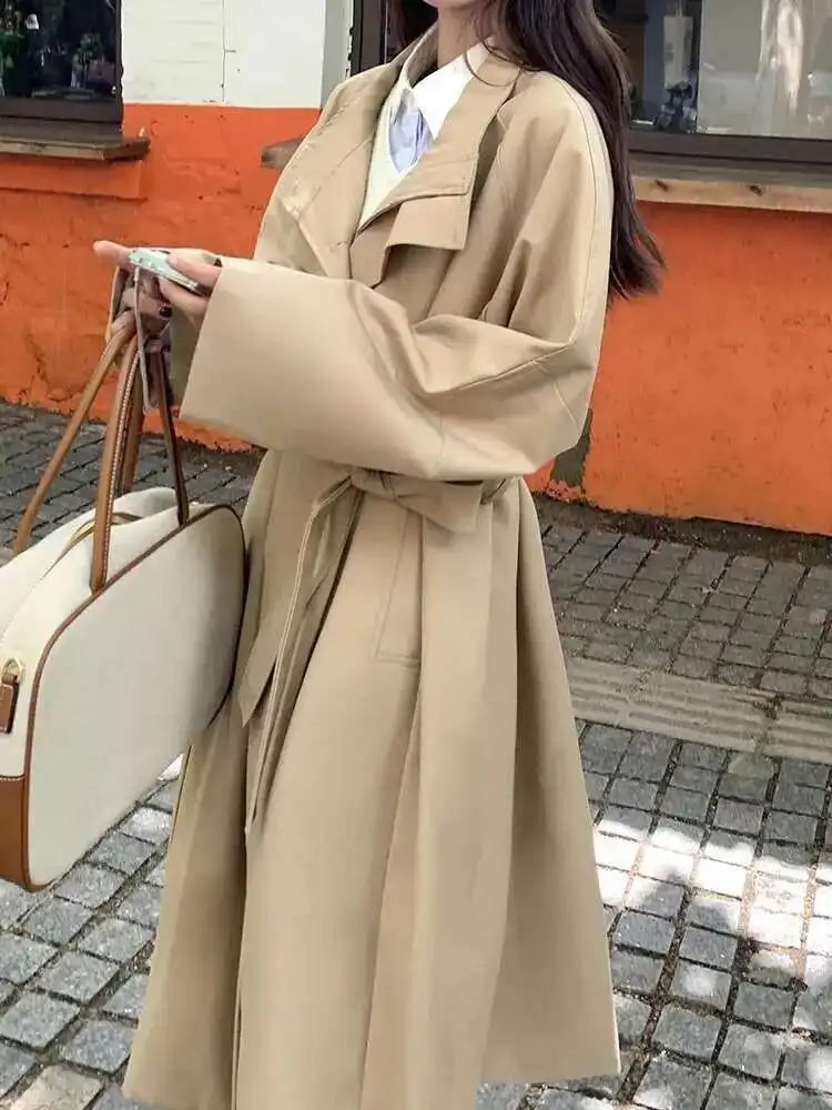 Women Khaki Double Layers Big Size Long Trench New Lapel Long Sleeve Windbreaker Fashion Tide Spring Autumn 2025 1DH9732
