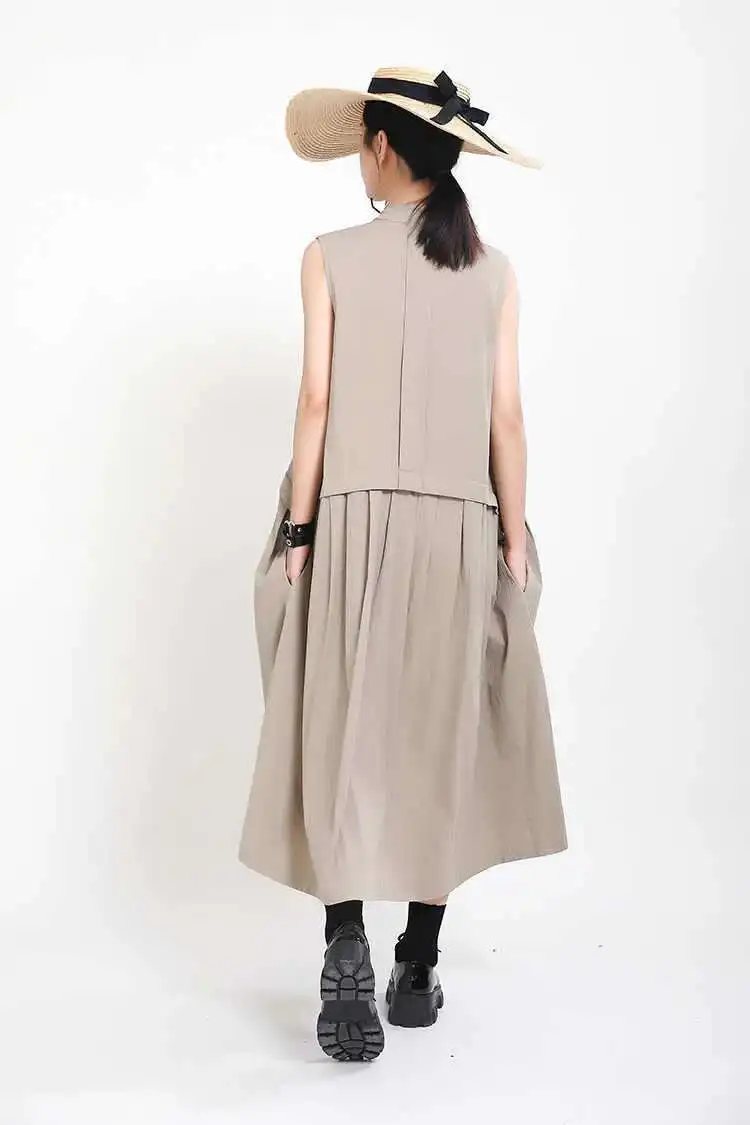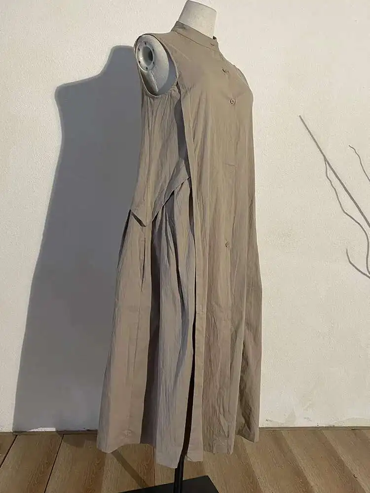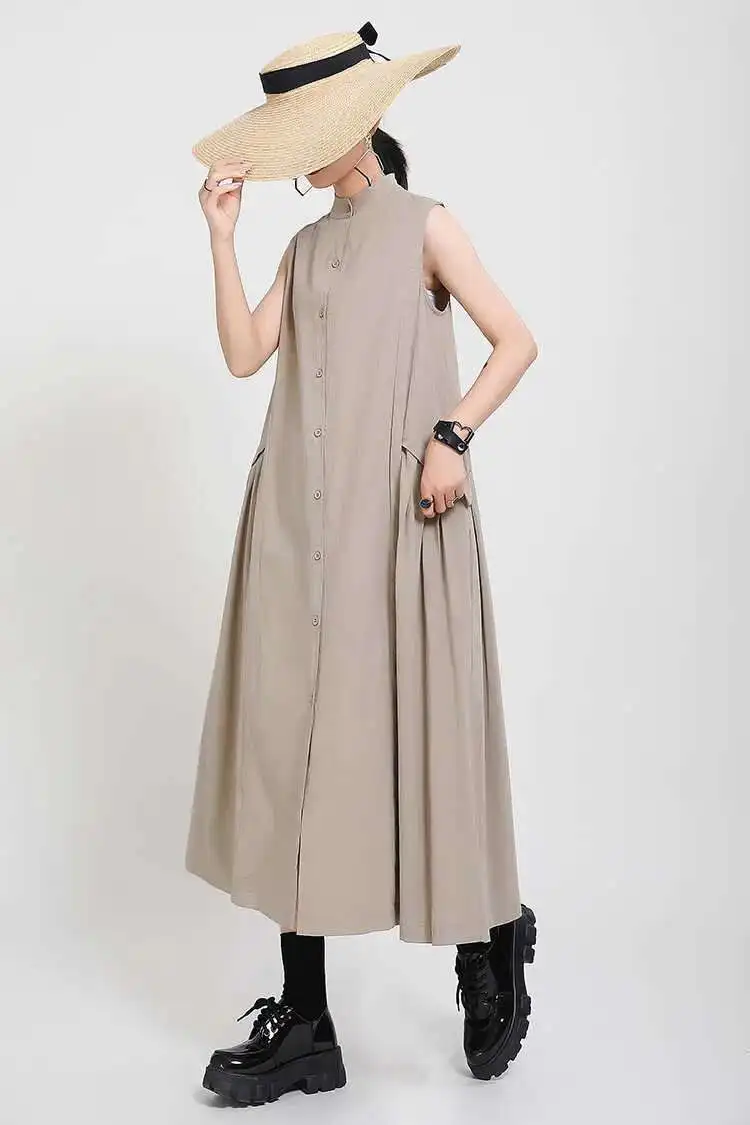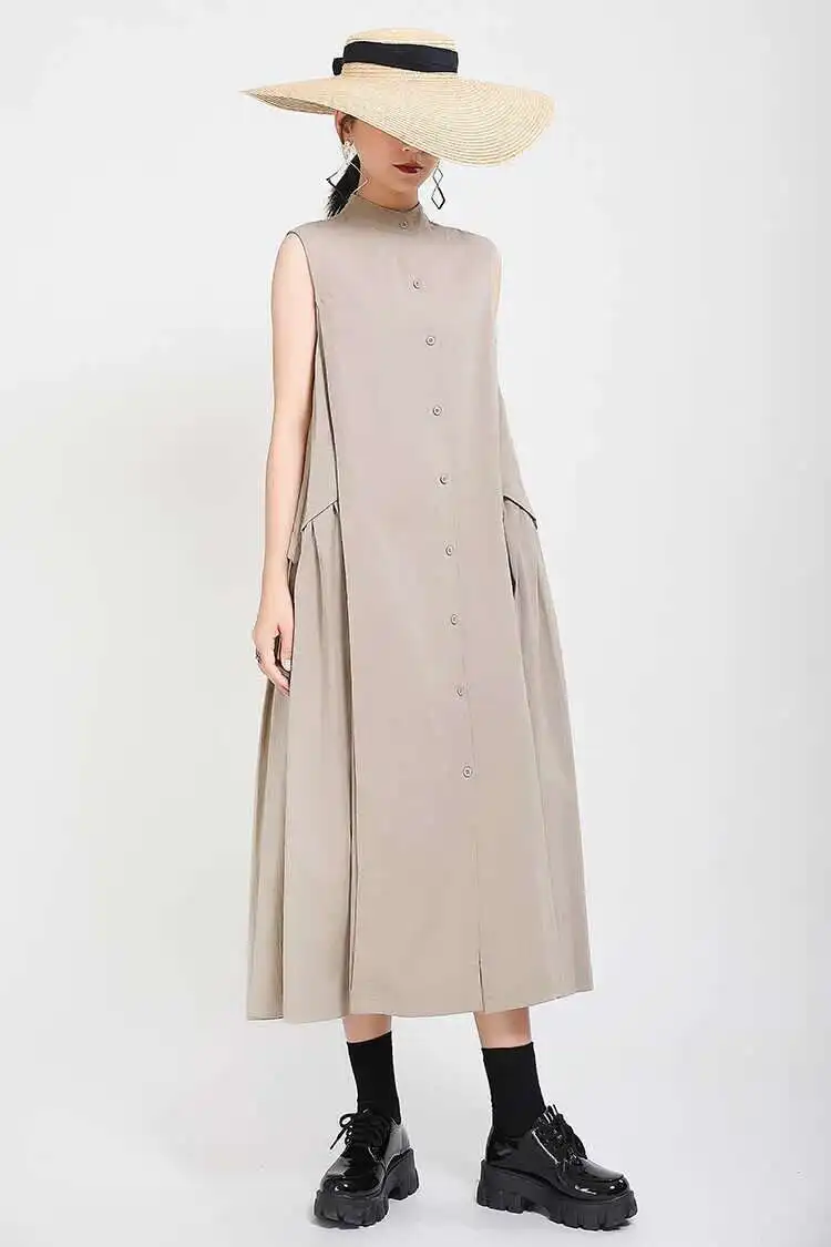Women Khaki Split Pleated Long Dress New Stand Collar Sleeveless Loose Fit Fashion Tide Spring Summer 2025 1Y353