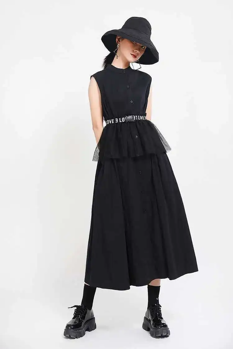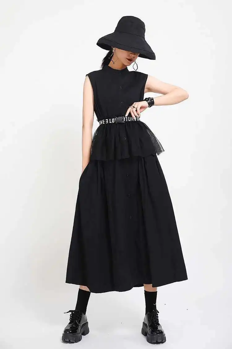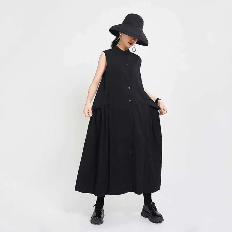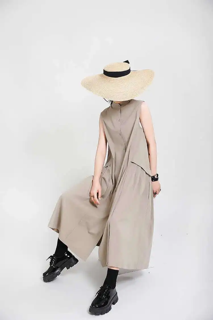 Women Khaki Split Pleated Long Dress New Stand Collar Sleeveless Loose Fit Fashion Tide Spring Summer 2025 1Y353