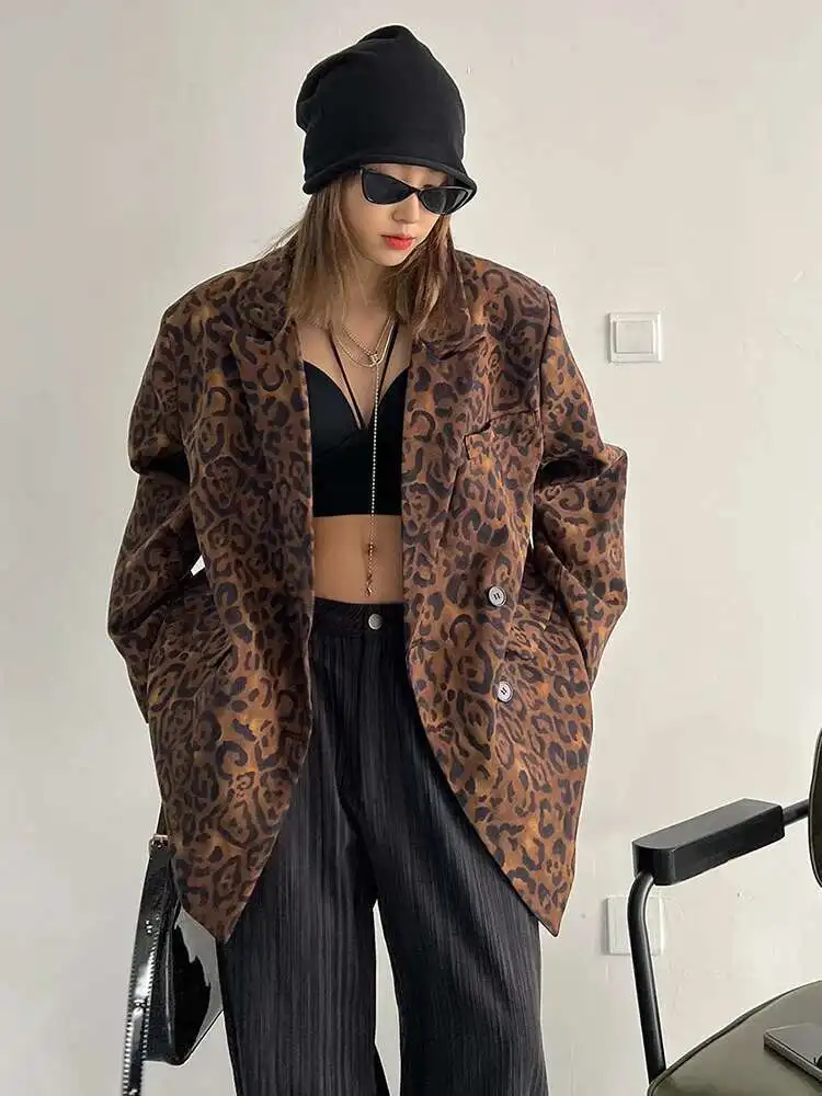 Women Leopard Print Big Size Casual Blazer New Lapel Long Sleeve Loose Fit Jacket Fashion Tide Spring Autumn 2025 1DF2518