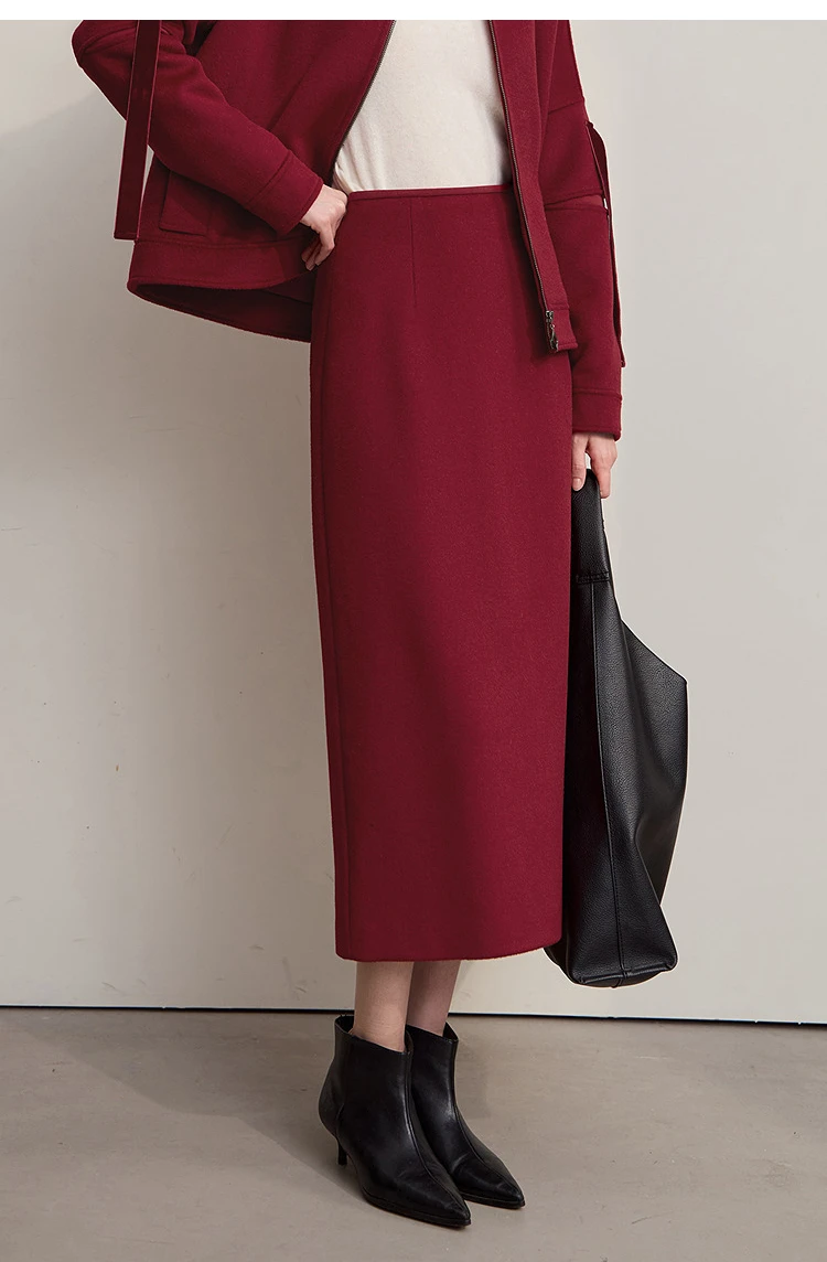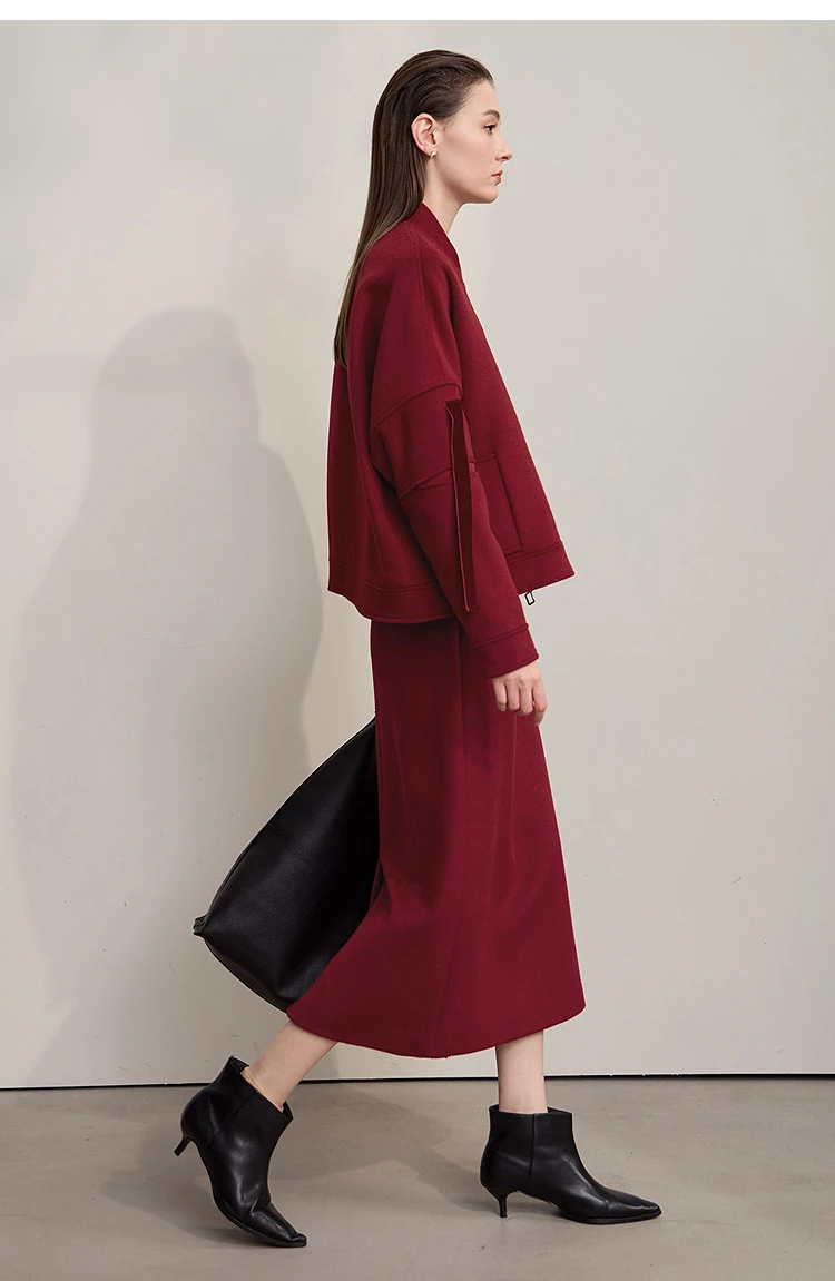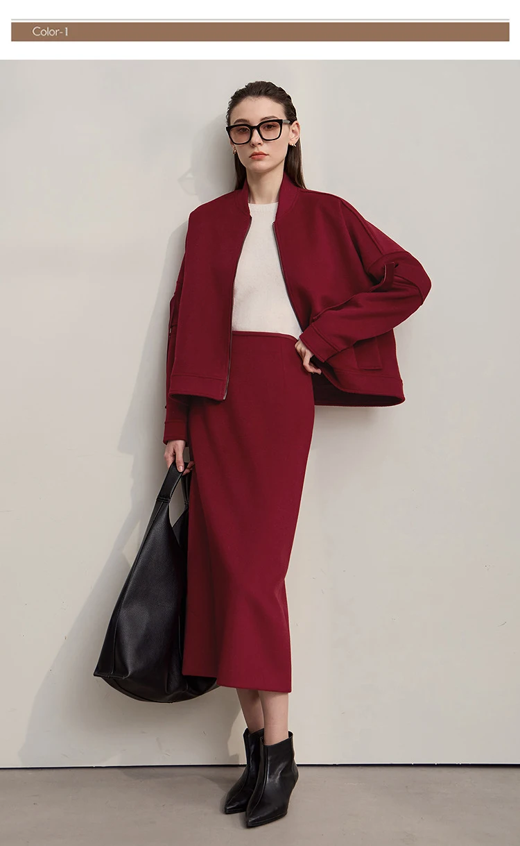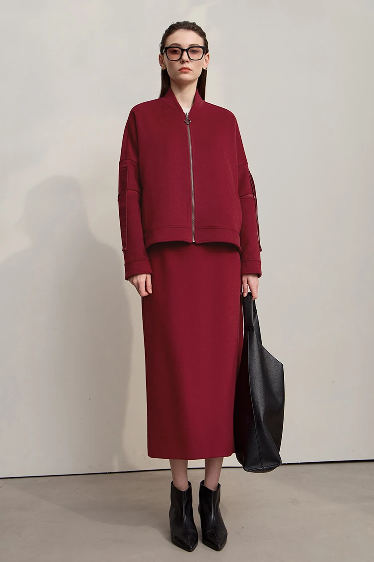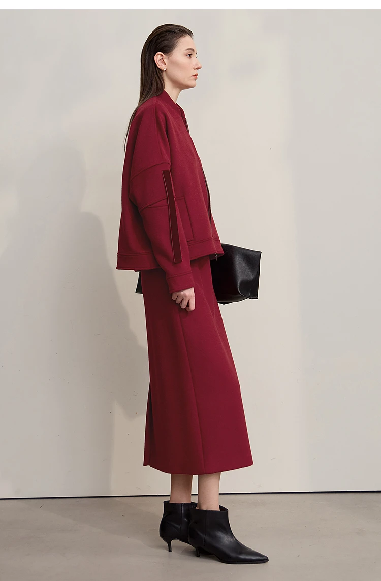 Women Midi Skirt 2025 Winter Minimalist Loose Zipper Versatile Long Sleeves Red Jacket A-Line Long Skirt Separate 12524022