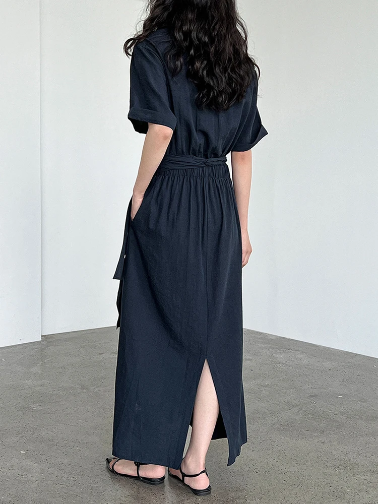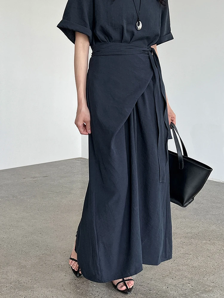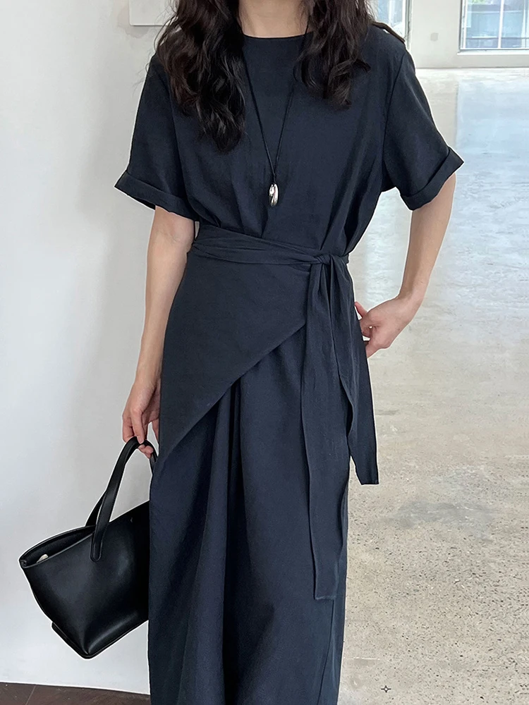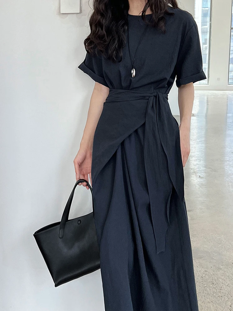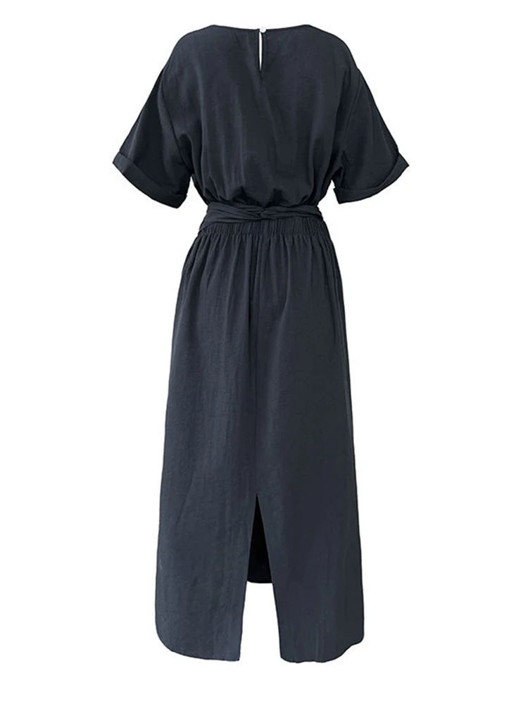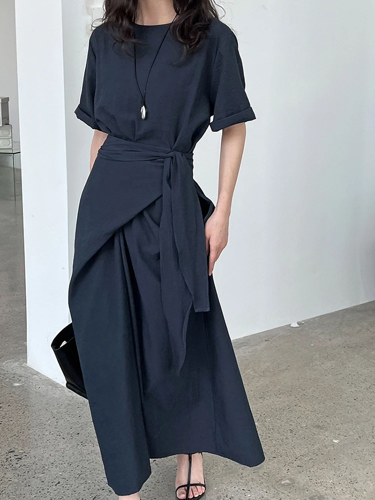 Women Navy Blue Cross Bandage Big Size Elegant Midi Dress New Round Neck Short Sleeve Fashion Spring Summer 2025 1DJ1359