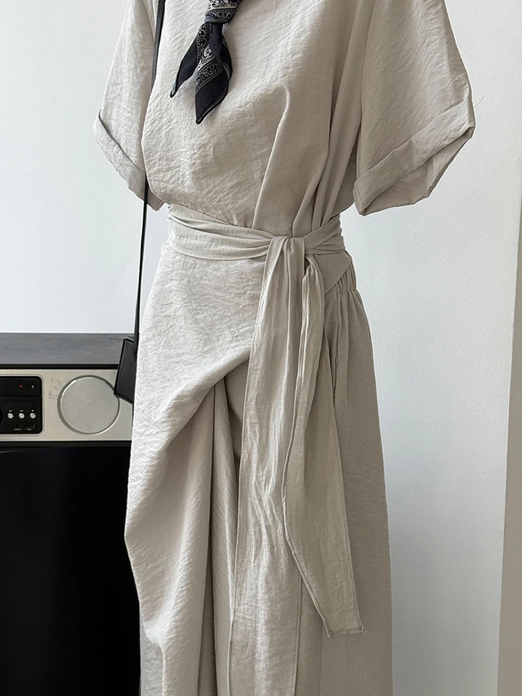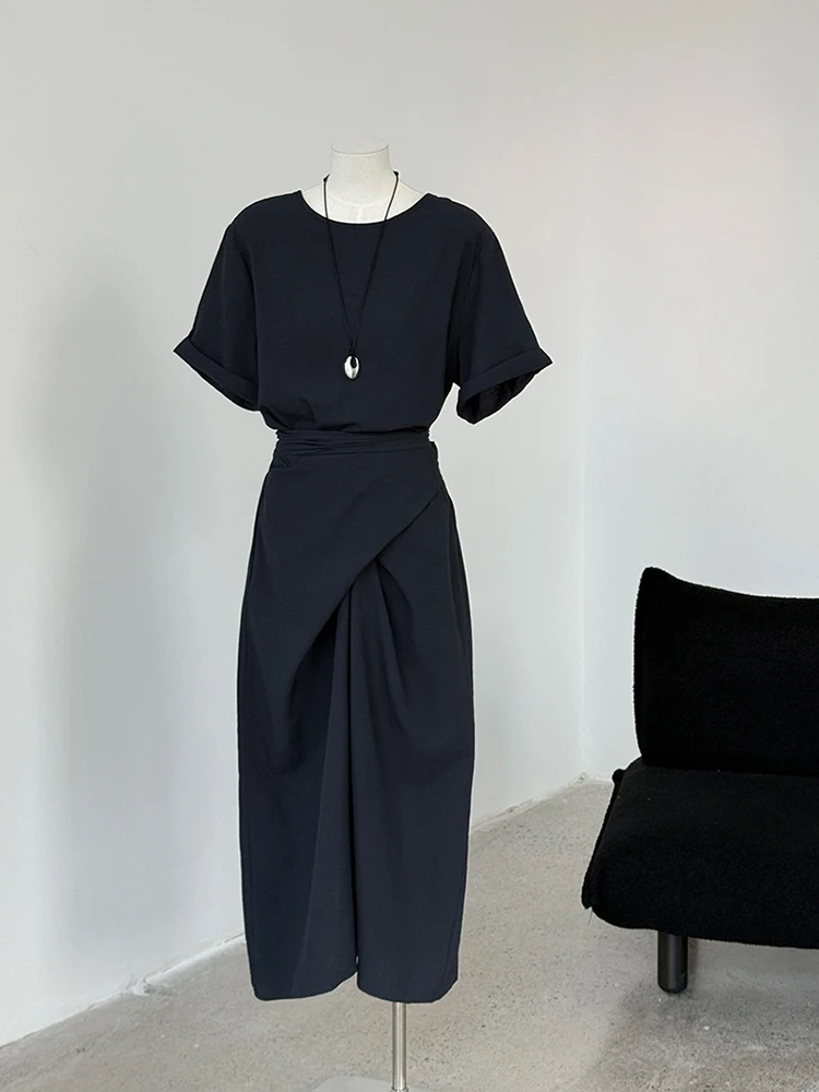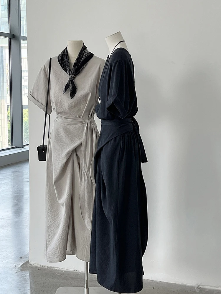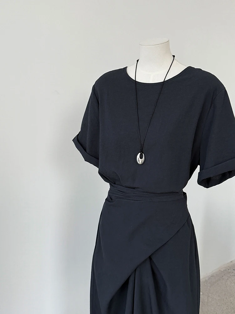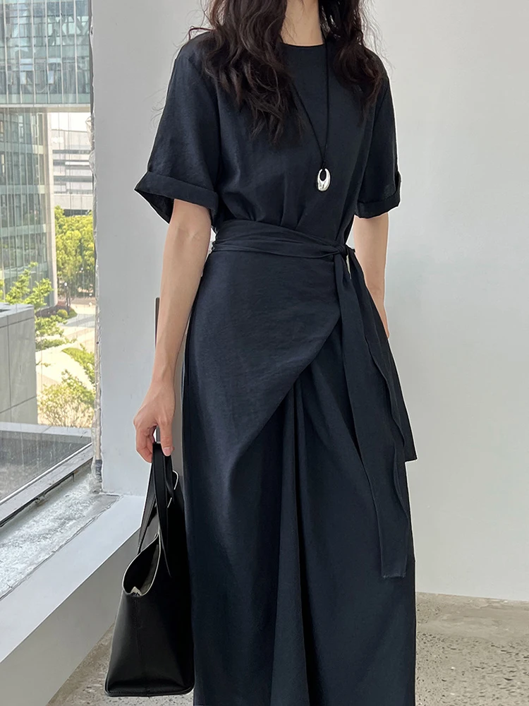 Women Navy Blue Cross Bandage Big Size Elegant Midi Dress New Round Neck Short Sleeve Fashion Spring Summer 2025 1DJ1359