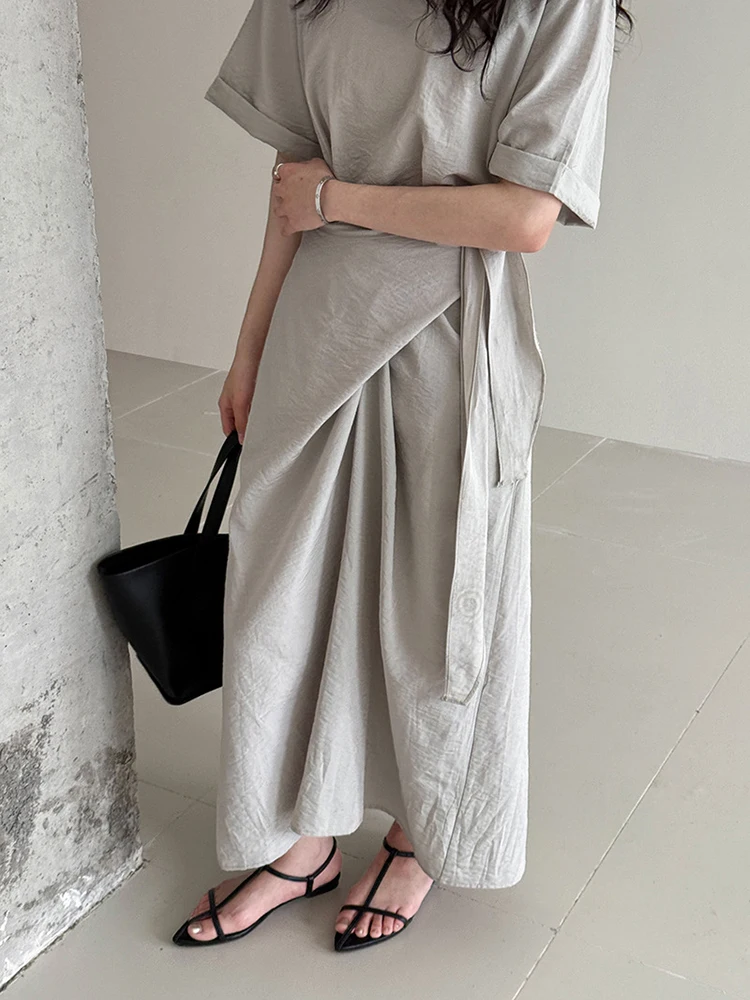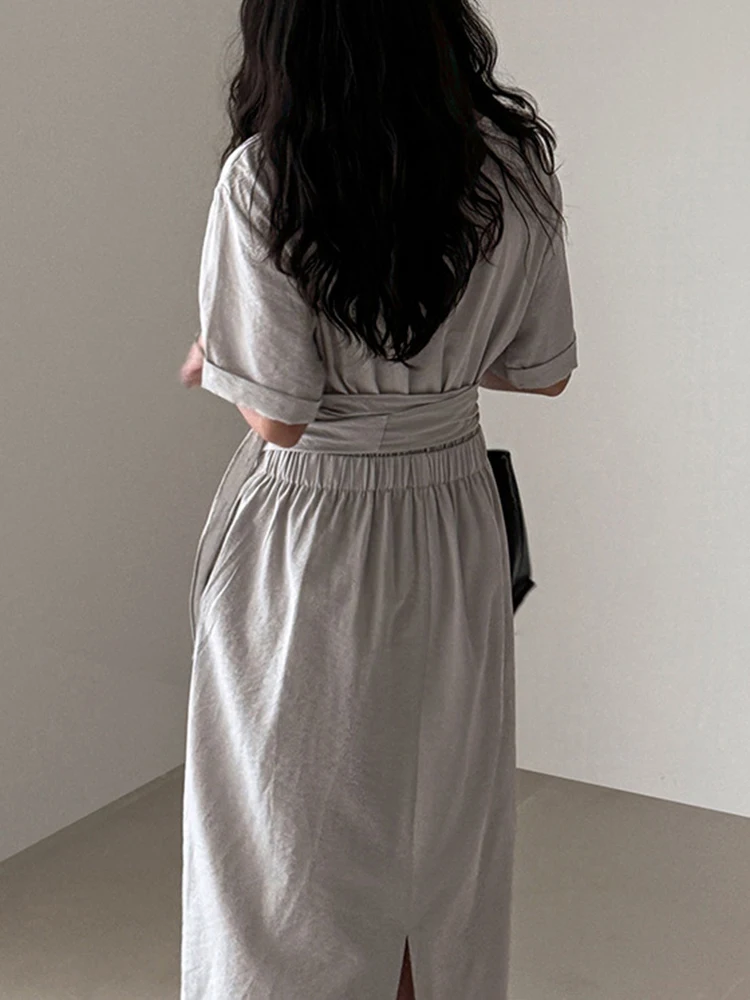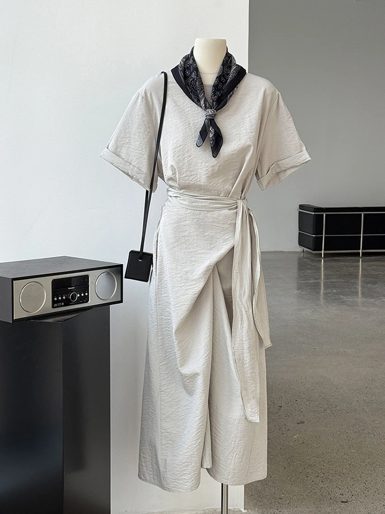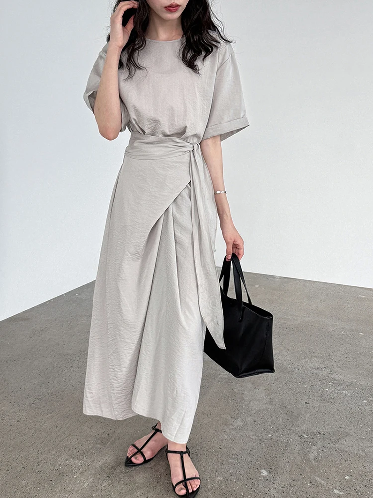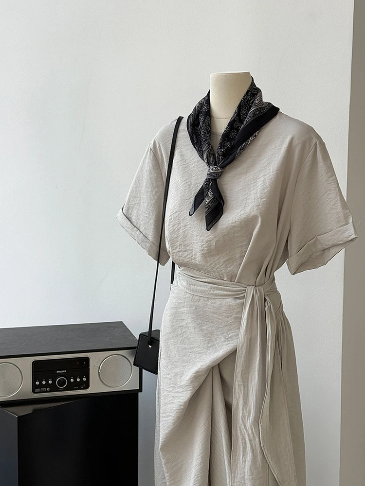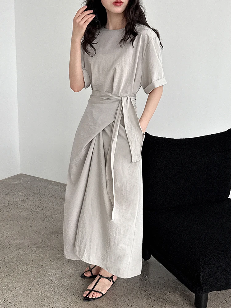 Women Navy Blue Cross Bandage Big Size Elegant Midi Dress New Round Neck Short Sleeve Fashion Spring Summer 2025 1DJ1359