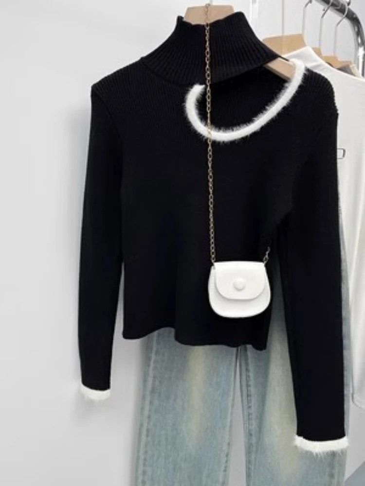 Women Sexy Hollow Out Crop Sweater Grunge Patchwork Streetwear Vintage Knitted Jumpers Y2k Aesthetic Half High Collar Pullovers